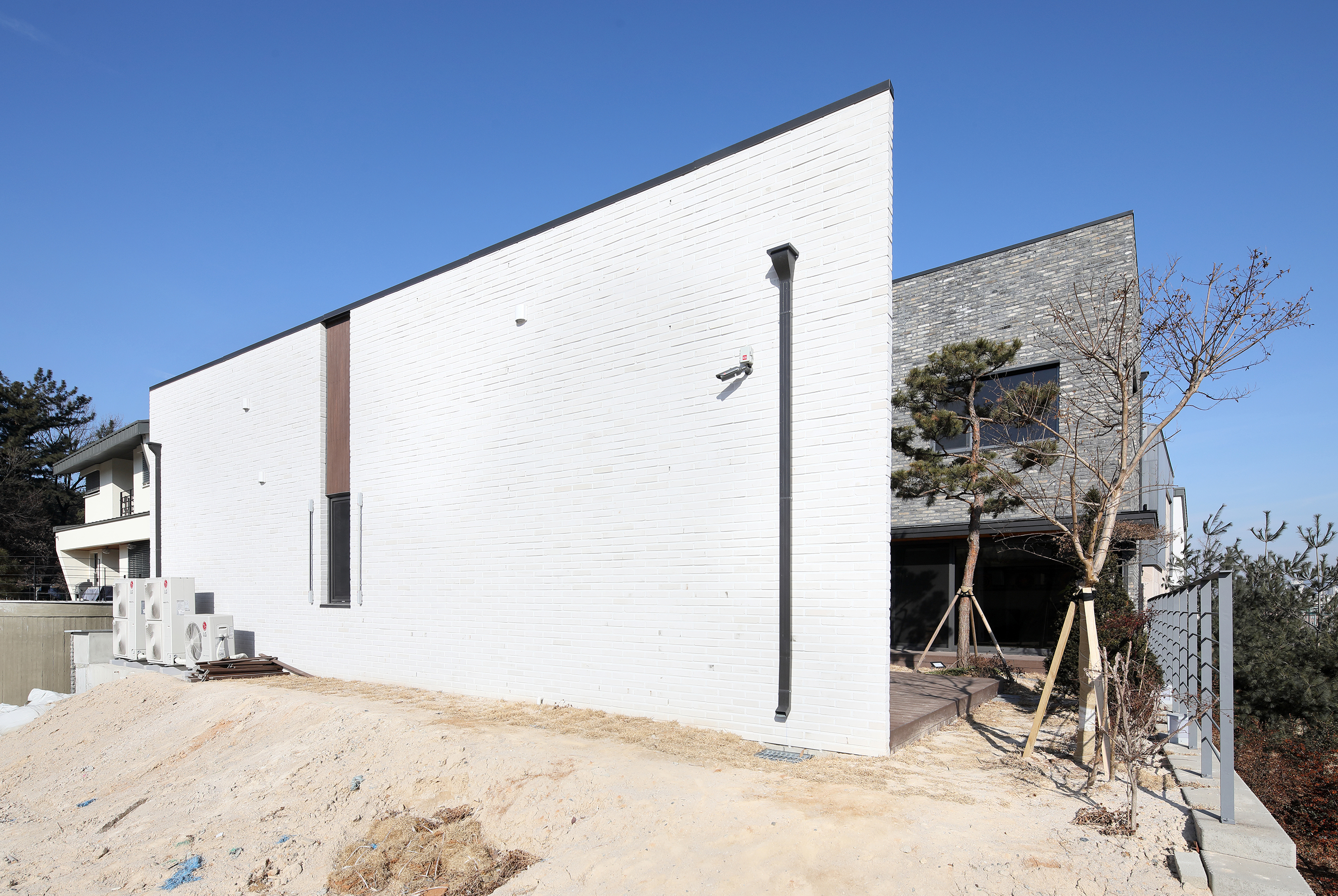 외장 재료는 유지관리가 편하며 건물의 형태에 잘 어울리도록 청고벽돌과 백고벽돌을 이용했 다. 본채는 거실과 주방, 2층의 방이 있으며, 별채는 부부가 사용하는 안방과 드레스룸으로 이 루어져 있다. 모든 실에 큰 창문을 배치해 공원의 사계절의 풍경을 감상할 수 있다. 남쪽에 위치 한 별채는 단층으로 낮추어 중정에 빛이 충분히 들어올 수 있도록 고려했다. 2층 복도의 가로로 긴 창에서 보이는 계룡산 설경은 멋진 장관을 연출한다.