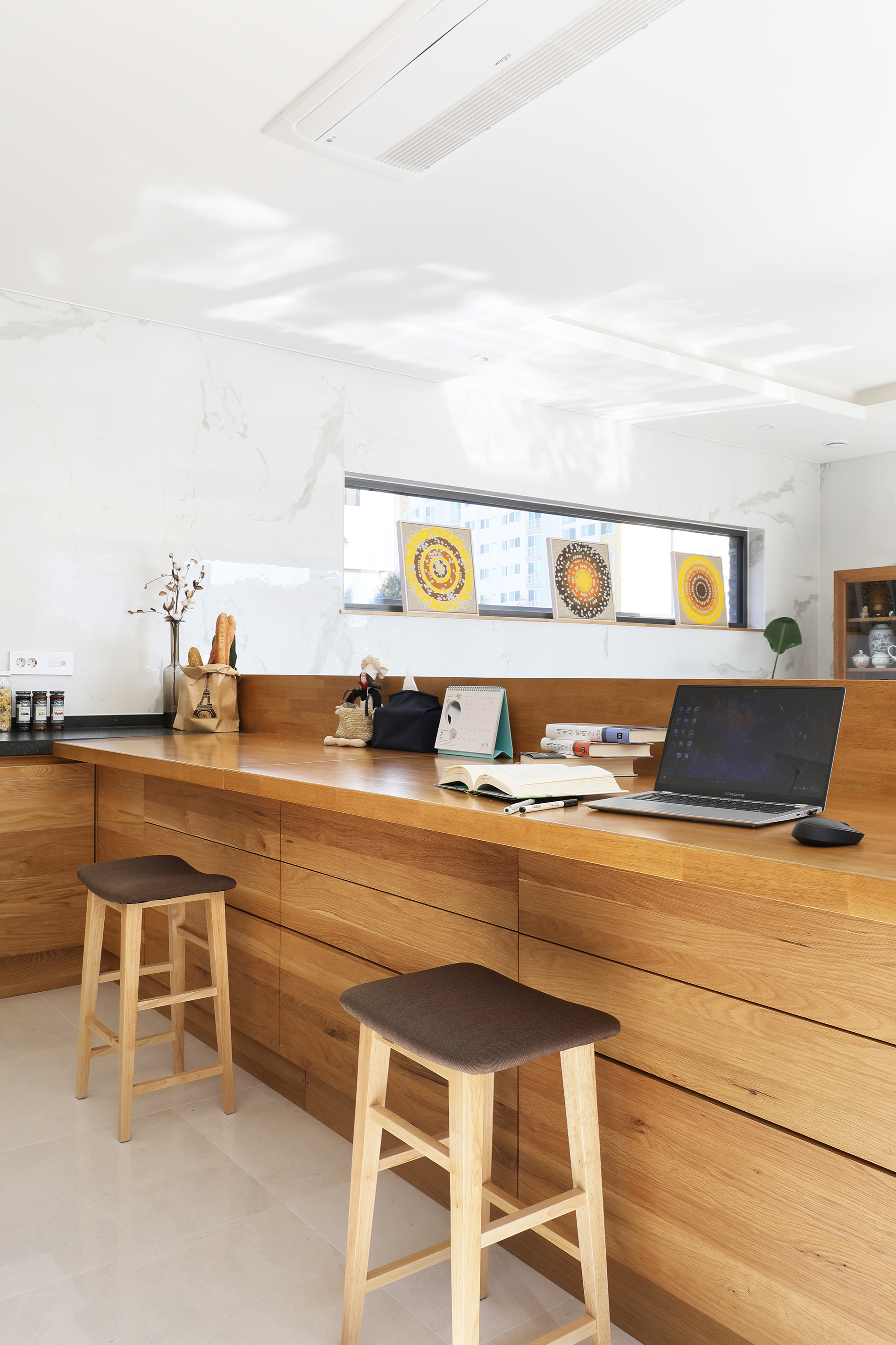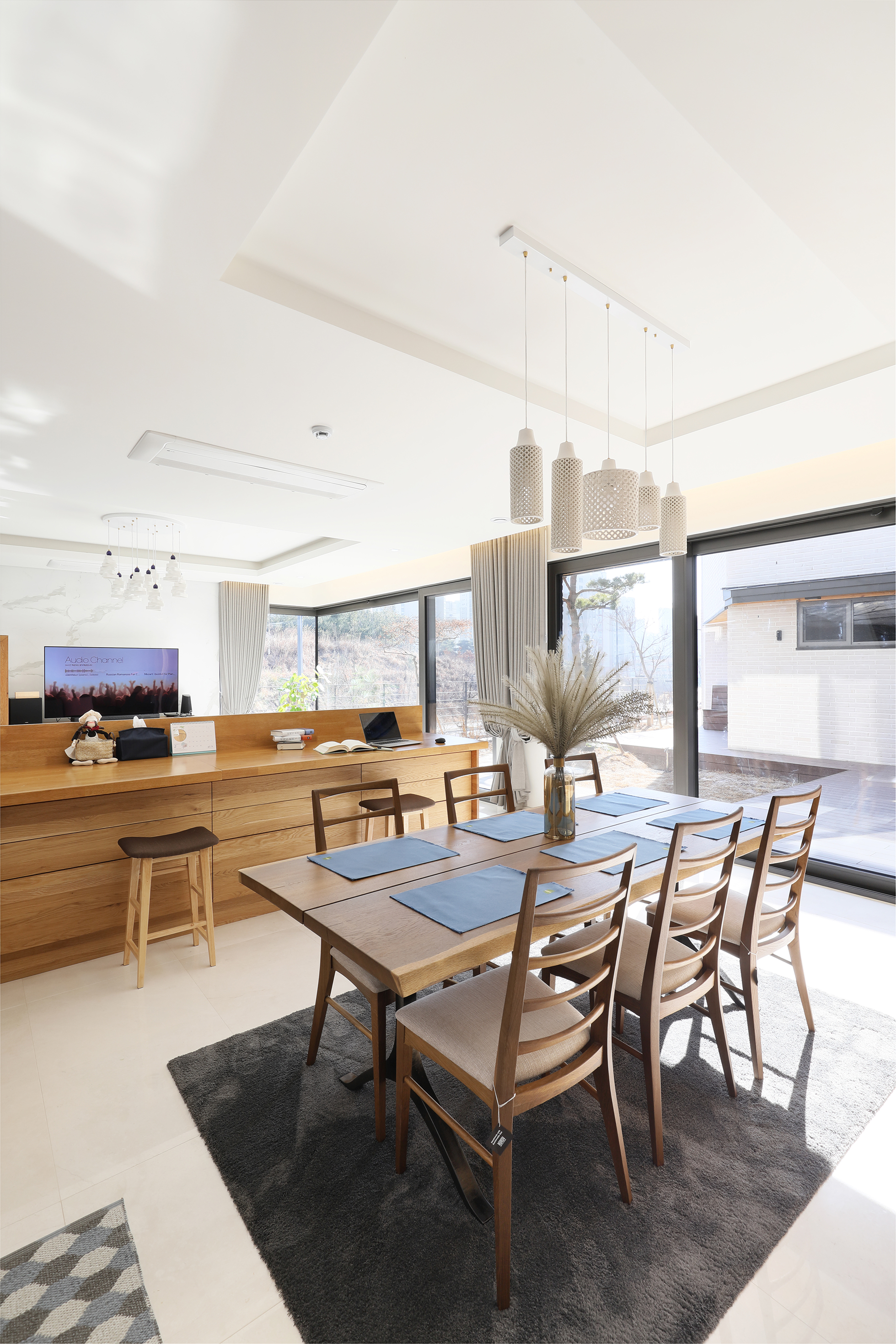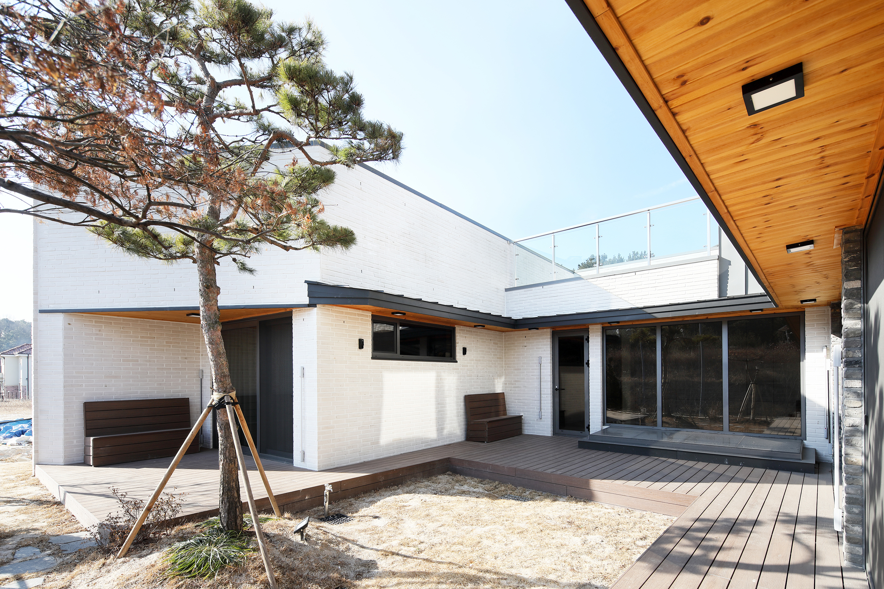 Exterior materials wer e vintage blue and whit e bricks for easy maintenance and match the shape of the building. The main house was composed of a living room, a kitchen, and a second floor room, and the annex was composed of a main room and a dressing room used b y the couple. Big windows wer e installed in all rooms t o enjo y the scenery of the four seasons seen in the park. The annex on the south side was lowered t o a single level so that enough light could enter the courtyard. The scenery of Mount Gyeryong seen from the long window on the second floor corridor creates a spectacular view.
