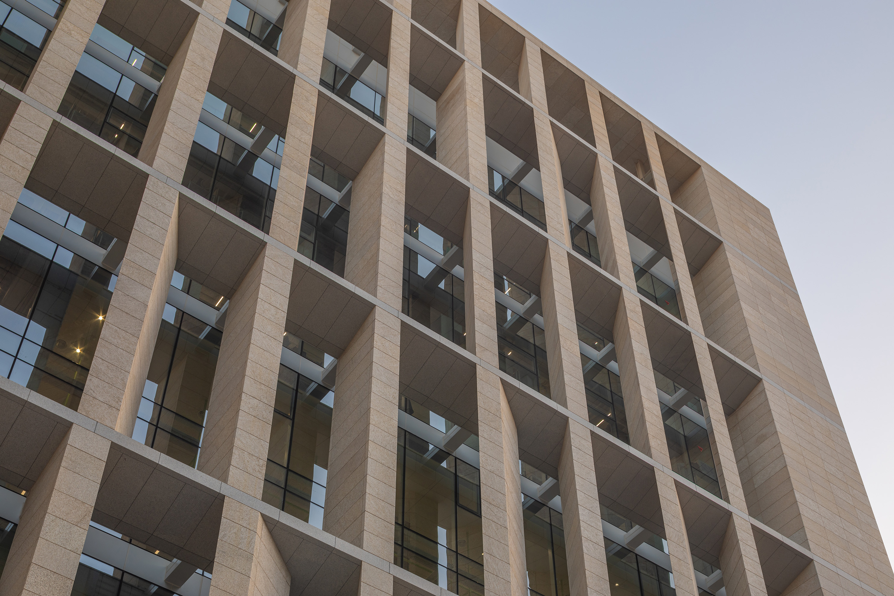 The main objective of the facade design and front courtyard plan was to reveal the presence of the building, which had previously receded, with a prominent front yard in the Start Track area. The facade was adorned with granite double skin, considering both form and fragrance, and creating a rhythmic composition through spatial grouping. This design effort aimed to maintain the context of Start Track while leaving a distinct memory. The lower floors were made as transparent as possible, allowing views of the surrounding landscaping. The front courtyard was left clean and open, transforming it into a versatile event space that facilitates natural access for not only occupants but also various characters.