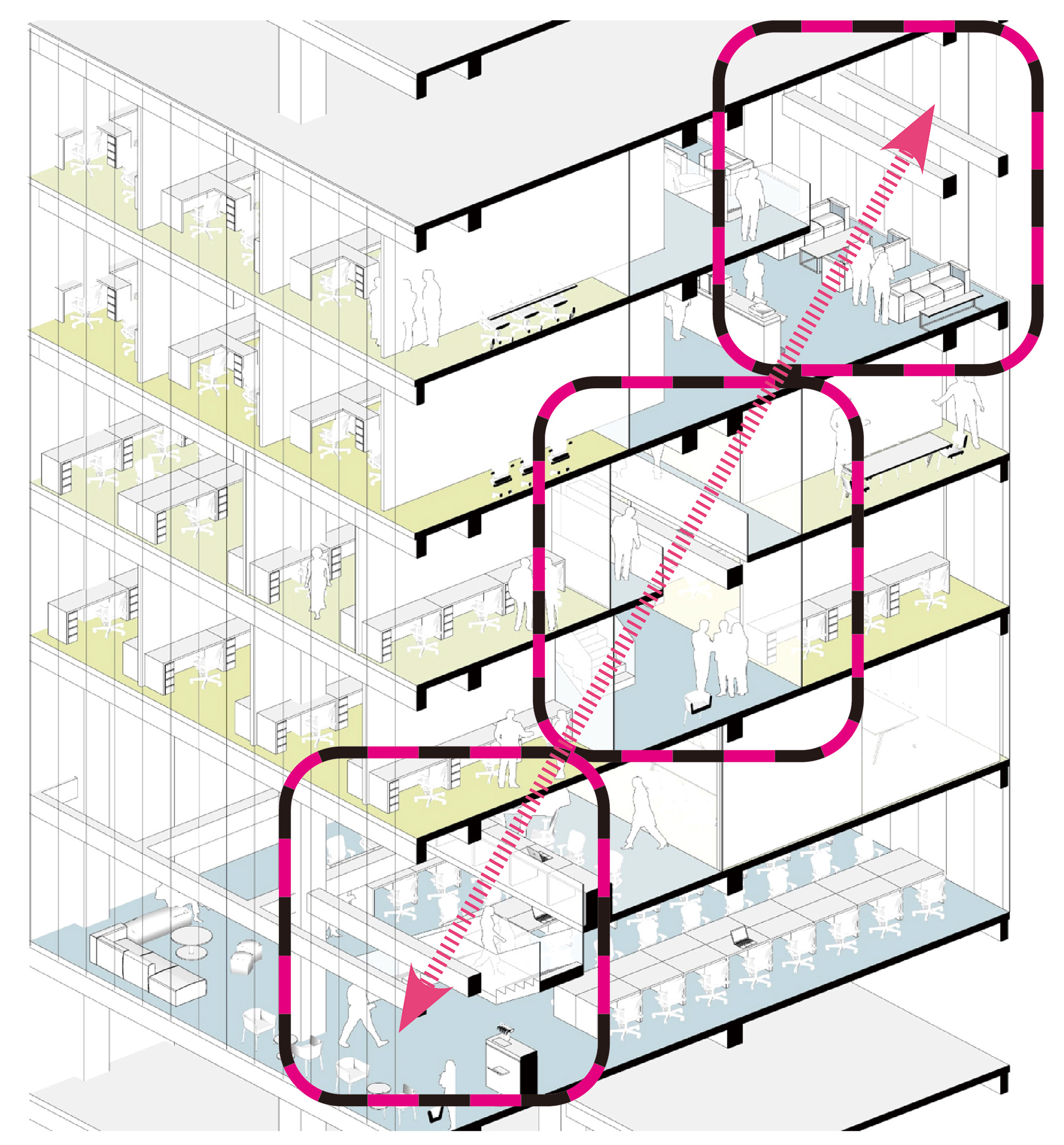 Expansion of Volume and Envelope - As the subject of remodeling, the existing building's volume cannot be altered due to limited constraints. However, to create a new working environment, the opportunity was taken to create a more open community space by puncturing the existing floor, gathering the eliminated floor area, and expanding the facade horizontally to create a new impression. Vertically, an additional floor was added to utilize the rooftop garden. As a result, the entire building underwent a transformation where space was infused, allowing for an expansion of volume, as if letting in the breeze.