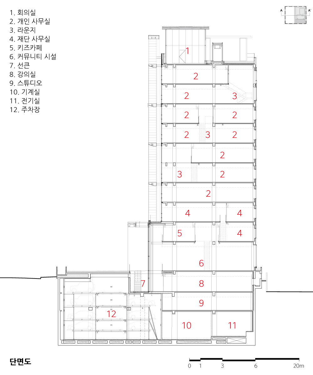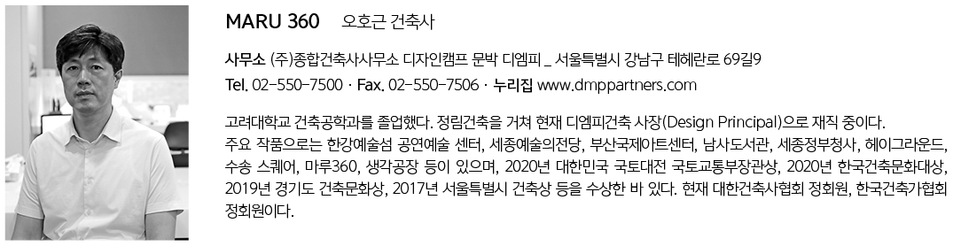 Maru 360 Architect | Oh, Ho-Keun _ designcamp moonpark dmp Client | The Asan Nanum Foundation Supervisor | designcamp moonpark dmp Construction | KCC E&C Project team | Jeon, Bongjin / Chang, Honyon / Koo, Jinmoh Location | 172, Yeoksam-ro, Gangnam-gu, Seoul, Korea Program | Office, Neighborhood facility Site area | 1,197.30㎡ Building area | 569.73㎡ Gross floor area | 6,773.32㎡ Building to land ratio | 47.58% Floor area ratio | 400.53% Building scope | B3F - 11F Structure | RC Exterior finishing | Granite stone(color granite) Interior finishing | Granite stone(color granite), Exposed concrete, Waterbased paint Design period | 10, 2019 - 12, 2020 Construction period | 02, 2020 - 09, 2021 Photograph | Yoon, Joonhwan Structural engineer | Gwanglim Structure Engineering Corp. Mechanical engineer | Jungdo enginerring Electrical engineer | Ilshin ENC(engineering & construction) Fire engineer | Namdo TEC |