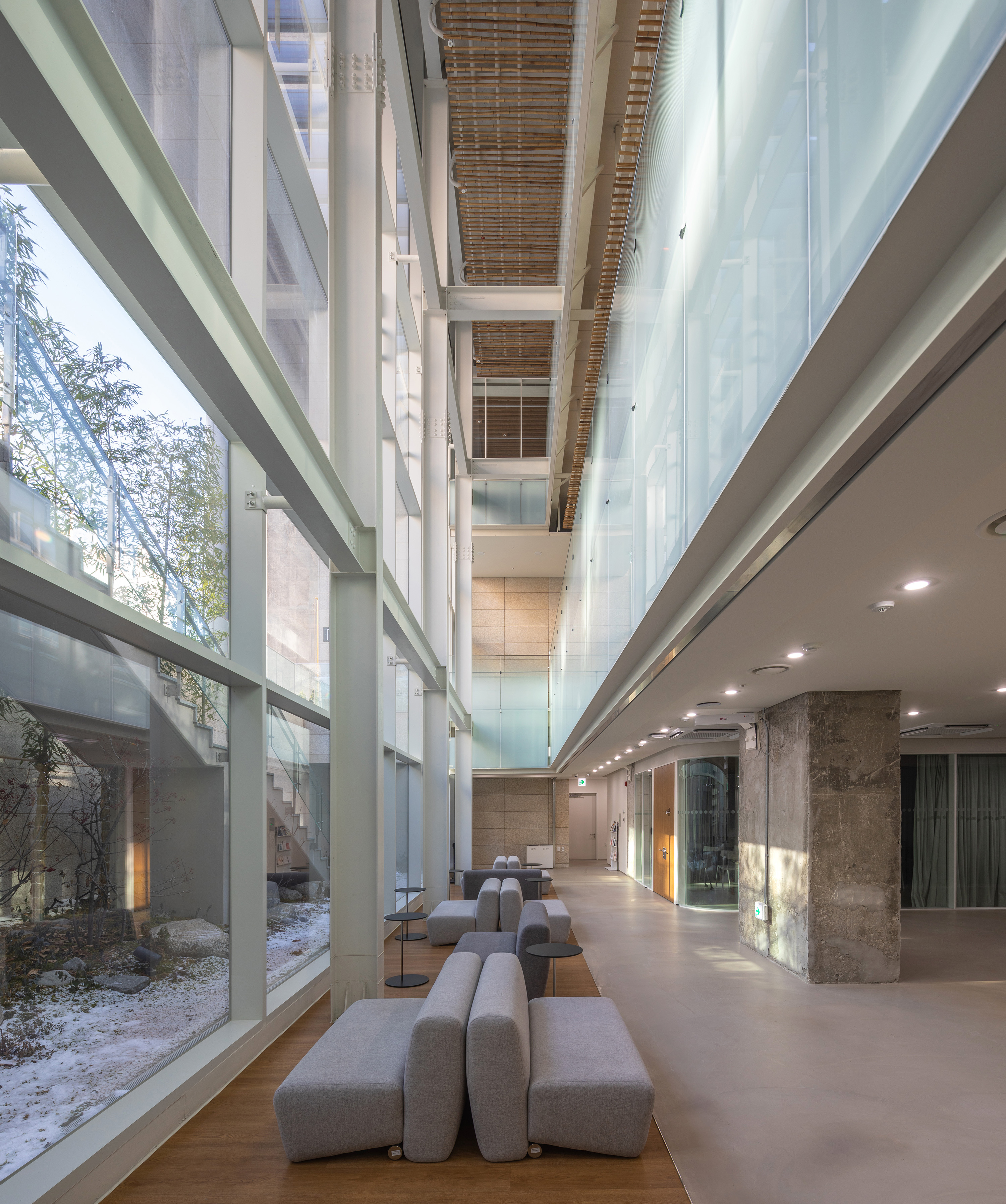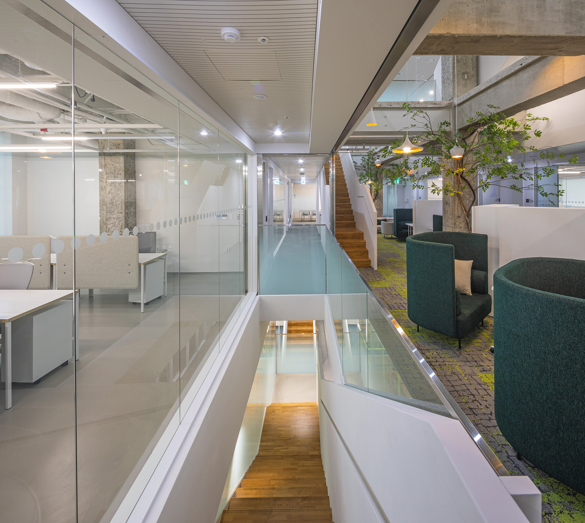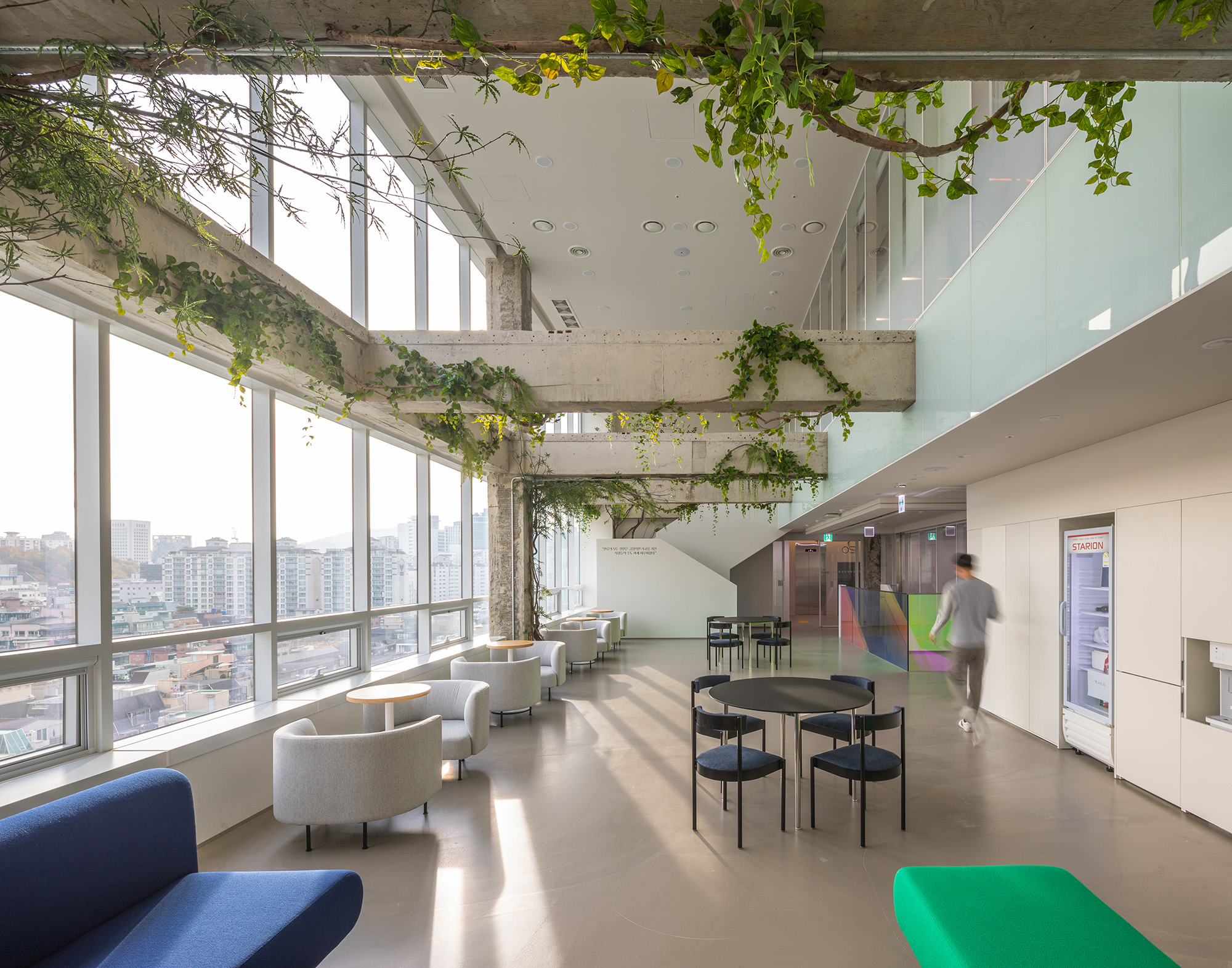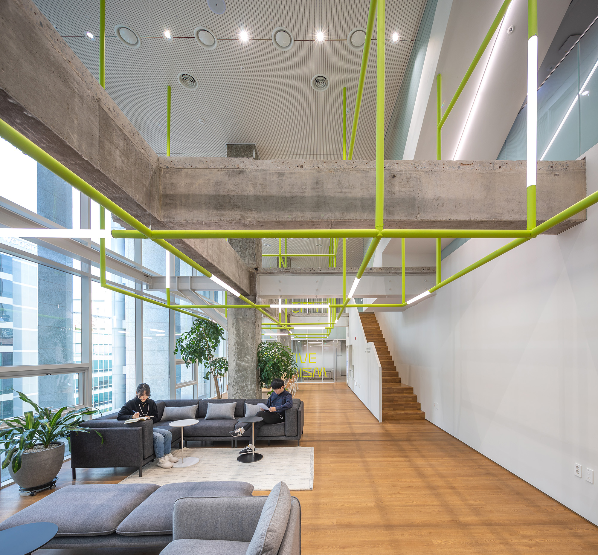 The concept behind the three lounges, each representing the characteristics of the members of startup companies on each floor, is to foster interaction among the grouped companies. The flow of passing through the lounges on each floor was designed to facilitate broader communication. The area secured through the lounge planning process was utilized for horizontal and vertical expansion, improving the work environment. The previously neglected 11th floor has been transformed into a space surrounded by a forest, providing a unique setting for relaxation, events, meetings, and creating special memories for the occupants outside their everyday work routine.