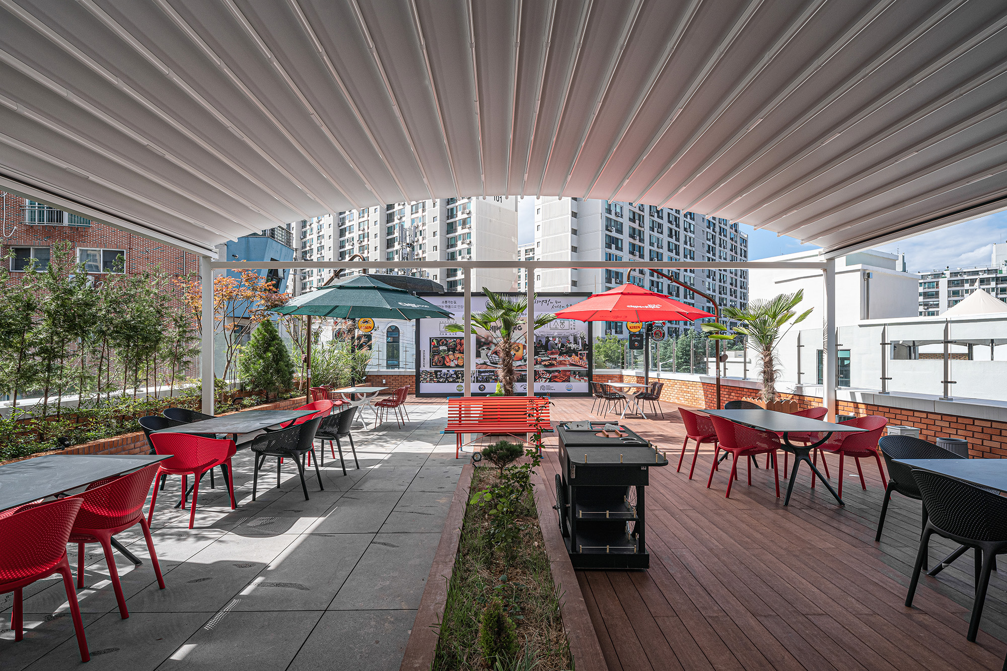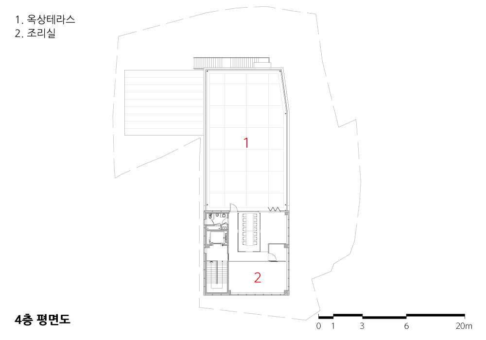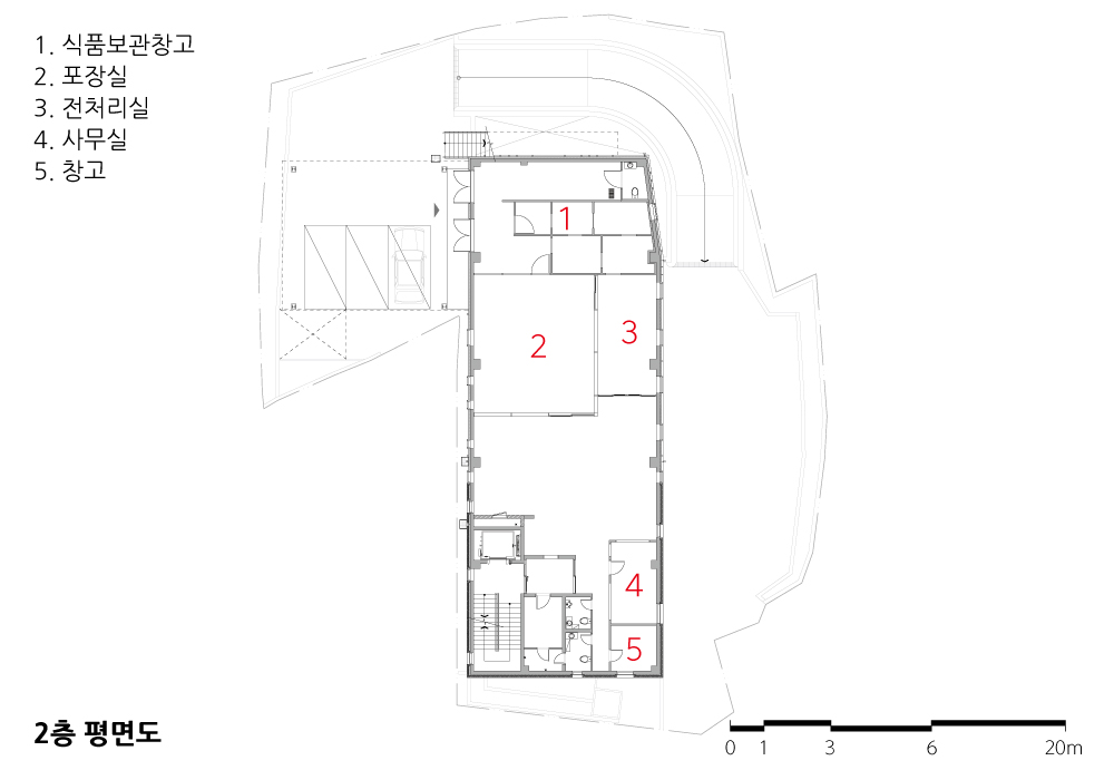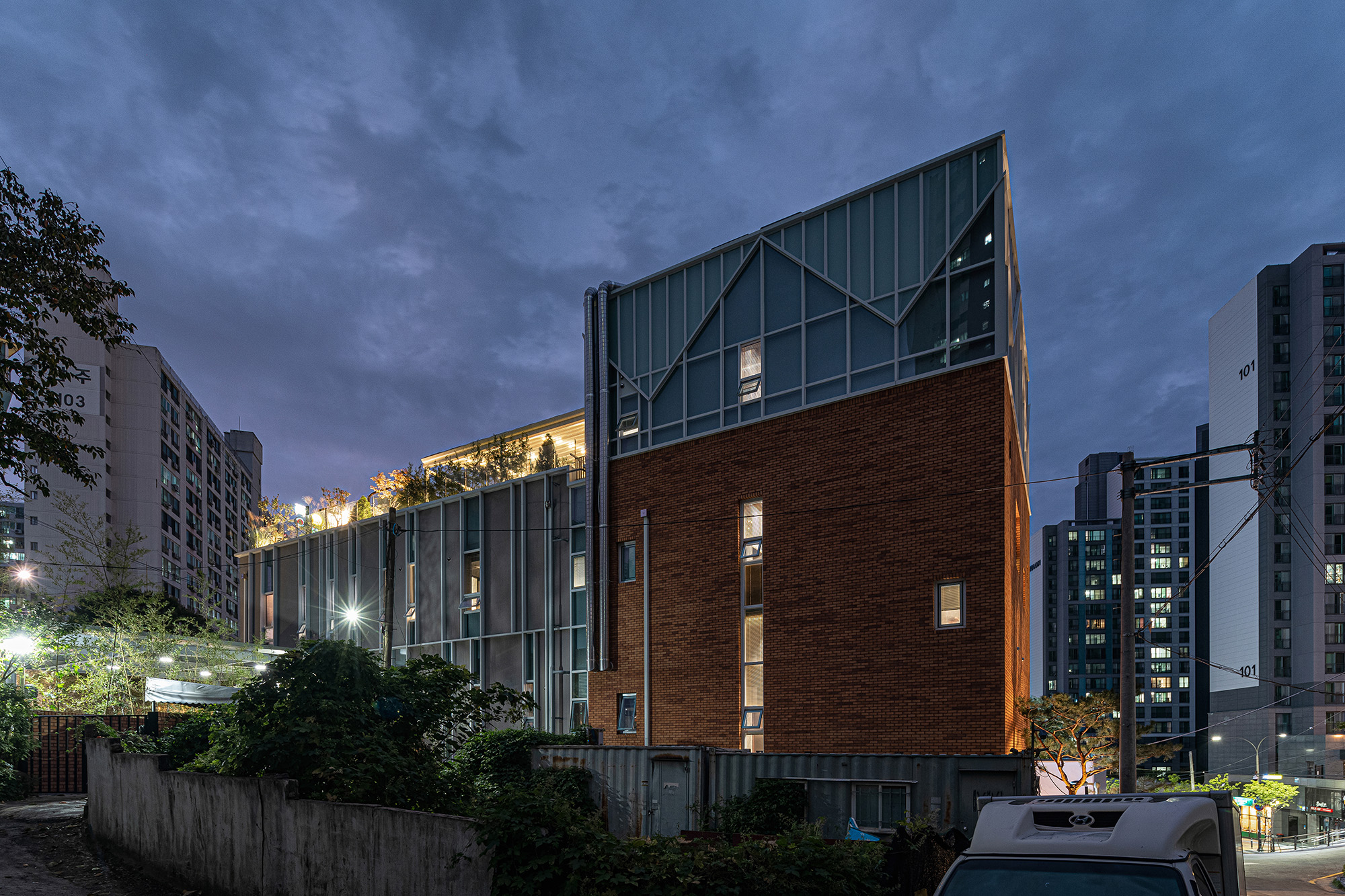 The clue of the plan began with the brick and slope sites of the cathedral, and the harmonious connection between the cluttered nature and the city. They exchanged opinions with the owner of the building and gradually embodied the architectural plan. Along with the efficiency of the facility, the relationship with the surroundings was considered important. The exterior façade design was divided into two characters in consideration of the symbolism of the building and the relationship with the surroundings. The facade that passers by will face for the first time has a brick finish and an upper sloped louver elevation design. The simultaneous acceptance of the symbolism of the building and the symbolism of the company was considered. The stable elevation consisting of bricks and the light athletic elevation consisting of inclined louver are expected to be a design element that can induce positive changes in the symbolism and distance of the building for those passing through the street.