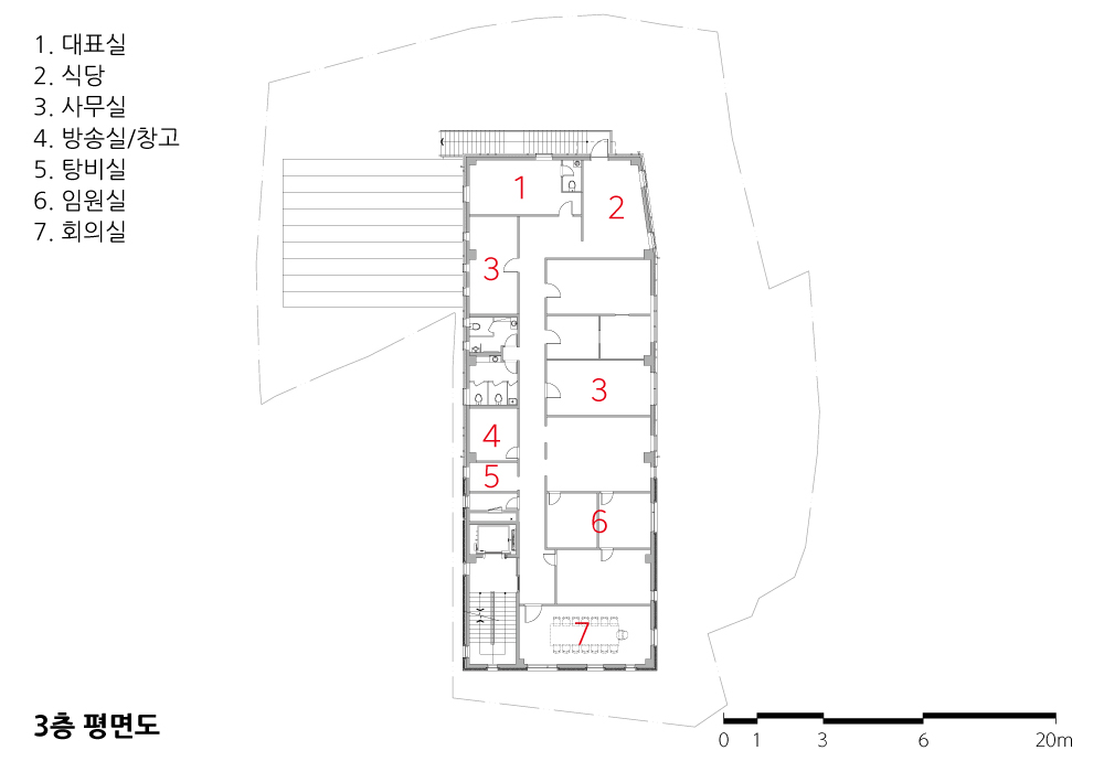 예전부터 알고 지내던 지인으로부터 설계의뢰가 들어왔다. 자신이 영위하던 회사의 사옥이 필요하다는 연락이었다. 프로젝트는 몇 개의 부지에 대해 조언하는 것으로 시작되었다. 건물의 용도가 사옥이다 보니, 건물의 프로그램은 명확했다. 명확한 프로그램을 온전히 담을 수 있는 고민이 필요했다. 사업 부지로 선정된 곳의 주변은 벽돌로 마감된 멋스러운 성당과 마주 보고 있었고, 저층의 건물들이 주변에 불규칙하게 자리 잡고 있었다. 사업 부지는 7~8미터 정도 차이 나는 경사를 이루고 있는 부지였다. 가까운 곳에 새롭게 조성된 아파트 단지가 있어, 거리의 환경은 조금씩 바뀌고 있었다.