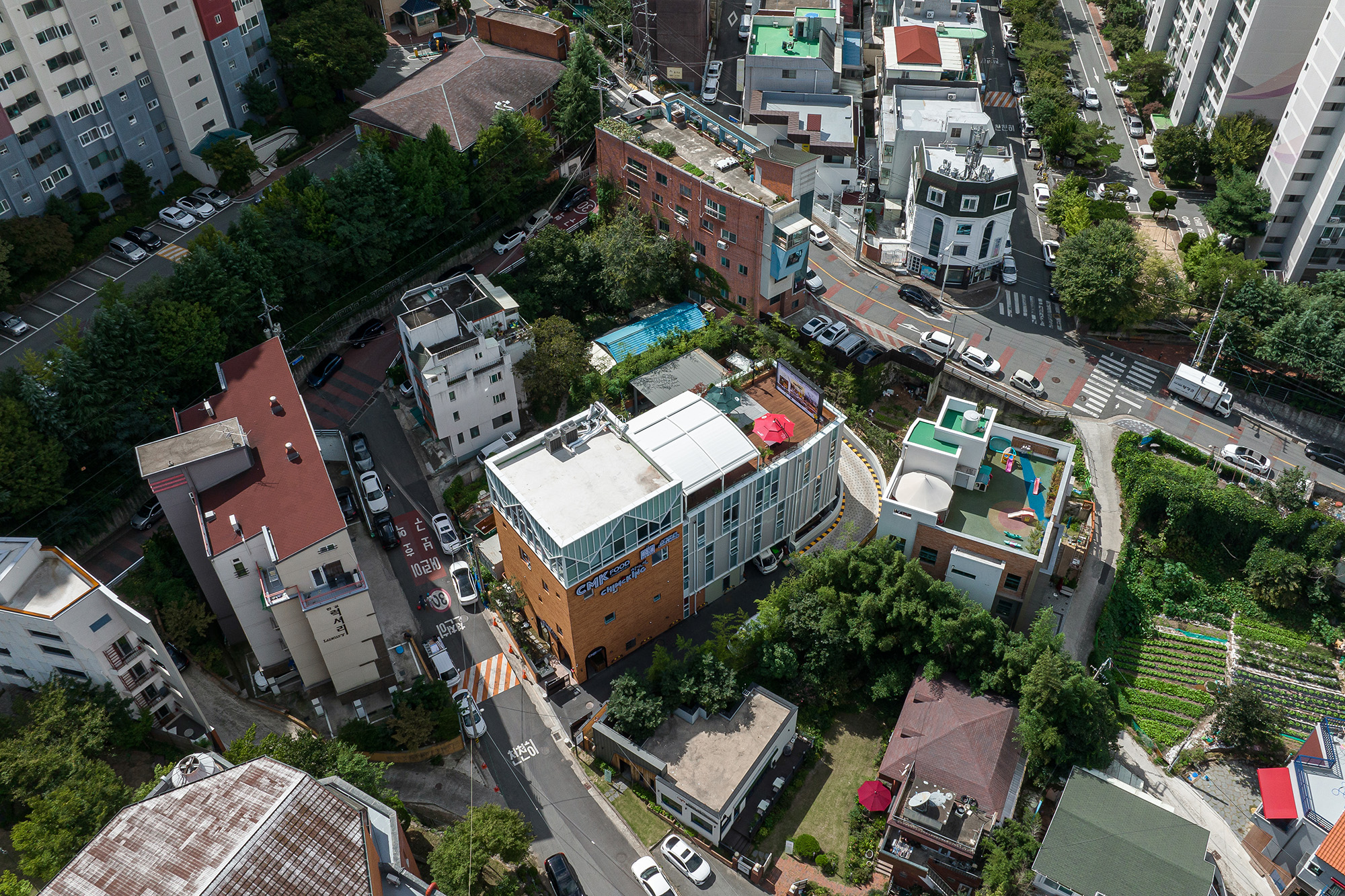 A design request came from an acquaintance I had known for a long time. I was informed that I needed the office building of my company. The project began with advice on several sites. Since the purpose of the building was the office building, the program of the building was clear. It was necessary to think about how to fully contain a clear program. The surroundings of the selected site of the business were faced with a stylish cathedral finished with bricks, and low-rise buildings were irregularly located around. The project site was a site with a slope of about 7 to 8m. There was a newly built apartment complex nearby, and the environment of the street was changing little by little.