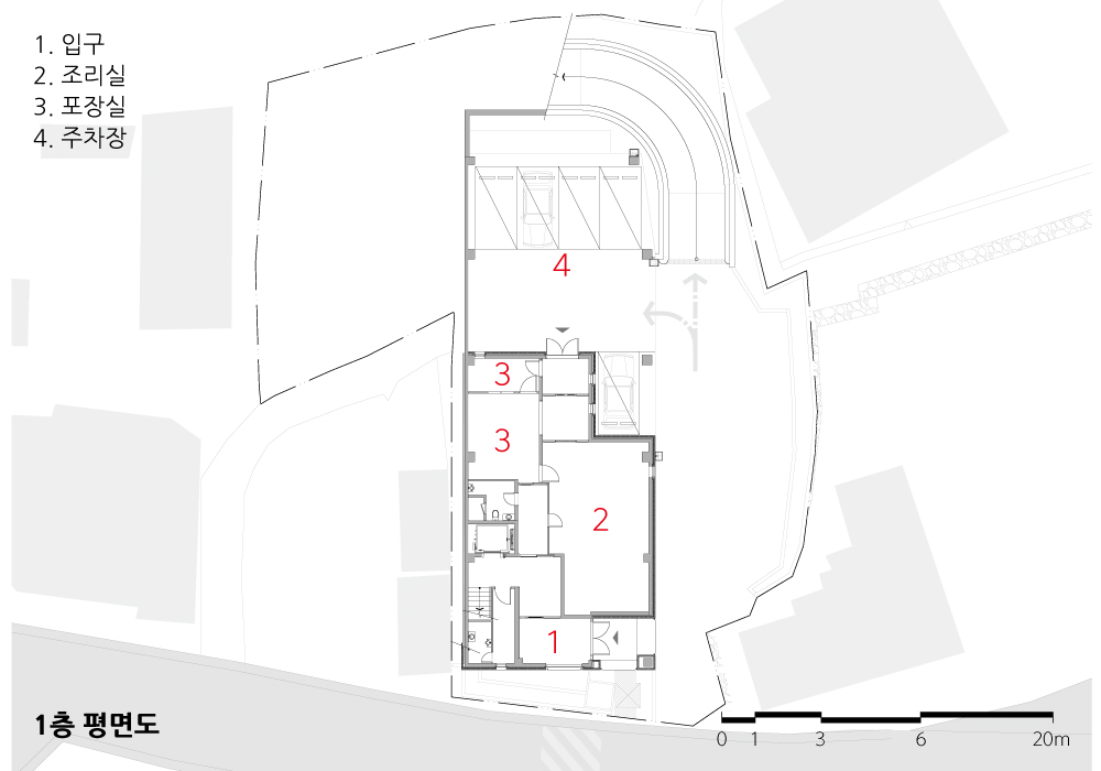 | 우록리 주택 설계자 | 동원서 _ 디에이 건축사사무소 건축주 | 윤민환 감리자 | 디에이 건축사사무소 시공사 | (주)성우아이디건설 설계팀 | 조연지, 한송민 설계의도 구현 | 디에이 건축사사무소 대지위치 | 대구광역시 수성구 지범로48길 30 주요용도 | 근린생활시설 대지면적 | 1,006.00㎡ 건축면적 | 442.09㎡ 연면적 | 992.20㎡ 건폐율 | 43.95% 용적률 | 98.63% 규모 | 4F 구조 | 철근콘크리트구조 외부마감재 | 0.5B 점토벽돌 치장쌓기, 로이복층유리, STO 외단열 토탈마감 내부마감재 | 대리석복합타일, 화강석 물갈기, 도기질 벽타일 설계기간 | 2021. 01 공사기간 | 2021. 03 – 2022. 05 사진 | 윤동규 구조분야 | 오에스구조 기계설비분야 | 서진설비설계사무소 전기통신분야 | 우진엔지니어링 |