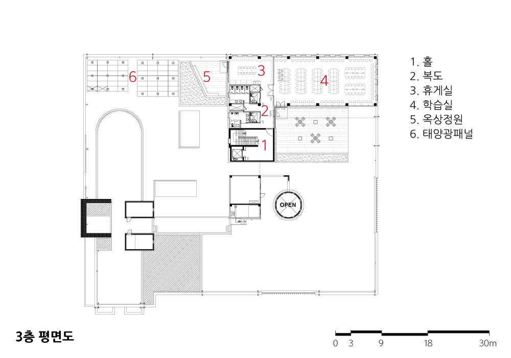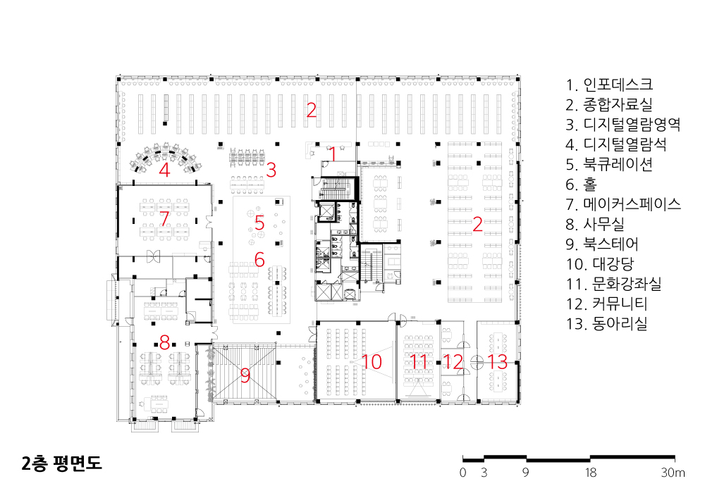 다음으로 어떤 공간을 새로이 만들 것인지 고민했다. 요즘의 도서관은 학습열람실이 아닌 책과 함께 여가를 보내며 커뮤니티를 활성화할 수 있는 도서관을 추구하고 있다. 이에 맞춰 융합공간, 순환공간, 개방공간을 만들고자 했다.