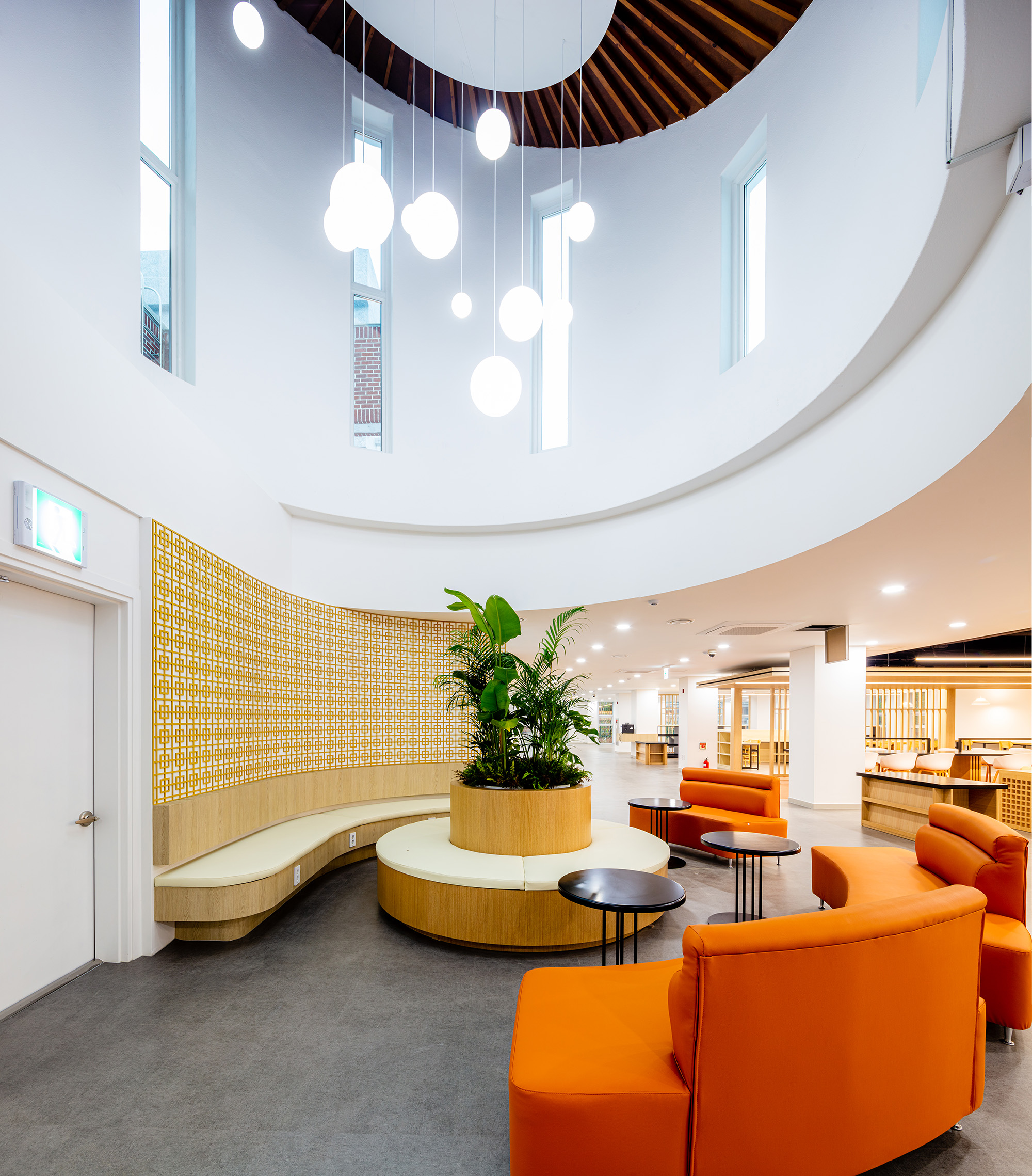 ② Skylight: The original circular skylight had been covered from the inside for some time, obscuring its appearance. However, the structural elements of the skylight were prominently exposed on the rooftop, contributing to the library's architectural identity when viewed from surrounding high rise buildings. This feature was revived by placing the Silver Library near the skylight, creating a bright and open space. It also compensated for the low ceiling height of the existing structure.