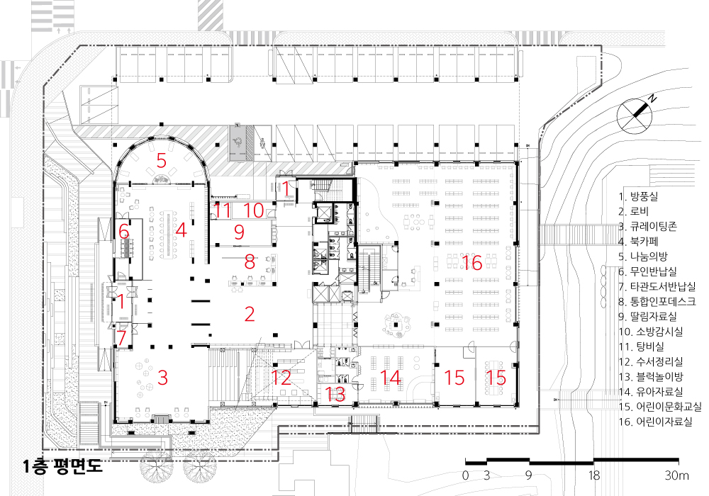 The Sanbon Library in Gunpo City is a building that was completed in 1994. It was constructed by the Korea Land and Housing Corporation (LH) as a donated library when the Sanbon New Town, one of the first new towns in the area, was developed. It is situated in one corner of the central park, which serves as the focal point of the Sanbon New Town. Thanks to its excellent accessibility, it has the highest utilization rate among the six libraries in Gunpo City, despite the presence of a separate central library. The library often experiences high density and complexity due to the constant influx of visitors. Furthermore, due to structural reasons, the library only had bookshelves on the first floor, while the second floor was used solely as a study and reading area, which limited its ability to fully function as a proper library.