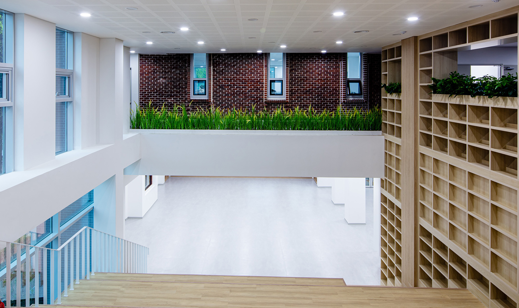 ③ 붉은 조적벽 _ 산본도서관은 1층은 화강석, 2층은 붉은 벽돌로 마감돼 있었다. 금번 리모델링에 1층의 화강석은 대부분 존치되었으나, 2층의 조적부분은 내진보강 등의 사유로 대부분 철거되었다. 다행히 증축되어 북스테어로 조성되는 부분에 기존의 외벽 부분이 내부로 들어오게 되는 부분이 있어서 조적벽을 그대로 존치하여 새롭게 만들어진 북스테어와 예전의 조적벽이 조화를 이룰 수 있게 했다.