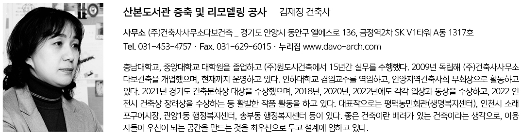 Expansion and remodeling of Sanbon Library Architect | Kim, Jaejung _ Davo Architects Group Co., Ltd Client | Gunpo Mayor Supervisor | Moosim Architects & Engineers Co., Ltd Construction | Jusan Construction Co., Ltd. Project team | An, Sunyoung / Tak, Jimin / Lim, Jungbin / Kim, Yeeun Design intention realization | Davo Architects Group Co., Ltd Location | 96, Gwangjeong-ro, Gunpo-si, Gyeonggi-do, Korea Program | Educational research facilities(Library) Site area | 3,914.00㎡ Building area | 2,633.67㎡ Gross floor area | 5,448,46㎡ Building to land ratio | 6.58% Floor area ratio | 12.21% Building scope | B1F - 3F Structure | RC + Steel structural Exterior finishing | IP Panel Interior finishing | LVT Tile Design period | 2020. 09 - 2022. 12 Construction period | 2021. 11 - 2023. 03 Photograph | Chae, Suok Structural engineer | Korea Disaster Prevention Technology Mechanical engineer | Leegun Engineering Co., Ltd Electrical engineer | Korea Elec, Design Super, Engineering Co., Ltd Fire engineer | Korea Elec, Design Super, Engineering Co., Ltd |