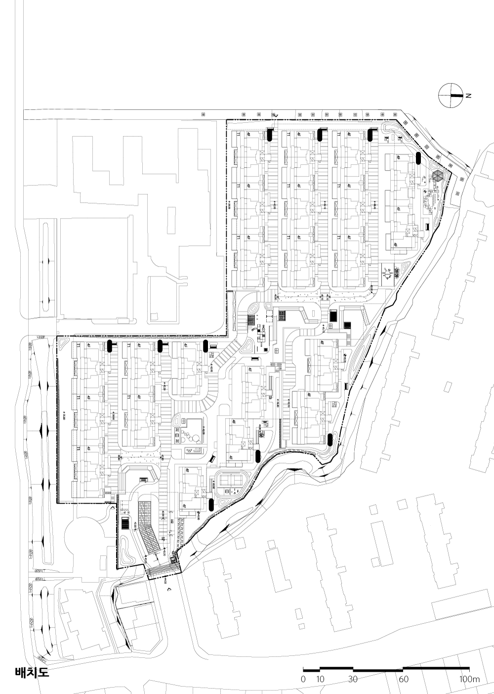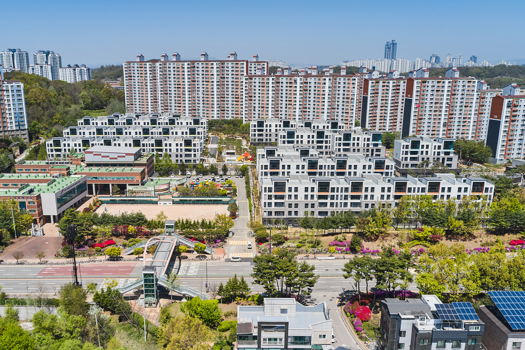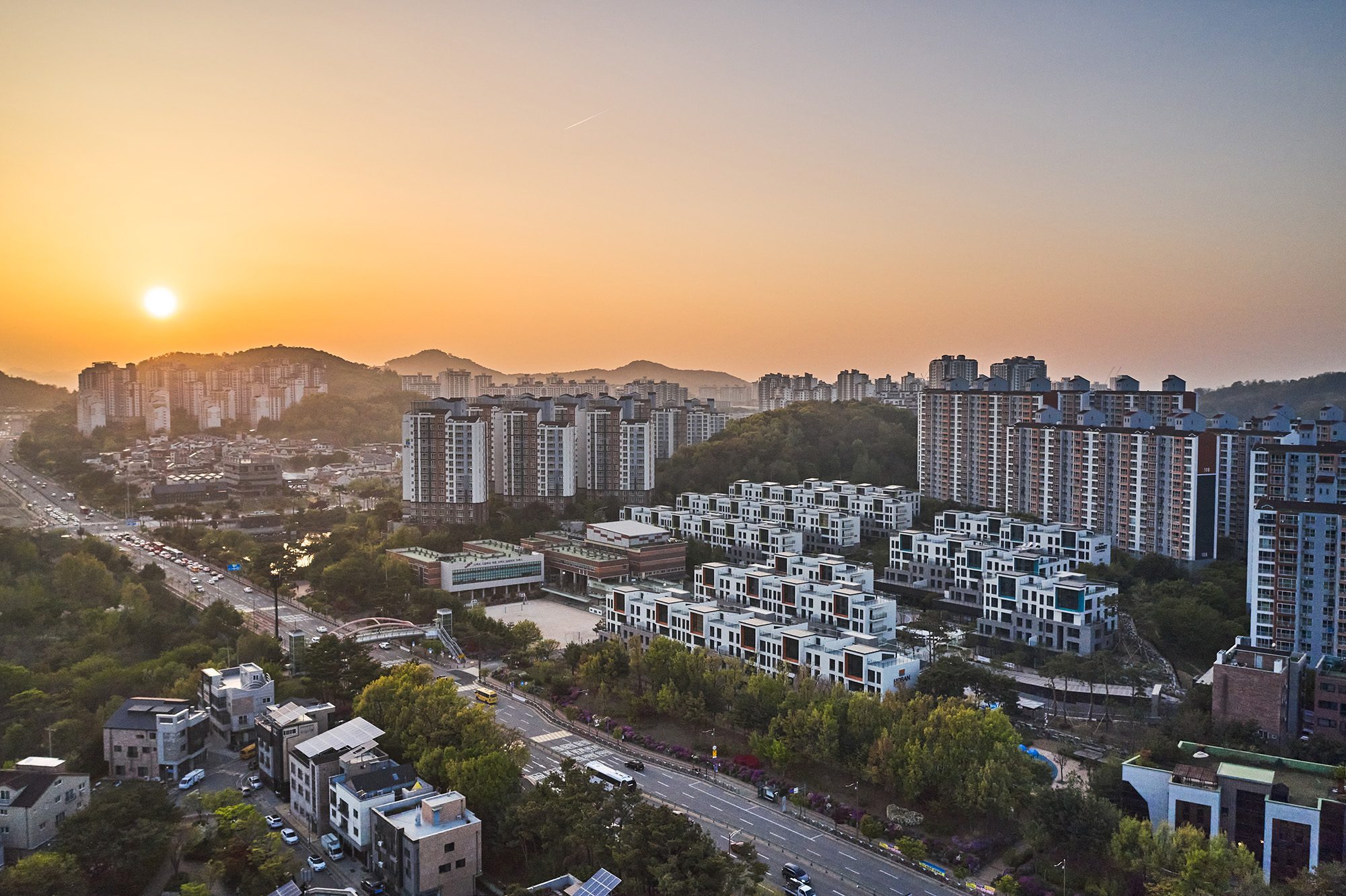 Using the difference in topography, planning underground parking lot The lower part of public space is used as welfare facilities and neighborhood-living facilities, pedestrain roads and square connecting the entire complex, terrace house with sunken garden. The upper part is planned the rowhouse with independent terrace. The entire complex consists of 10 buildings. A dynamic form of complex is created by a number of terraces for each residents and The penthouse attic connected to the roof. It gives diverse sense of space and rhythm vertically.