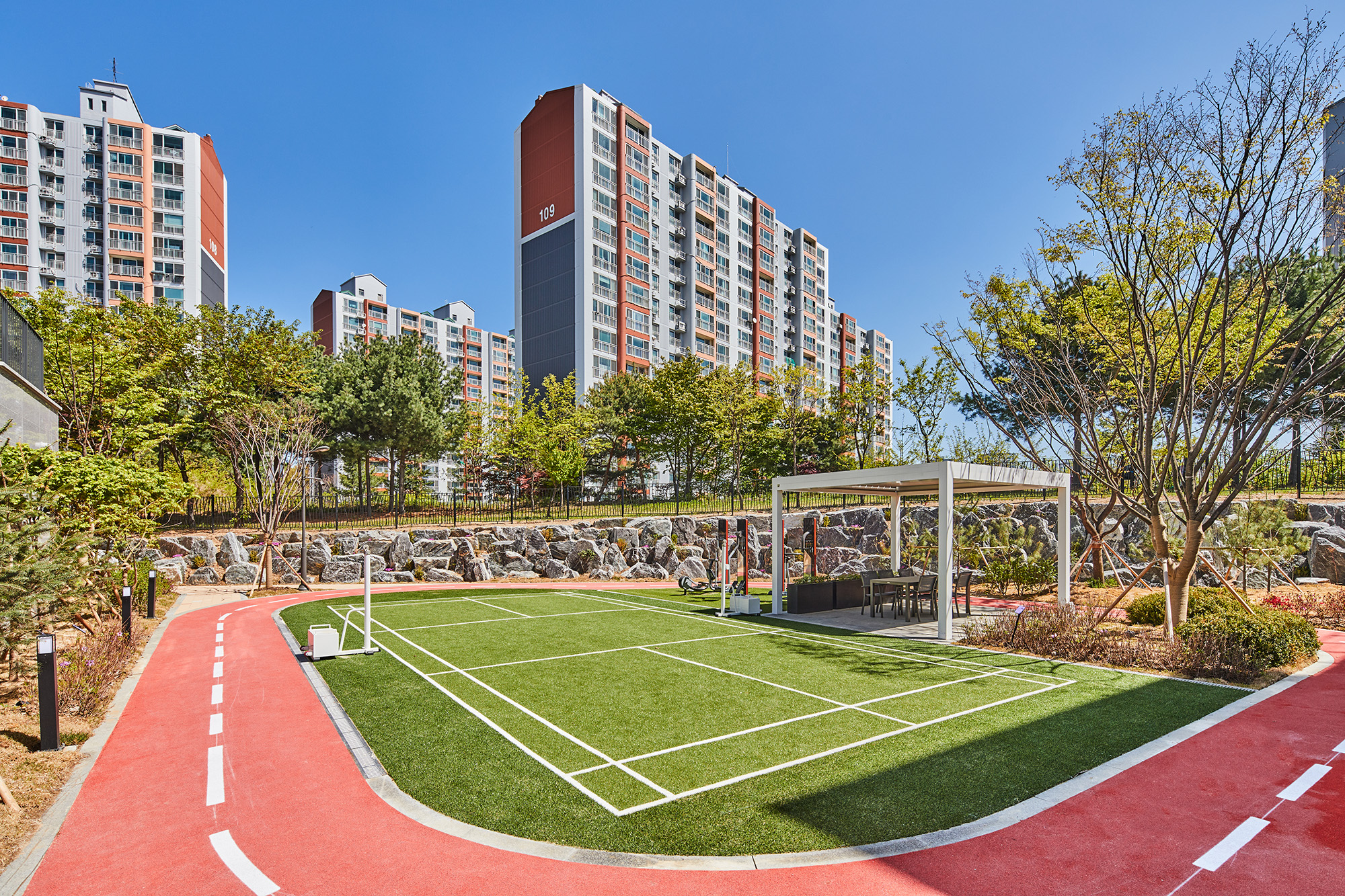 보행 동선과 연계된 특색 있는 광장들과, 이와 마주해 위치한 부대복리시설이나 근린생활시설은 단지 내 입주민들에게 편의를 제공하고 입주민들 간의 만남과 소통이 자유롭게 형성될 수 있도록 했다. 각 동의 출입구로의 보행로는 단지 중앙의 광장을 가로지르며, 광장의 다양한 콘셉트의 휴게 공간 및 조경공간을 통해 집 앞에서 즐길 수 있는 산책로로 활용할 수 있도록 했다.