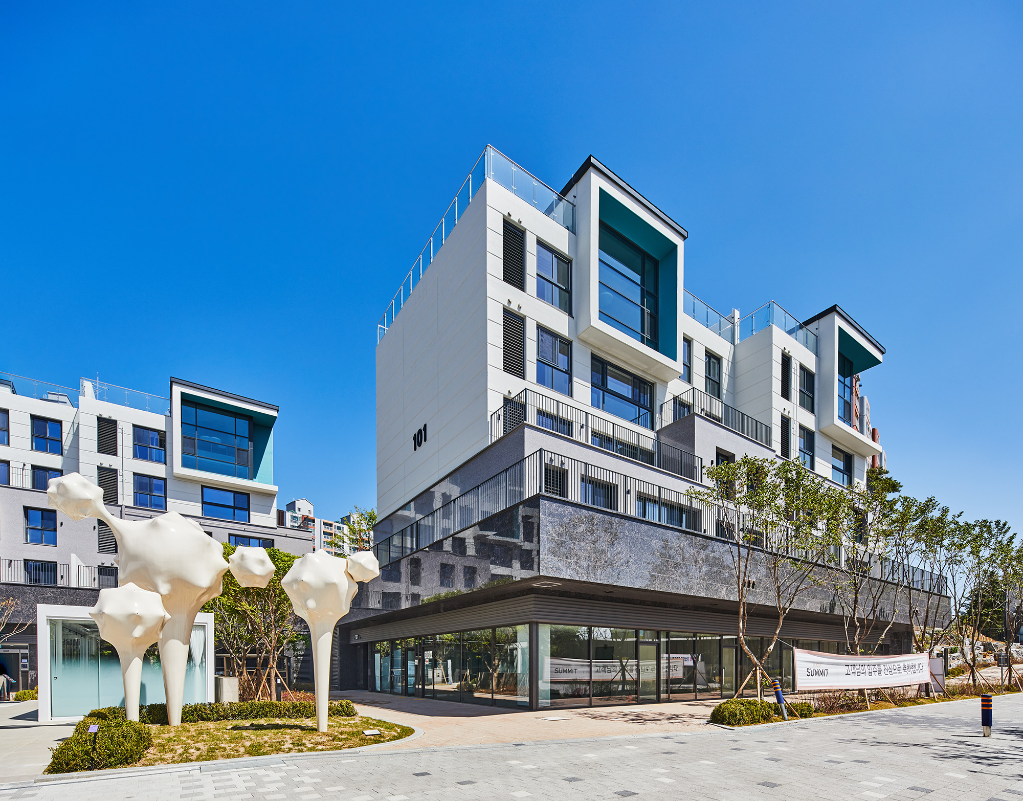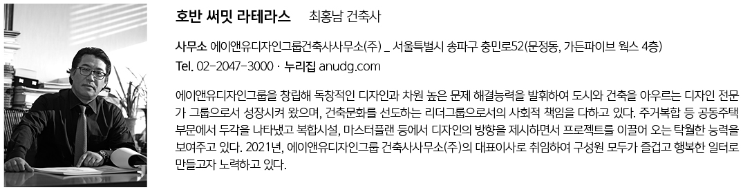HOBAN Summit La terrace Architect | Choi, Hong Nam _ ANU Design Group Client | HOBAN HOTEL & RESORT CO.,LTD. Supervisor | TAEBAEK ARCHITECTS CO.,LTD. Construction | HOBAN CONSTRUCTION LTD. Project team | Ryu, Jaesub / Yoon, Younghoon/ Kwon, Myungsoo / Jung, Suntae / Kim. Yangwon / Kim. Dasol Location | 13, Sucheong-ro, Osan-si, Gyeonggi-do, Korea Program | Apartment house / Amenities Site area | 33,180.30㎡ Building area | 11,480.68㎡ Gross floor area | 47,803.99㎡ Building to land ratio | 34.60% Floor area ratio | 88.61% Building scope | B2F - 4F Structure | RC Exterior finishing | Paint, Stone, Real zinc Interior finishing | Wallpaper, Hardwood floors, Tiles Design period | Aug. 2019 - Feb. 2021 Construction period | Mar. 2021 - Apr. 2023 Photograph | Kim, hyunsu _ annews Structural engineer | Do-hwa Civil engineer | Jiho ENG Landscape engineer | Baum Mechanical engineer | CNI ENG Electrical engineer | SUNJIN Electric&Fire |