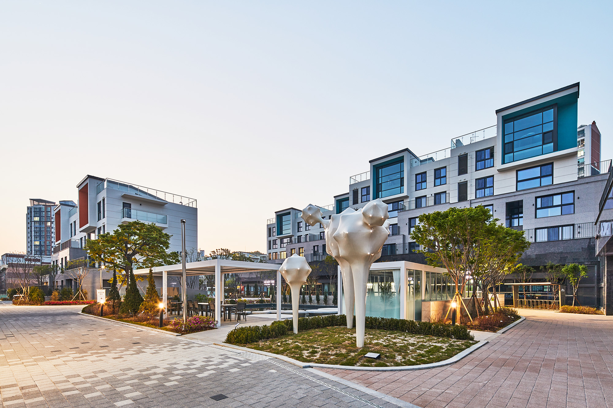 The distinctive plaza connected to the walking path as well as welfare facilities and neighborhood-living facilities located opposite the plaza provide convenience to the residents and allow natural and free communications. The walkway to the entrance of each building crosses the square in the center of the complex. They could use these spaces as a trail in front of their house which has various concepts of rest areas and green spaces.