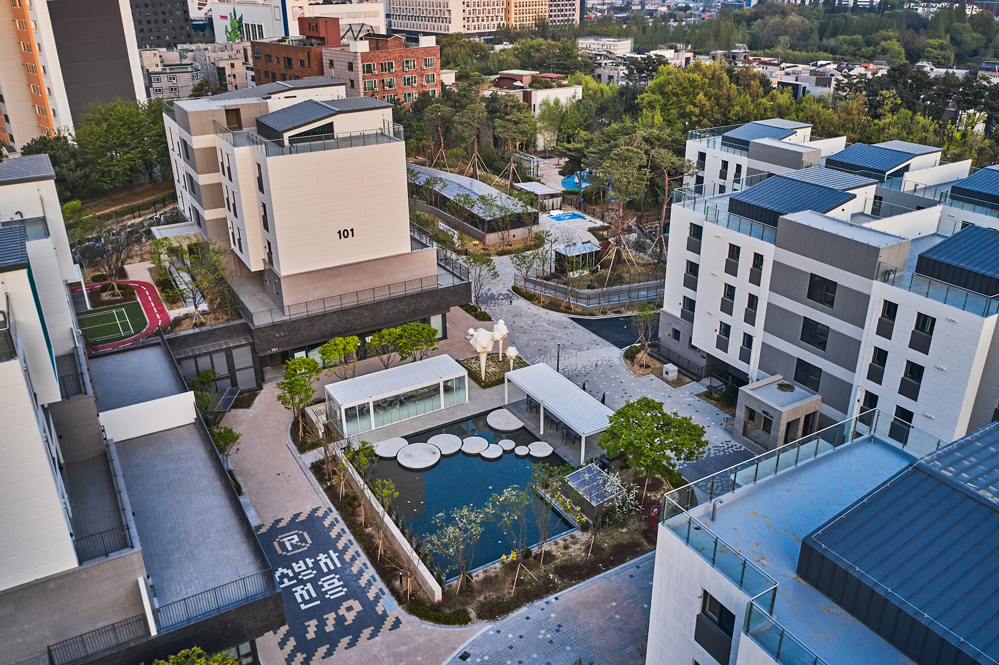 HOBAN Summit La terrace Architect | Choi, Hong Nam _ ANU Design Group Client | HOBAN HOTEL & RESORT CO.,LTD. Supervisor | TAEBAEK ARCHITECTS CO.,LTD. Construction | HOBAN CONSTRUCTION LTD. Project team | Ryu, Jaesub / Yoon, Younghoon/ Kwon, Myungsoo / Jung, Suntae / Kim. Yangwon / Kim. Dasol Location | 13, Sucheong-ro, Osan-si, Gyeonggi-do, Korea Program | Apartment house / Amenities Site area | 33,180.30㎡ Building area | 11,480.68㎡ Gross floor area | 47,803.99㎡ Building to land ratio | 34.60% Floor area ratio | 88.61% Building scope | B2F - 4F Structure | RC Exterior finishing | Paint, Stone, Real zinc Interior finishing | Wallpaper, Hardwood floors, Tiles Design period | Aug. 2019 - Feb. 2021 Construction period | Mar. 2021 - Apr. 2023 Photograph | Kim, hyunsu _ annews Structural engineer | Do-hwa Civil engineer | Jiho ENG Landscape engineer | Baum Mechanical engineer | CNI ENG Electrical engineer | SUNJIN Electric&Fire |