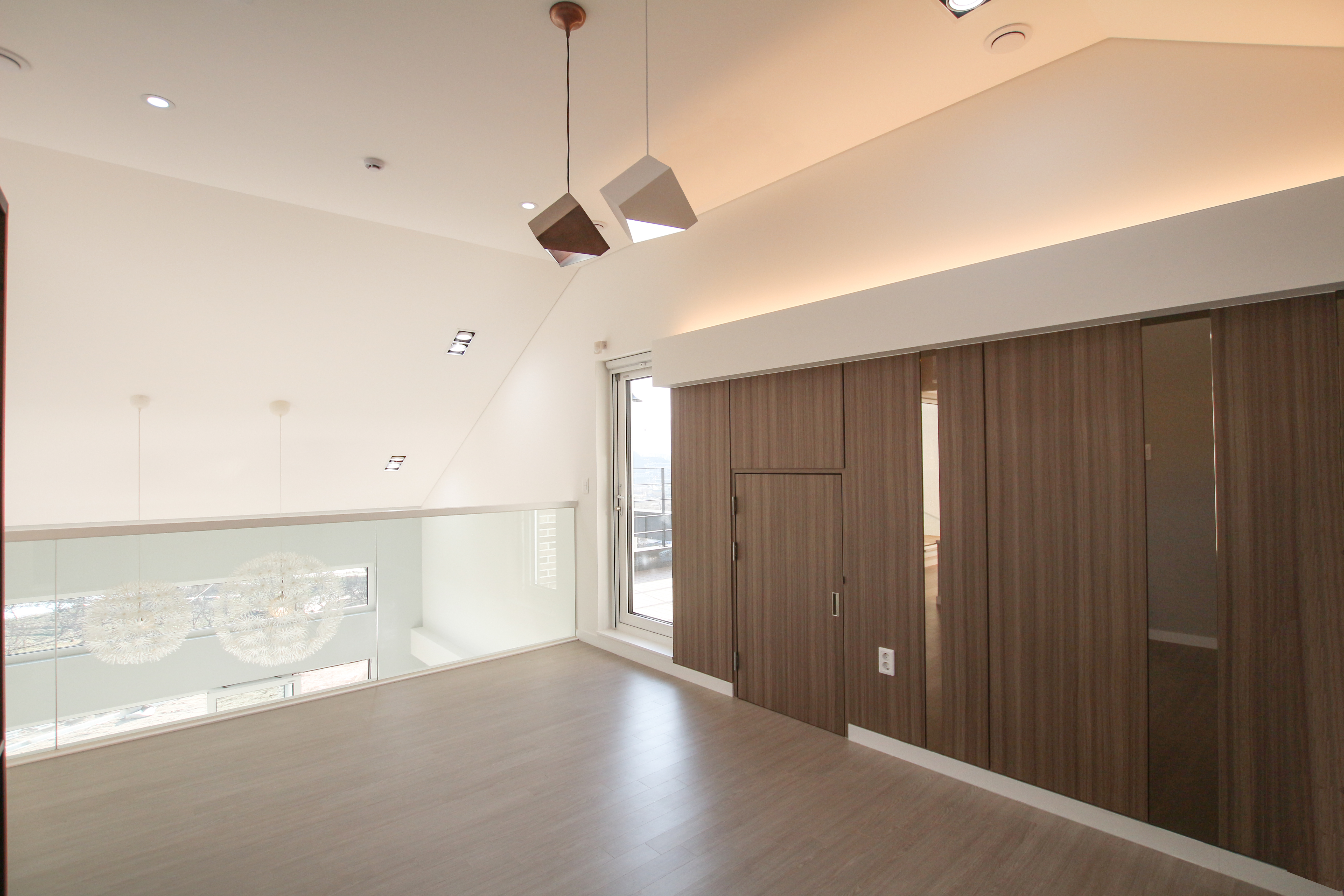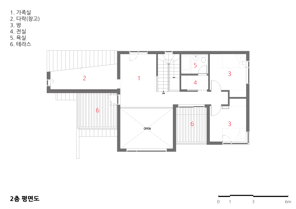 거실의 상부는 경사지붕을 활용해 1.5개층 높이로 가족실과 오픈시켜 공간감의 변화를 주고 가족실에서는 바로 출입이 가능한 다락공간을 두어 건축주의 취미활동인 프라모델 을 전시하고 보관할 수 있도록 했다. 2층에는 뷰가 다른 두 개의 테라스가 있어 다양한 경치를 즐기고 싶어하는 건축주의 마음을 담았다.