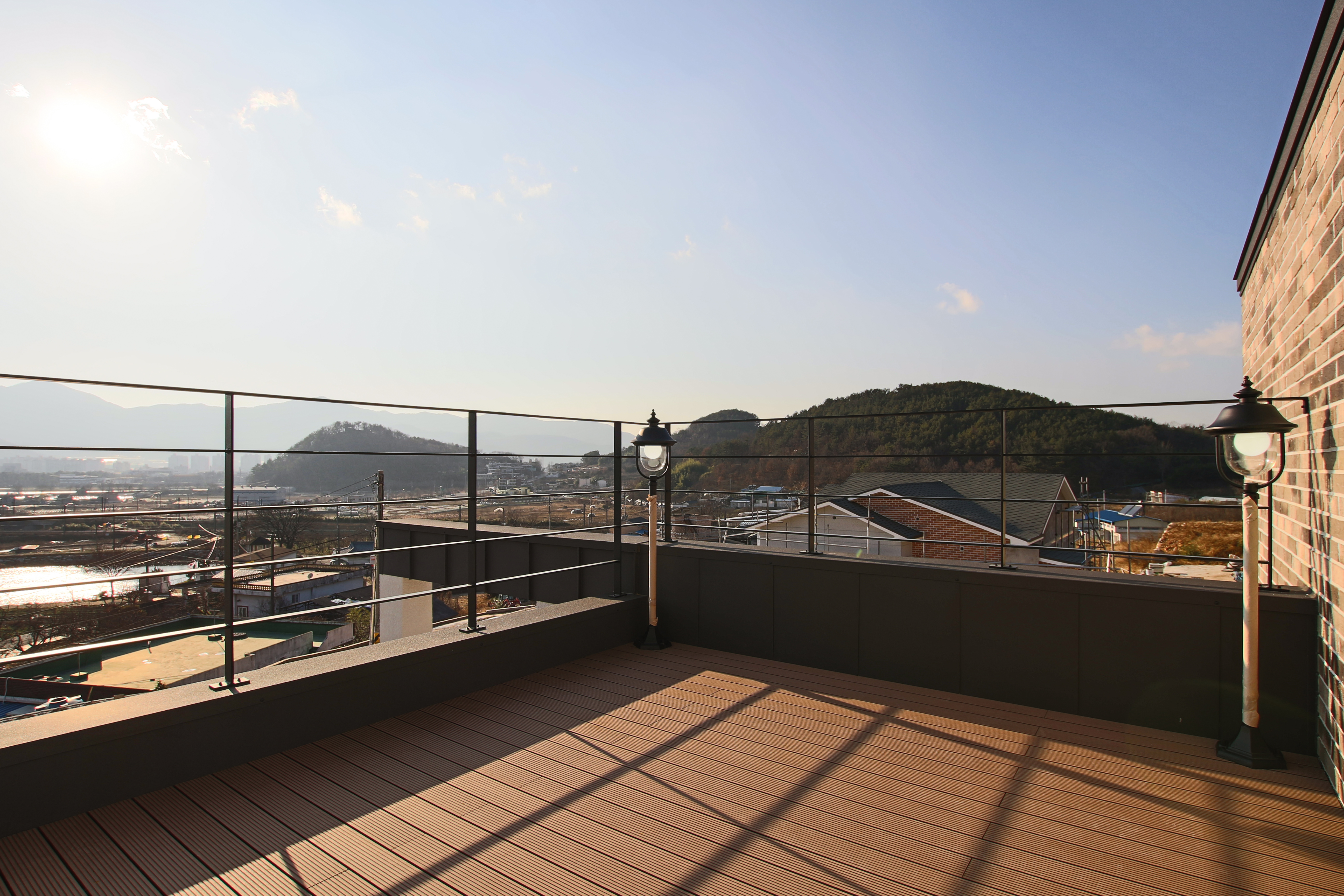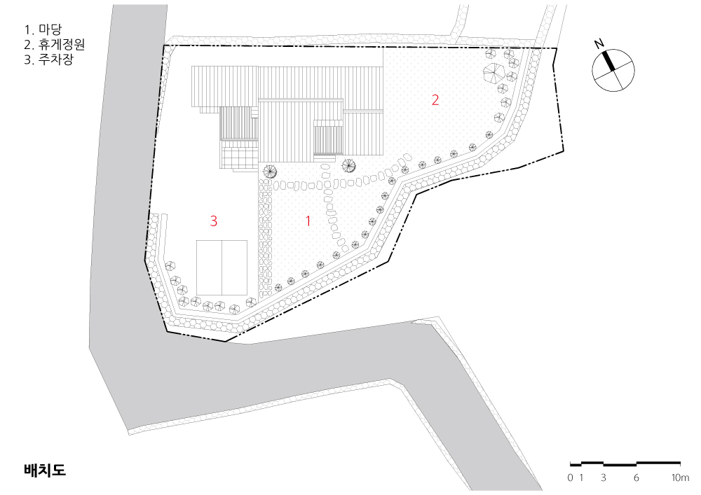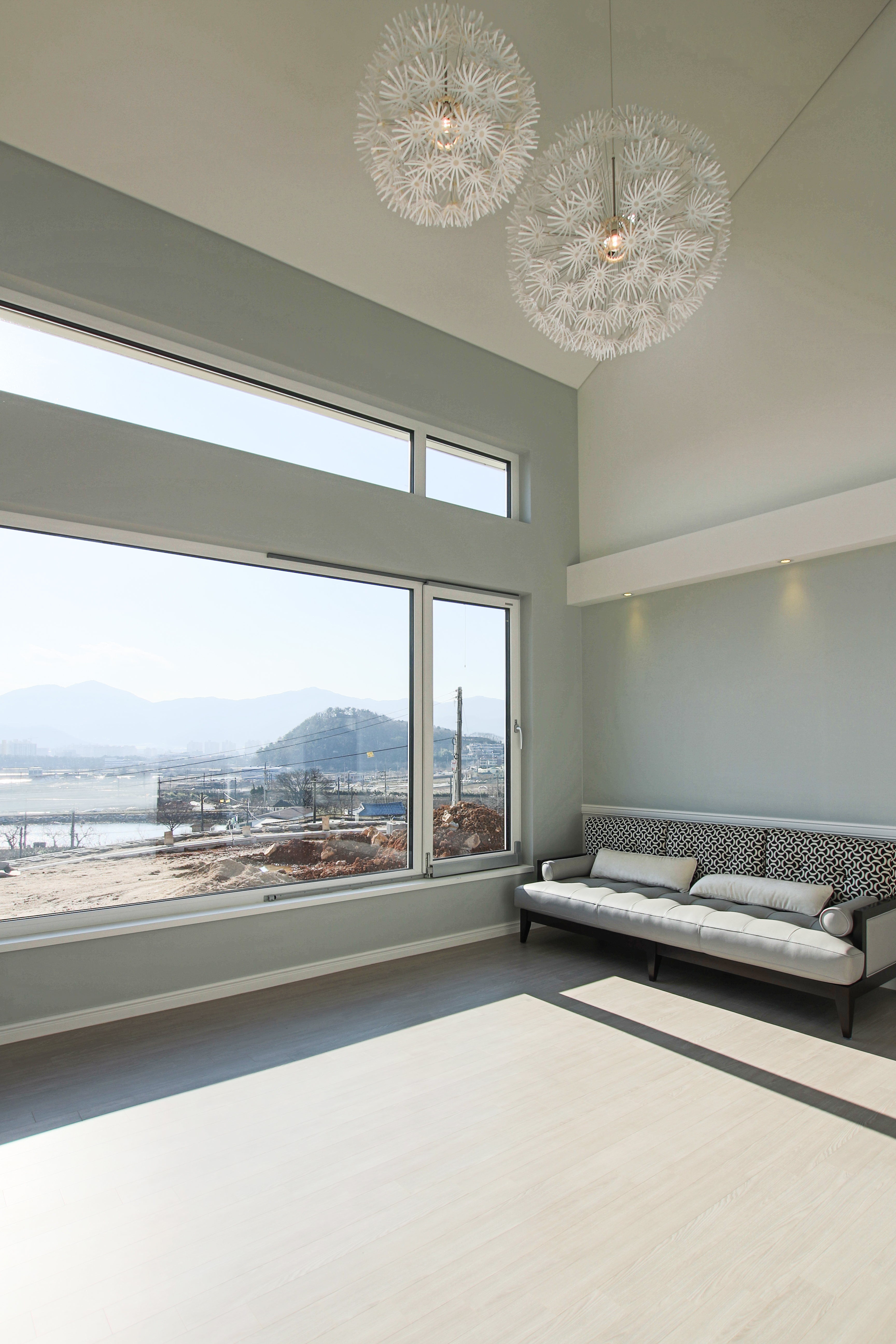 대지가 배산임수에 더 없이 좋은 언덕에 위치한 탓에 남쪽으로는 탁 트인 평야가 한눈에 들어오고 동서로는 아담한 산이 감싸고 있다. 이 대지 최고의 장점인 경치를 담아내는 것 은 대지가 주는 당연한 숙제였다. 남쪽 거실과 안방에 큰 창을 내 시원한 경치를 담음과 동시에 겨울에는 햇빛을 최대한 받아들이고 여름에는 외부 블라인드로 햇살을 차단함으 로써 에너지 효율을 높였다.