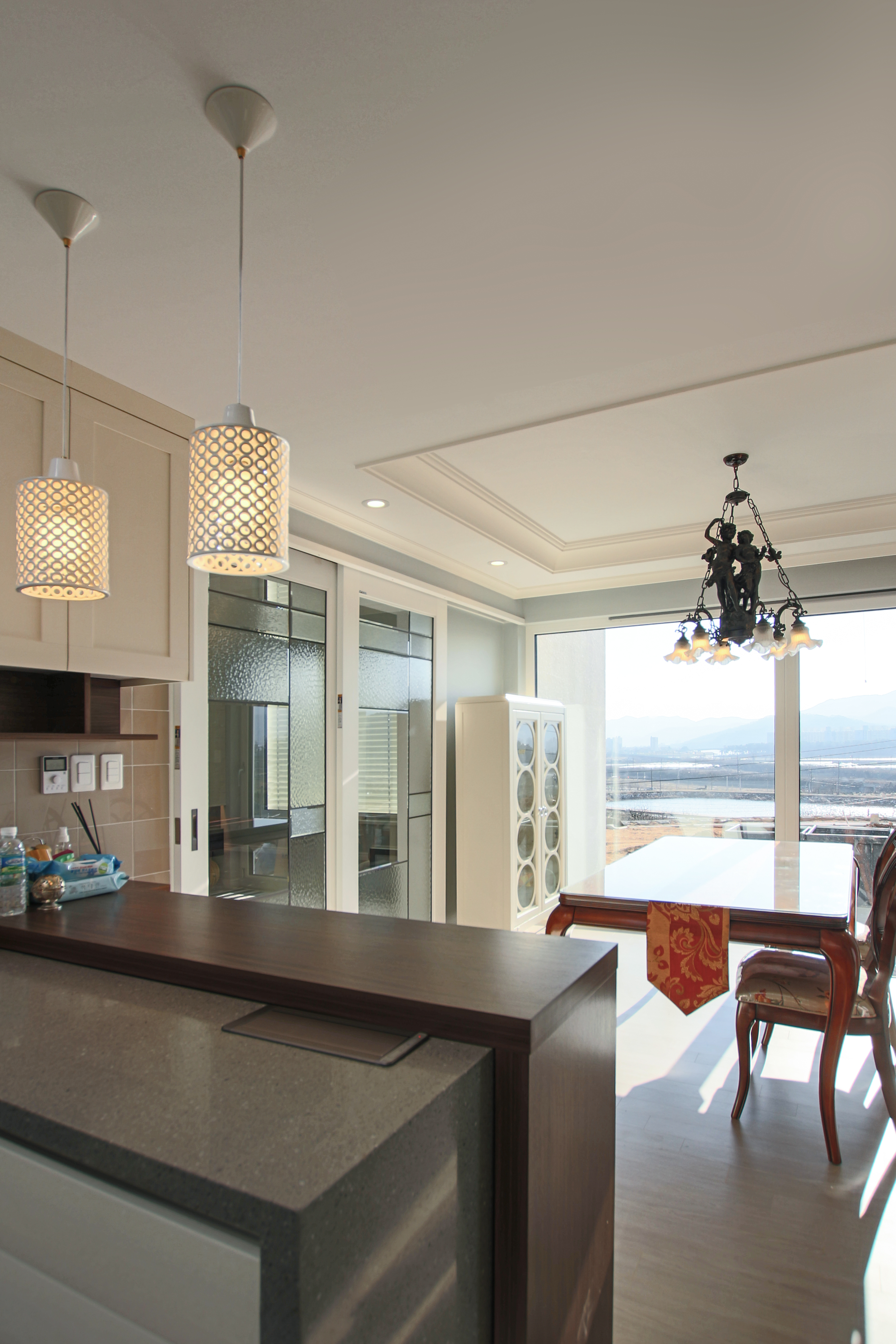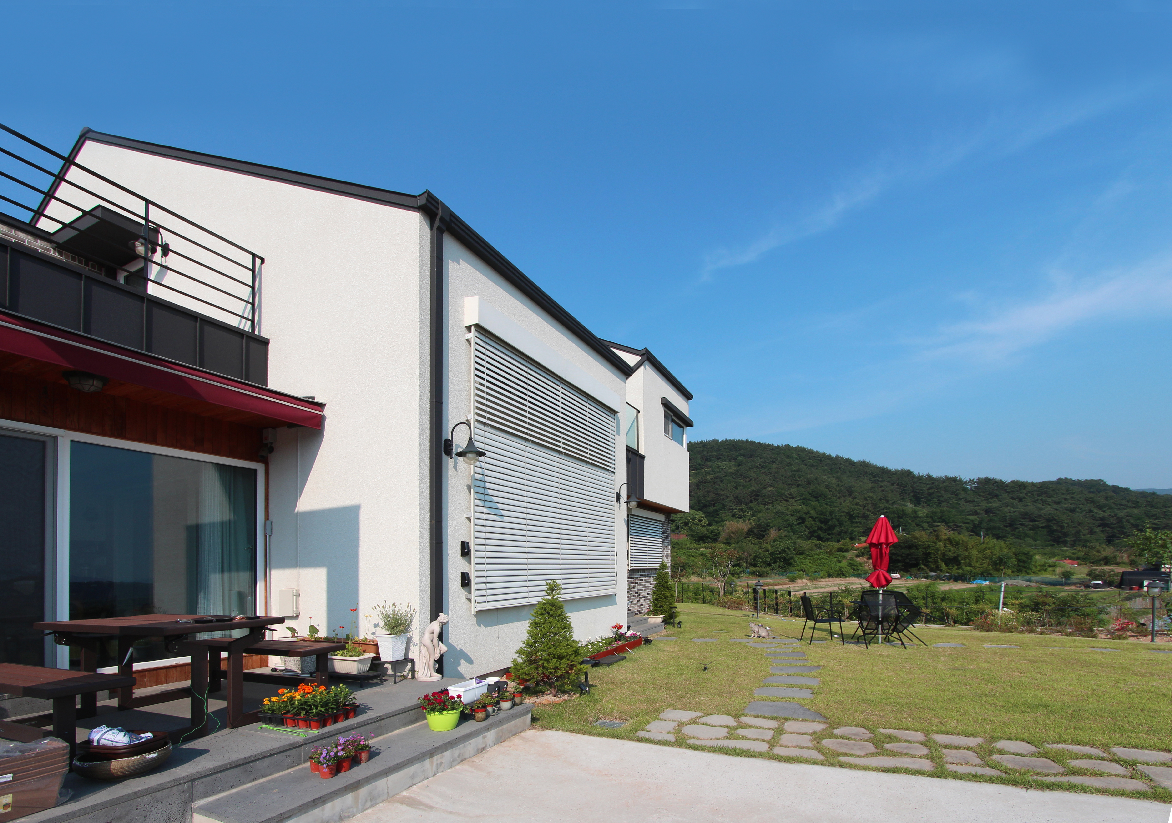 Because the site is located on a hill which is well suited for a favoured location (with back to the mountain and facing the water), a panoramic plain is seen to the south, and small mountains in the east and west encompass the site. It was the natural homework given by the earth to put the scenery which is the best advantage of this land. In the southern living room and in the main room, a large window was installed open to view cool scenery, and at the same time it receives maximum sunlight in the winter, whereas in the summer, it improves energy efficiency by being able to block out the sun through external blinds.