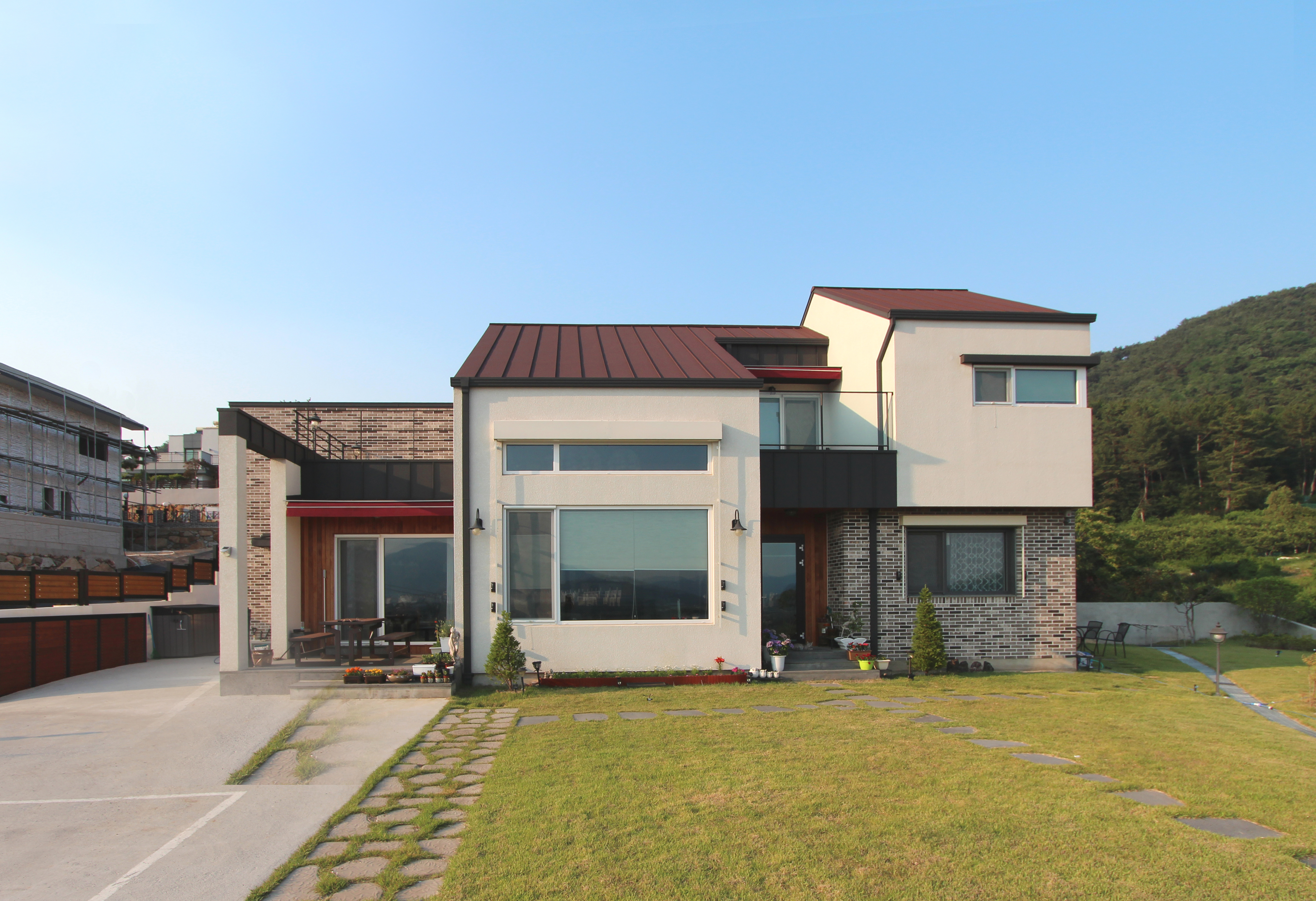 설계를 하면서 가장 힘들었던 점은 건축주 가족 구성원들의 극명히 다른 취향을 어떻게 조화시킬 것인가 하는 것이었다. 가족의 절반은 모던한 집을 원하고 절반은 빨간 지붕의 동화같은 집을 원했다. 붉은 지붕을 원하는 취향을 반영하여 레드컬러의 리얼징크 지붕 으로 모던하지만 건축주에게는 애착가는 집의 외관을 만들 수 있었고, La-plan Design( 대표 김도현)과의 협업을 통해 차분한 색상과 세미 엔틱한 느낌의 인테리어로 모던하면 서도 따뜻함을 살릴 수 있었다.