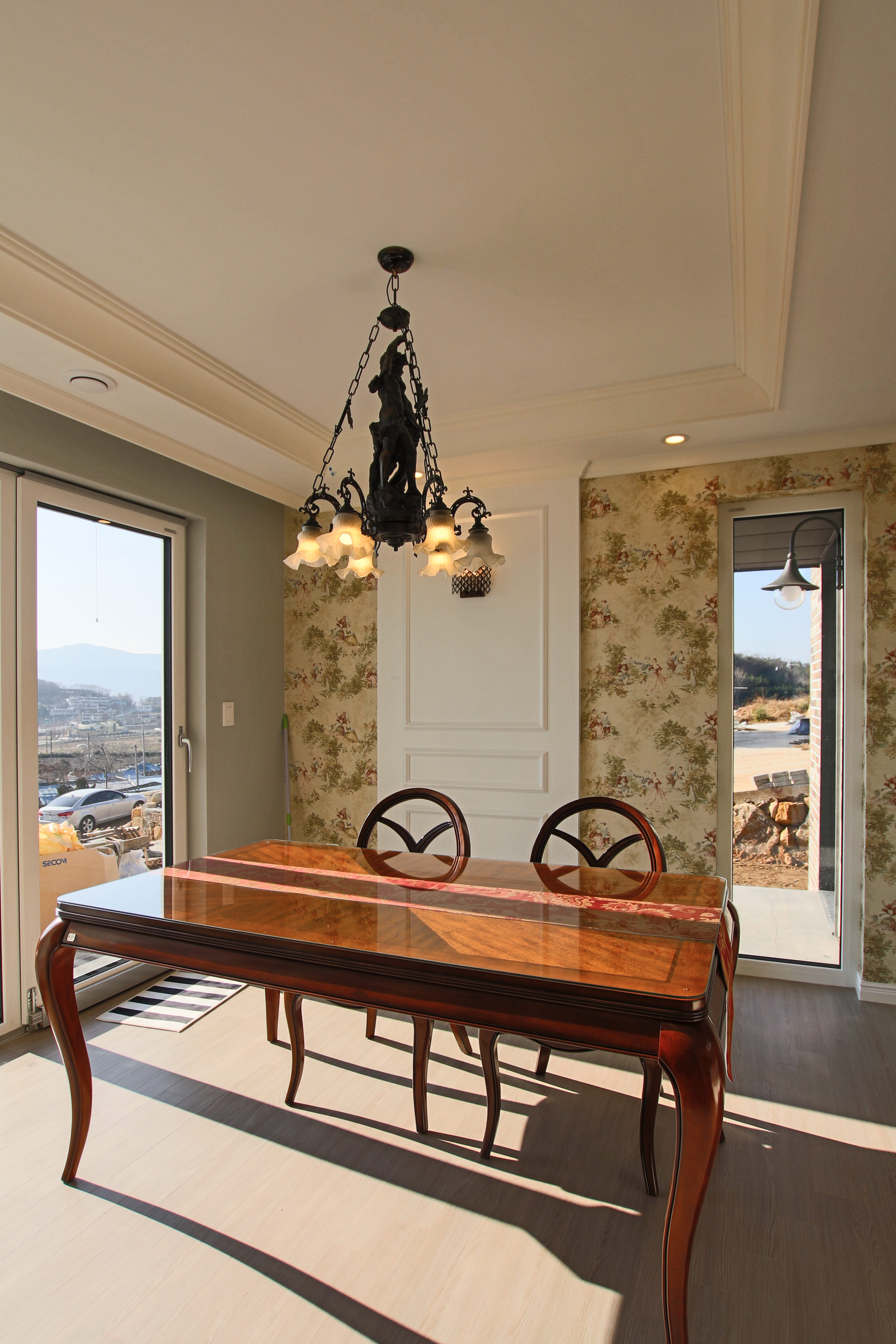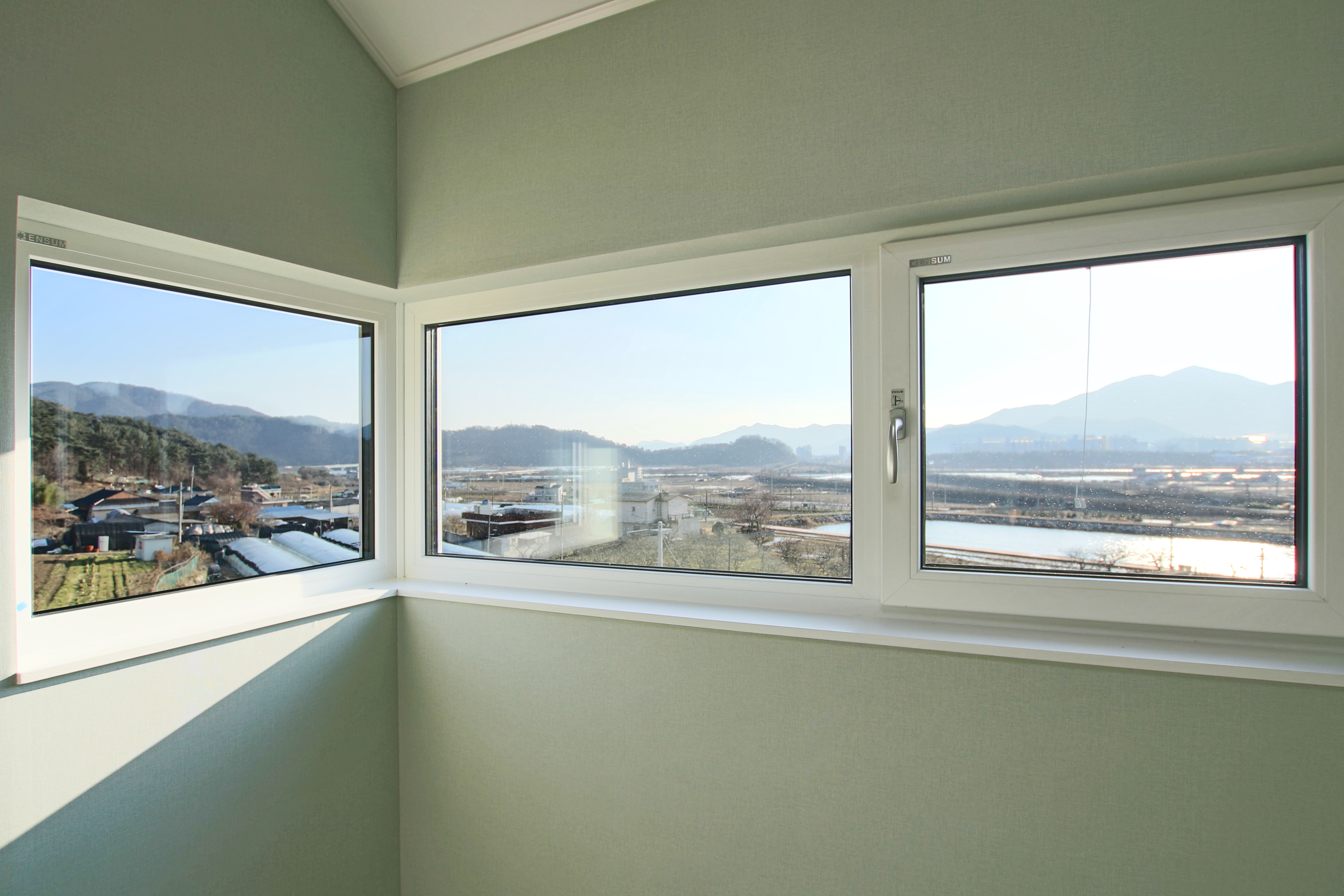 동쪽으로는 시간의 흐름에 따라 가변적으로 서재와 자녀방으로 사용할 수 있는 방을 두 고 코너창을 내서 경치를 담았다. 다락에는 작은 창을, 건축주의 힐링공간인 욕실의 월 풀에서도 경치를 즐길 수 있는 낮은 창을 설치했다.