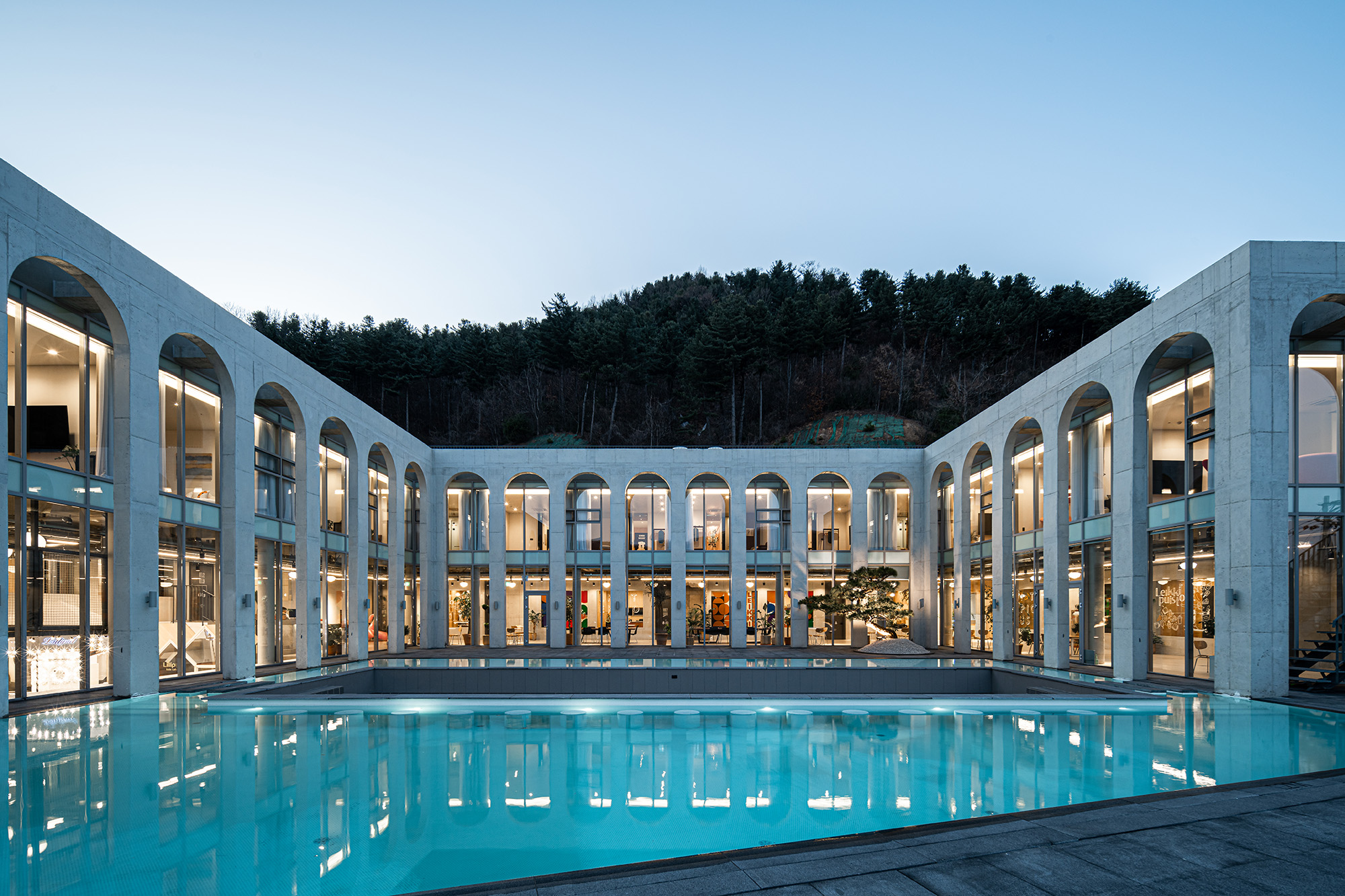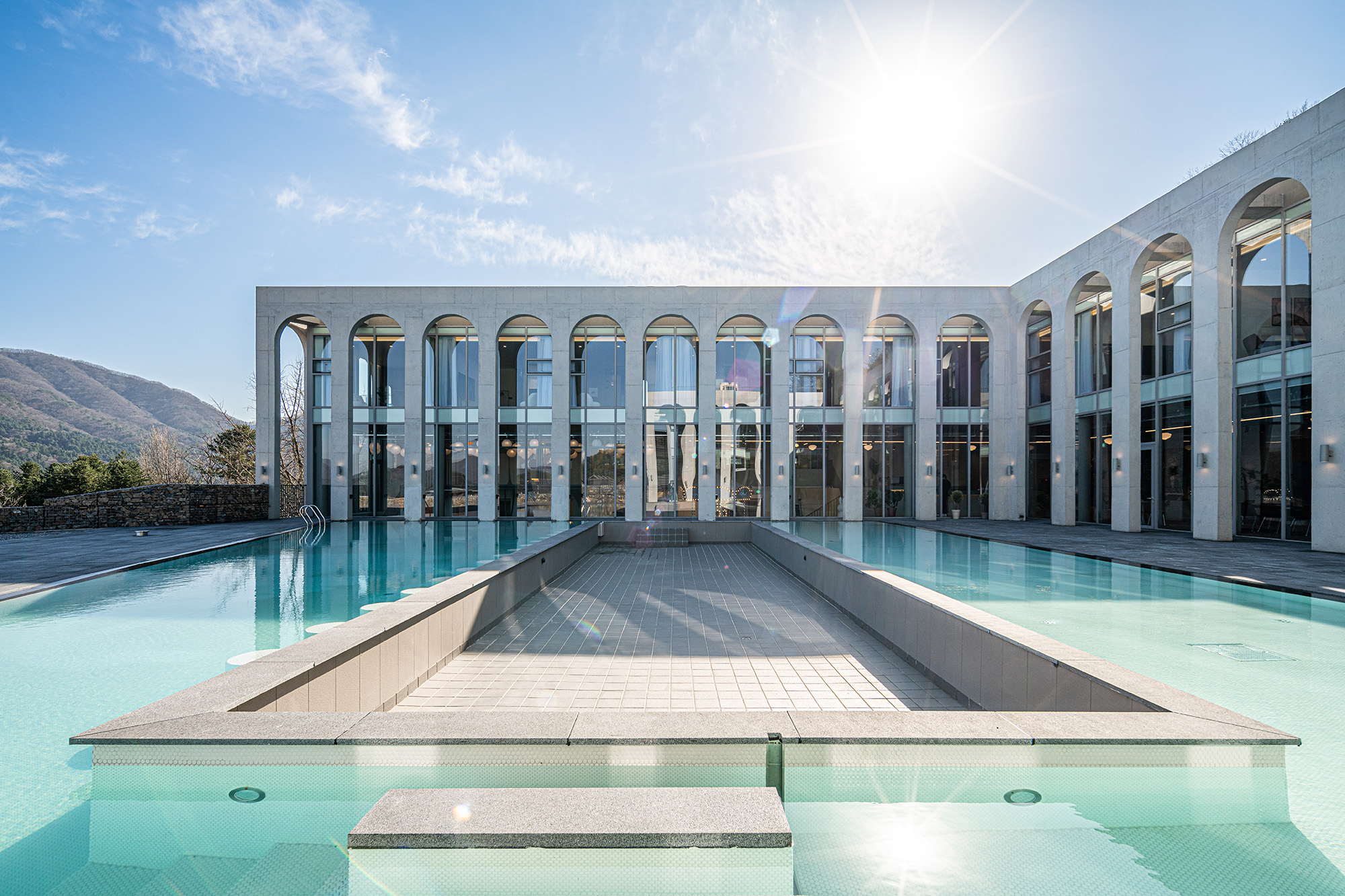 The solid and rugged materiality of exposed concrete, combined with the repetitive arch pattern, has been used to create a unique external space. The view, starting from the central space and passing through a small garden, allows guests to linger and appreciate the exceptional scenery of Chukryeong Mountain, embracing the Morning Calm Arboretum. It provides users with a momentary escape, allowing them to have a contemplative time.