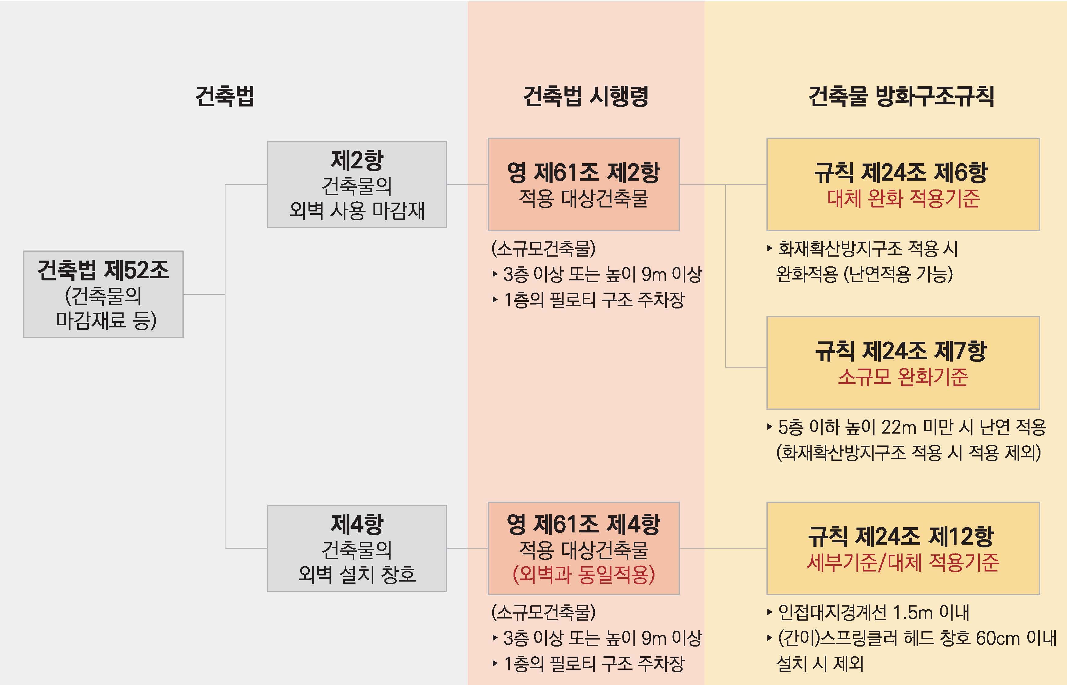 다만, 해당 법을 적용하는 대상의 범위에 서로 기준이 다르다는 점에 대해서는 재고해 볼 필요가 있다. 「건축법 제52조(건축물의 마감재료 등)」의 제2항은 ‘건축물의 외벽’에 대해서, 제4항은 ‘외벽에 설치되는 창호’에 대해 같이 언급하고 있다. 그리고 시행령 제61조(건축물의 마감재료 등)에서는 건축물의 외벽 및 창호 모두 같은 적용 대상을 정하고 있는데, 우리가 살펴보고자 하는 소규모 건축물은 시행령 제2항 제3호 ‘3층 이상 또는 높이 9미터 이상인 건축물’이 해당된다. 그리고 세부기준, 대체적용 기준 및 완화기준 등을 정한 「건축물방화구조규칙」을 살펴보면 ‘건축물의 외벽’에 대해서는 화재확산방지구조의 적용 여부에 따라서 외장재의 등급을 완화 받거나, 5층 또는 높이 22m 미만 시에는 난연등급의 외장재를, 여기에 화재확산방지구조까지 더하여 적용한다면 난연등급도 없는 일반 외장재도 적용 가능하도록 하고 있어 법의 취지를 지키면서도 소규모건축물 각각의 상황에 따라 적용할 수 있는 선택을 주고 있다. 반면, ‘외벽에 설치되는 창호’, 방화창에 대해서는 인접대지경계선 1.5m 이내 시 적용이 되며, (간이)스프링클러 헤드가 창호 60cm 이내 설치시 제외할 수 있도록 대체 적용기준을 두고 있다.