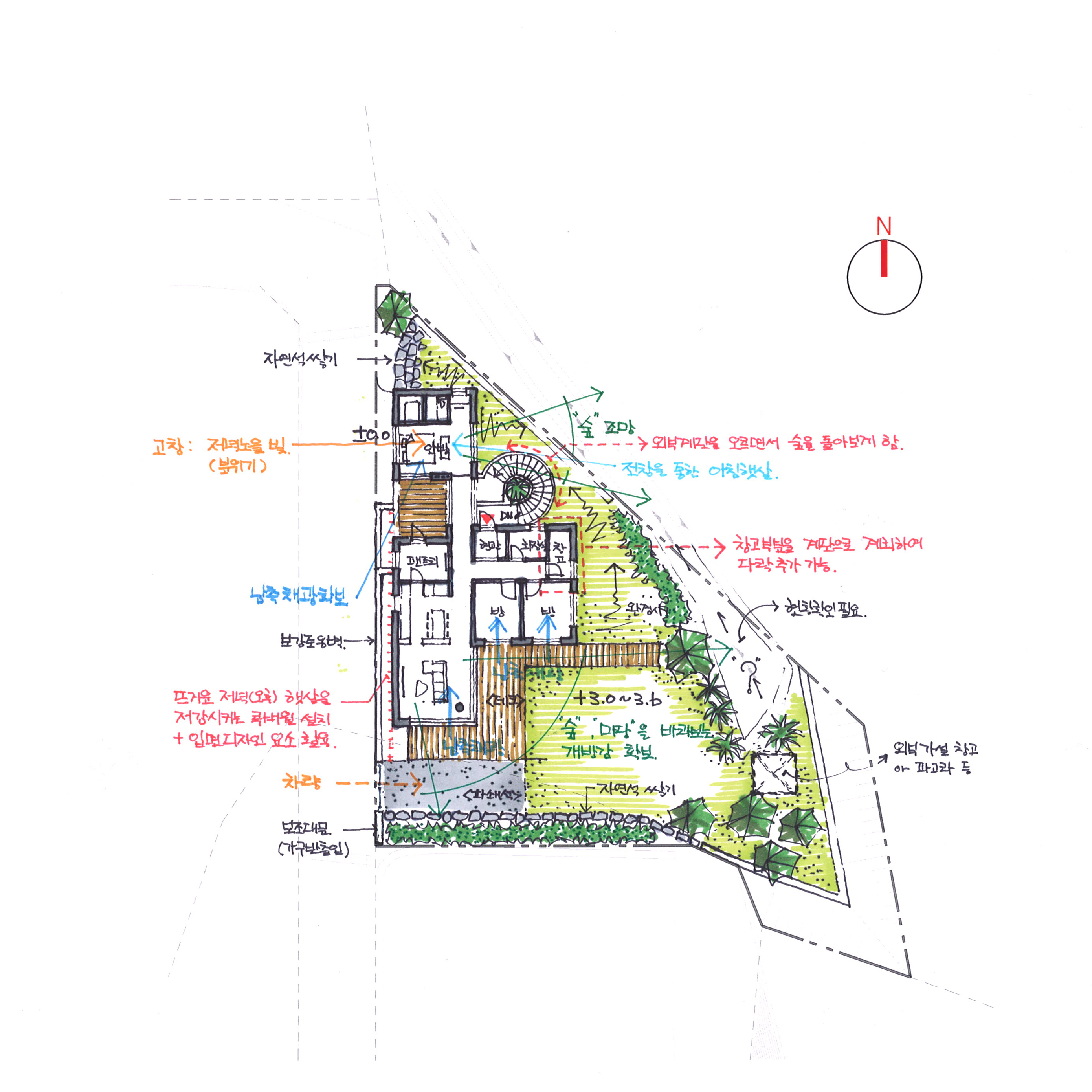 건축적 내용을 소통하기 위한 기본적인 수단이 되는 것은 바로 도면이라고 할 수 있을 겁니다. 하지만 일반인들이 전문적인 기호와 이를 통해 공간을 해석해낸 도면을 이해하기는 쉽지 않습니다. 그래서 스케치를 많이 활용하는 편입니다. 디자인을 보여주는 스케치, 개념 스케치, 그리고 평면계획 스케치 등 직접 그린 스케치를 활용해보니 건축주들의 이해를 도울 수 있었고, 특히 설계의도는 정보만 있는 도면보다 잘 드러낼 수 있는 방법이 되기도 해서 현재도 가장 좋아하는 나름의 노하우가 되고 있습니다.
