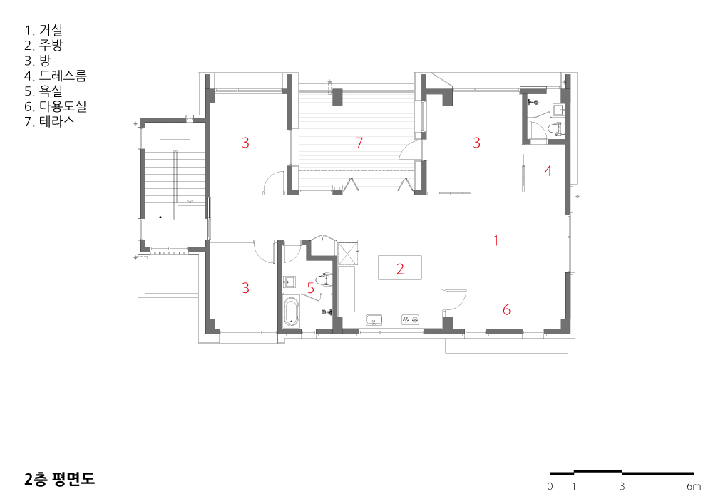 2층은 주로 주택공간이 들어서있다. 주방과 식당 앞으로는 넓은 데크공간이 나와 외부 와의 관계를 가깝게 했다.