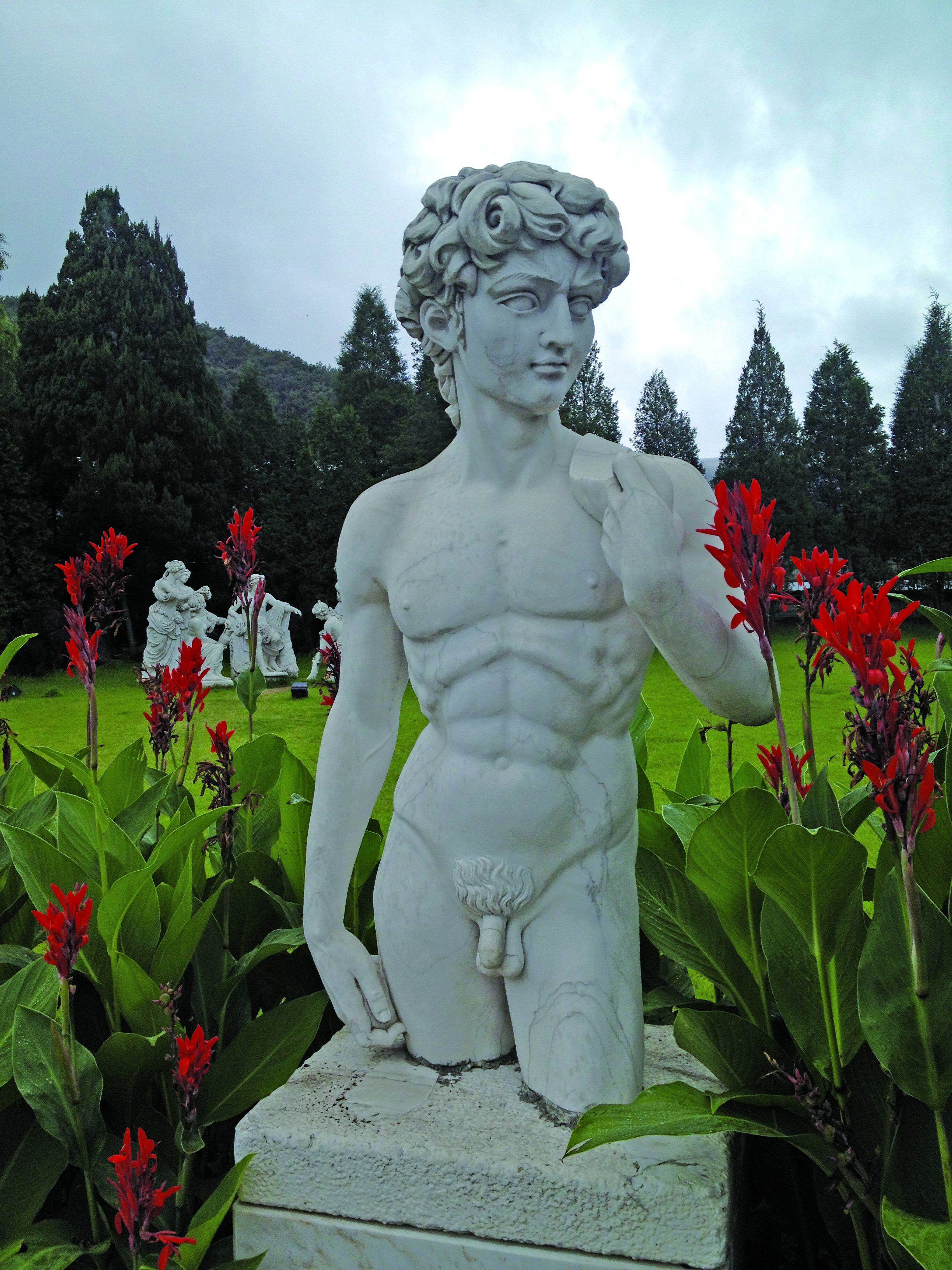 하지만 이발소 그림은 자연에 대한 연구나 성찰 없이, 게다가 솜씨도 없이 바로 로랭풍의 그림을 모방한다.<사진 3> 여기서 로랭풍이라는 것은 이상향의 자연이다. 한국의 이발소 그림이 로랭풍의 그림(로랭풍의 키치는 서양에도 많다)과 다른 것은 한국적 요소를 추가했다는 사실이다. 정자, 초가집, 물레방아, 섶다리, 소나무, 나룻배 같은 것들이다. 여기에 한국의 산수화나 민화 양식을 슬쩍 섞어놓는다. 자연에 대한 연구가 전혀 없어서 그림 속 정자나 다리, 폭포 같은 요소들의 등장이 뜬금없고 부자연스럽다. 각 요소들 사이의 비례와 원근법도 엉망이다. 로랭은 자연을 모방하지만 이발소 그림들은 자연을 모방한 그림을 모방한다. 이렇듯 이발소 그림, 즉 키치의 태도는 모방의 모방이다. 따라서 대상에 대한 본질에 다가갈 수 없다. 지방의 어느 조각공원에 미켈란젤로의 다비드를 흉내 낸 조각이 있다.<사진 4> 이 조각 역시 실제 인체를 보고 그것을 묘사한 것이 아니라 이미 인체를 모방한 대가의 조각을 모방한 것이다. 따라서 필연적으로 모방의 모방인 인체는 진실성이 사라지고 가짜 몸이 만들어져 우스꽝스럽기 이를 데 없다.