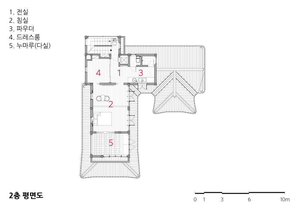 The second floor, "Yoonijae," is the residence of the homeowner. It features a simple layout centered around two bedrooms, with a powder room, bathroom, dressing room, and tea room. Since various cooking, dining, laundry, and storage functions are handled by the underground first-floor "Nodilmalu," this structure is made possible.