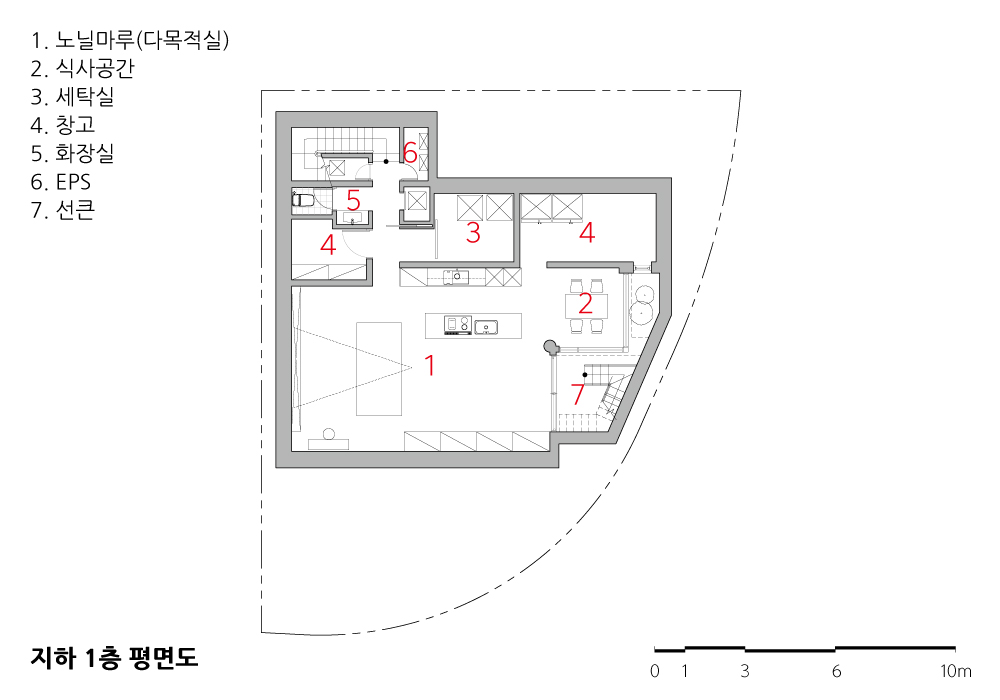 지하층 노닐마루는 지상 1·2층에 있는 3채의 집들을 지원하는 서비스 공간이다. 이리루 연면적의 약 40% 정도를 차지하는 크기다. 접근은 실내 계단과 외부 썬큰으로 난 작은 계단을 통해서 가능하다. 널찍한 현대식 아일랜드 주방과 AV시스템이 갖춰진 노닐마루는 이름 그대로 손님을 맞이하고 요리를 하거나 영화를 보면서 휴식을 취하는 널찍한 유희 공간이다. 노닐마루의 식사공간은 특별하다. 누마루의 단면구조를 이용해 층고를 높게 만들었고, 썬큰 방향으로 전면창을 설치해 개방감을 극대화했다. 이는 날씨 좋은 날에는 따스한 햇살을, 비가 오는 날에는 비를 내려 이곳이 지하 공간임을 잠시 잊게 한다. 세탁실은 살림집과 게스트 하우스에 나오는 작지 않은 양의 세탁물들을 처리할 수 있도록 충분한 크기로 계획했고, 종류별로 분리 보관할 수 있는 크고 작은 창고를 만들었다.