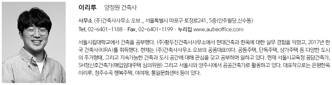 | 이리루 설계자 | 양정원 _ (주)건축사사무소 오브 건축주 | 이윤정 감리자 | 양정원 _ (주)건축사사무소 오브 시공사 | 김호준 _ (주)현영종합건설 대지위치 | 서울특별시 은평구 연서로50길 11-44 주요용도 | 단독주택 대지면적 | 229.00㎡ 건축면적 | 98.14㎡ 연면적 | 281.47㎡ 건폐율 | 42.78% 용적률 | 72.14% 규모 | B1F - 2F 구조 | 한식목구조 + 철근콘크리트구조 외부마감재 | 목재, 스터코플렉스, 한식기와 내부마감재 | 한식벽지 설계기간 | 2018. 05 – 2018. 12 공사기간 | 2019. 02 – 2021. 08 사진 | 박영채, 박기훈 _ 아크팩토리 구조분야 | (주)이든구조컨설턴트 기계설비분야 | (주)이래엠이씨 전기분야 | 삼설엔지니어링 |