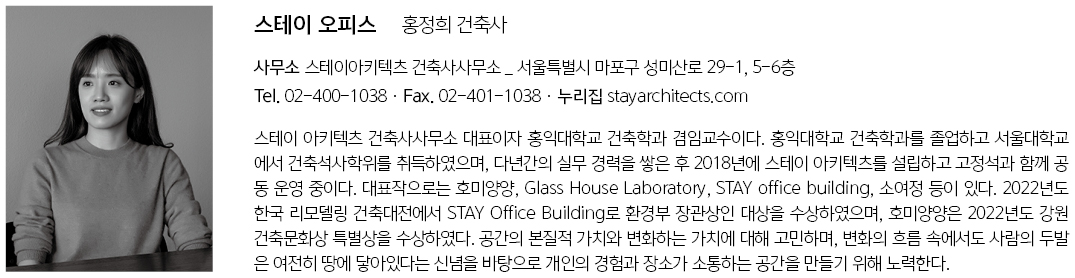 | 스테이 오피스 설계자 | 홍정희 _ 스테이아키텍츠 건축사사무소 건축주 | 스테이아키텍츠 건축사사무소 감리자 | 스테이아키텍츠 건축사사무소 시공사 | (주)도담종합건설 설계팀 | 고정석, 김판수 설계의도 구현 | 스테이아키텍츠 건축사사무소 대지위치 | 서울특별시 마포구 성미산로 29-1 주요용도 | 근린생활시설 대지면적 | 232.20㎡ 건축면적 | 139.23㎡ 연면적 | 587.83㎡ 건폐율 | 59.96% 용적률 | 253.16% 규모 | 6F 구조 | 철근콘크리트구조 외부마감재 | 벽돌마감 내부마감재 | 원목마루, 도장 설계기간 | 2021. 02 - 2021. 07 공사기간 | 2021. 08 - 2021. 01 사진 | 홍기웅 구조분야 : 서전구조 기계설비분야 | (주)세원엔지니어링 전기분야 | (주)세원엔지니어링 조경분야 | 스타일지음 |