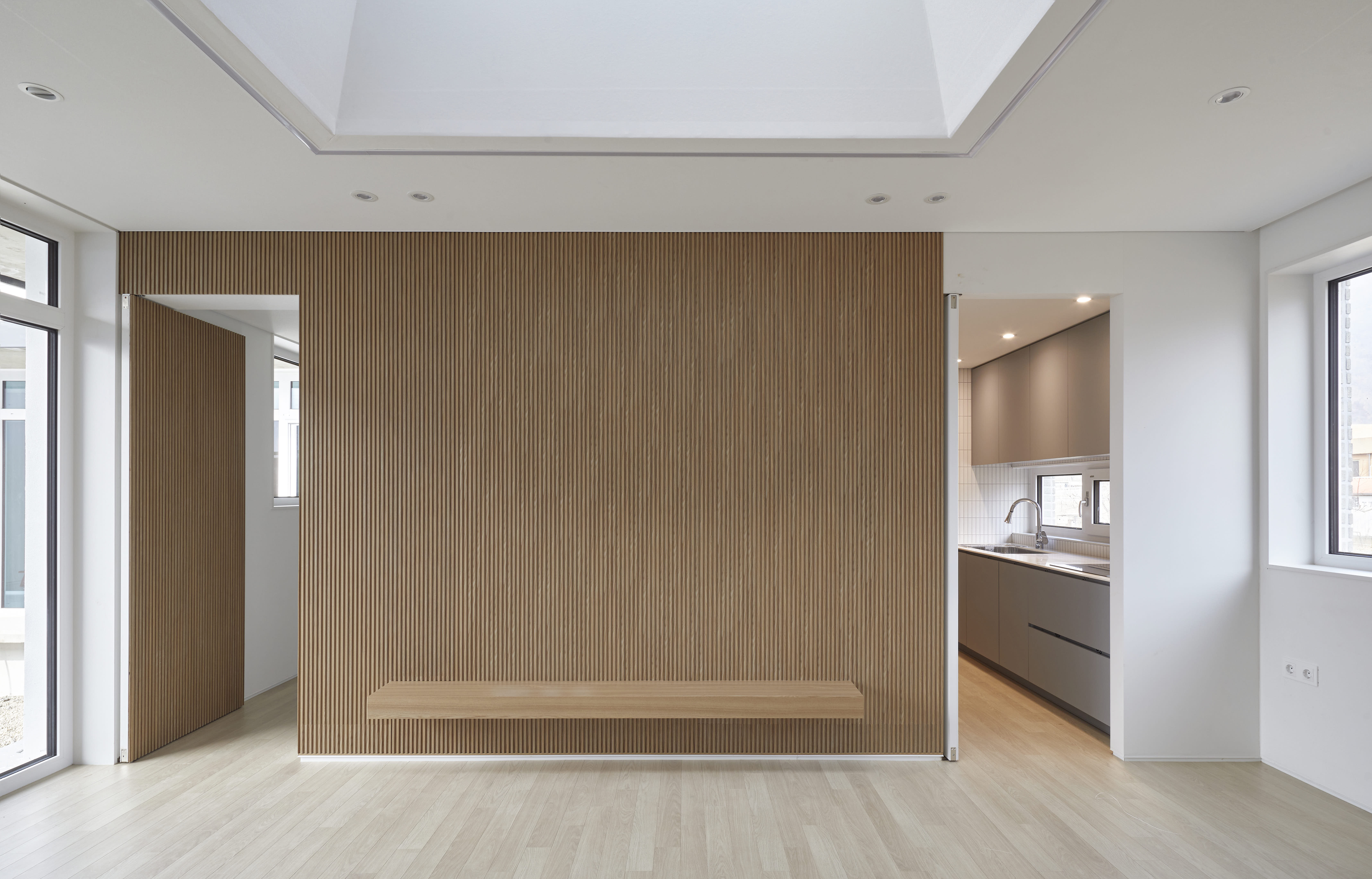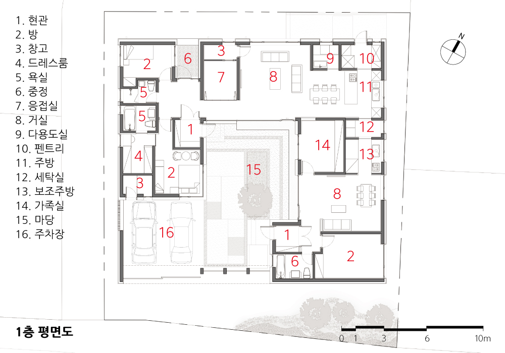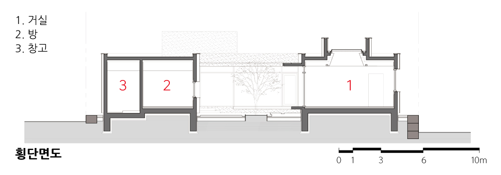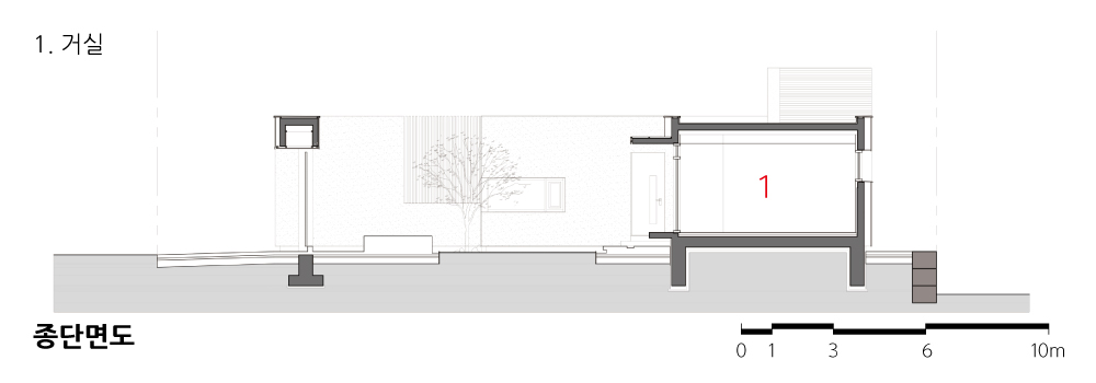 대지 주변에는 건물이 없고 시각적으로 수평적인 느낌이 강해서 땅 위로 구축되는 네모난 집이 주변과 잘 어우러질 수 있도록 낮고 넓게 계획했다. 낮고 넓게 만들어진 이 집은 가운데 마당을 두어 시간대와 상관없이 충분한 양의 채광이 가능하고, 곧 마당을 향해 시원하게 열린 두 곳의 거실에 자연스럽게 유입된다. 마당을 중심으로 서측에는 안채라고 할 수 있는 부모님의 거주공간이 배치되었고, 동측으로 부모님께 집을 지어드린 아들의 공간이 만들어졌다.