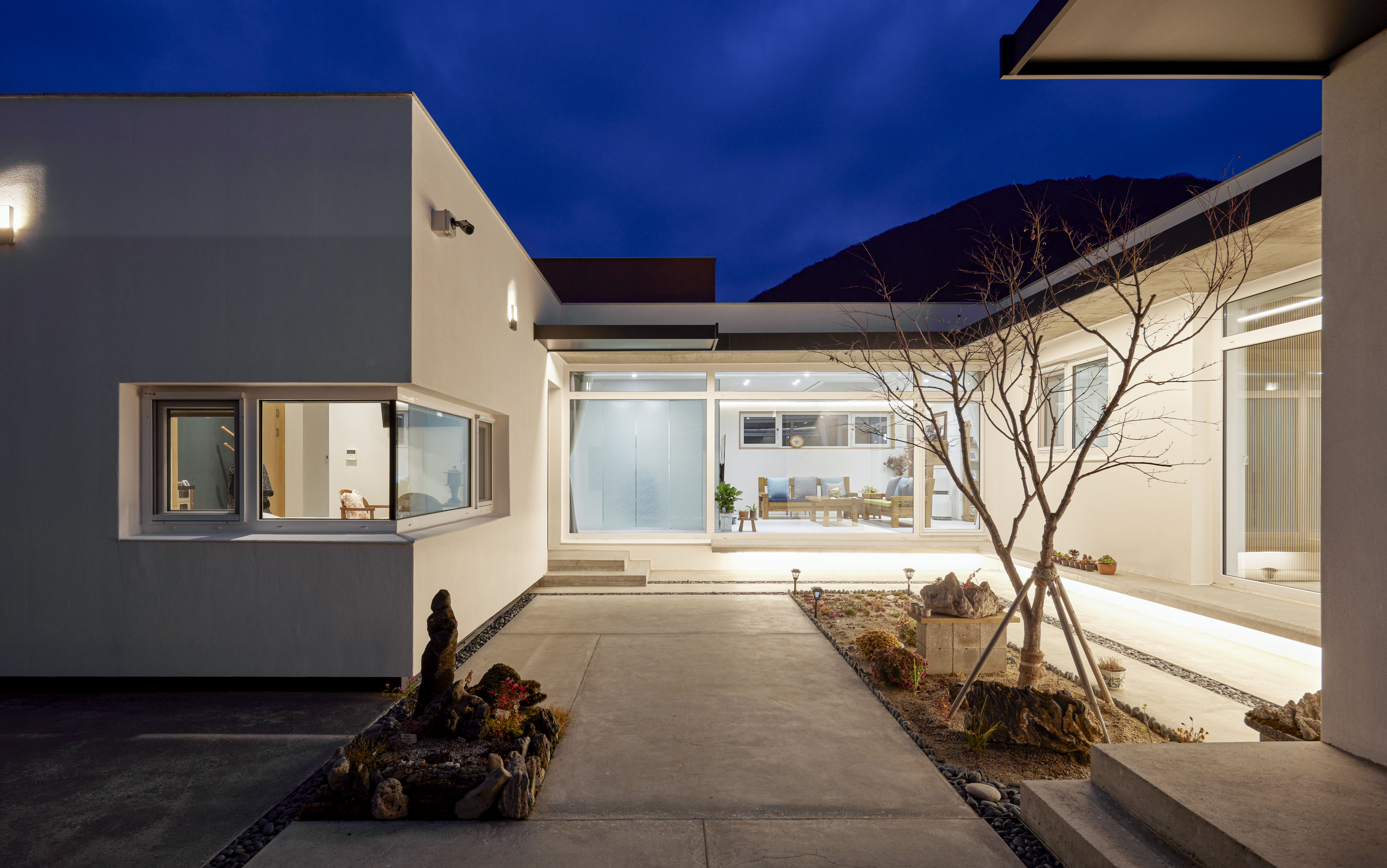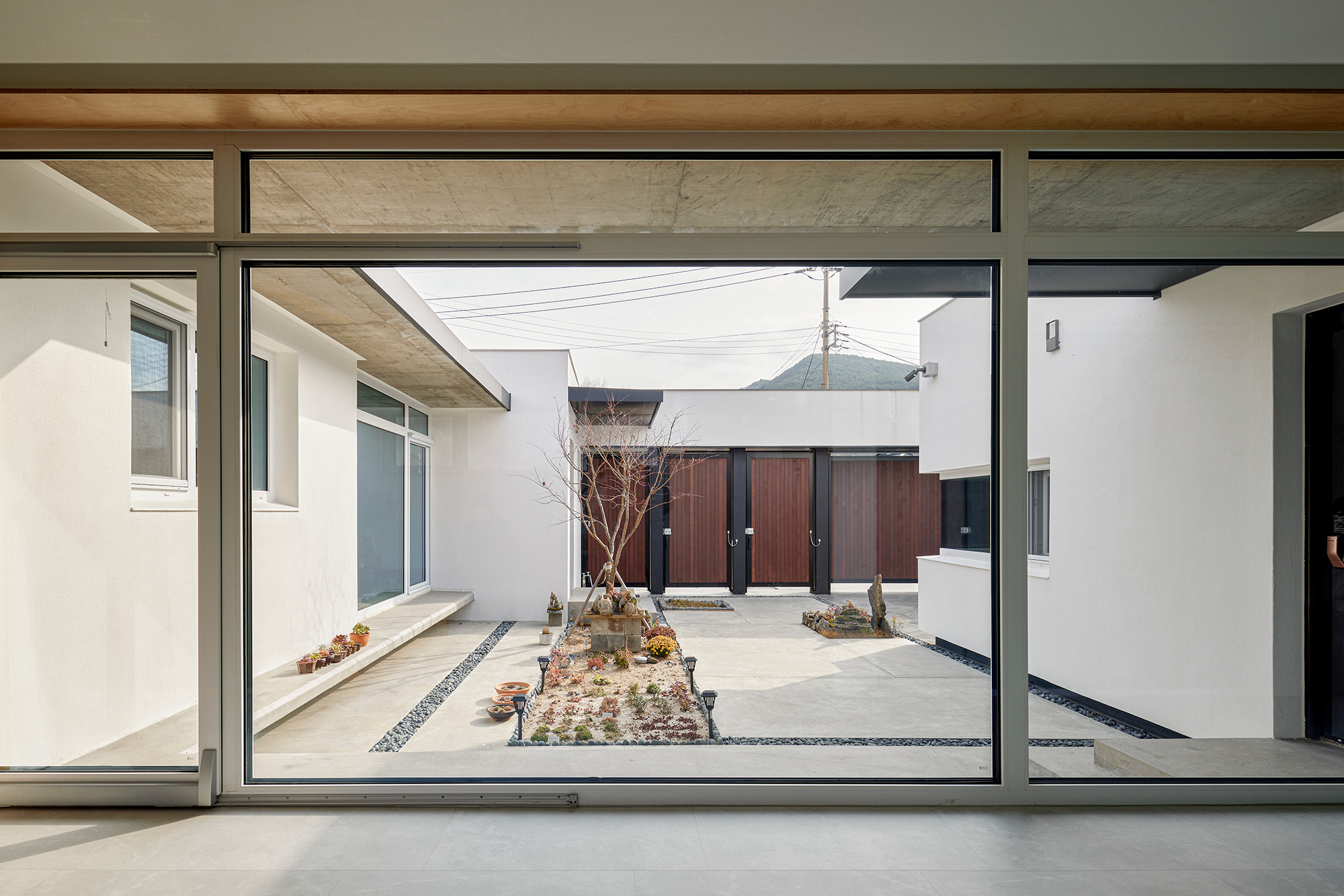 마당에는 거실과 연결된 콘크리트 툇마루를 두어 가족들이 서로 편안하게 소통할 수 있는 공간으로 활용될 수 있는 장치를 마련했다. 또한 부모님과 아들의 거실은 마당을 향해 열어두어 서로 바라볼 수 있도록 하고, 각자의 방은 채광과 환기에 필요한 창만 확보하여 가족 간의 프라이버시도 지켜질 수 있게 했다.