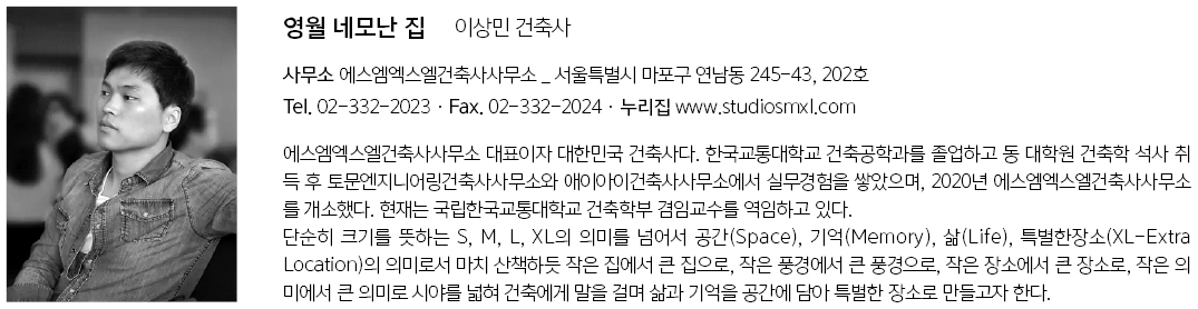 | 영월 네모난 집 설계자 | 이상민 _ (주)에스엠엑스엘건축사사무소 감리자 | (주)에스엠엑스엘건축사사무소 시공사 | 김동용 _ 에스엠엑스엘건설 설계팀 | 신정훈 설계의도 구현 | (주)에스엠엑스엘건축사사무소 대지위치 | 강원도 영월 주요용도 | 단독주택 대지면적 | 481.00㎡ 건축면적 | 204.14㎡ 연면적 | 192.27㎡ 건폐율 | 42.44% 용적률 | 39.97% 규모 | 1F 구조 | 철근콘크리트구조 외부마감재 | 롱브릭타일, 외단열시스템, 투명로이삼복층유리 내부마감재 | 벽지, 장판, 강마루 설계기간 | 2020. 09 - 2021. 01 공사기간 | 2021. 06 - 2022. 06 사진 | 김한빛 _ 비지스튜디오 구조분야 | (주)아크필구조 기계·전기·통신분야 | (주)에스이앤씨 토목 | 국토엔지니어링 조경·인테리어 | (주)에스엠엑스엘건축사사무소 |