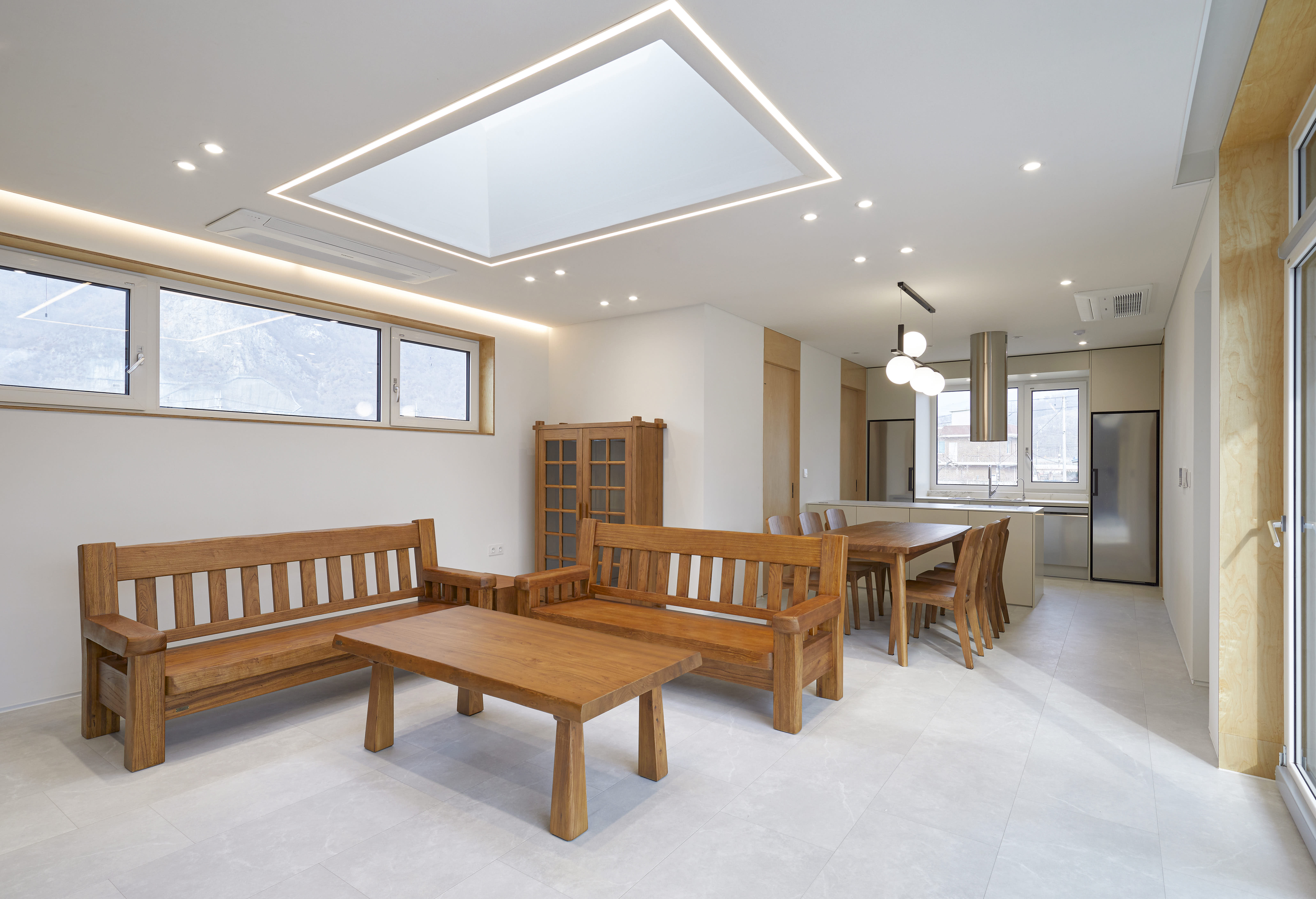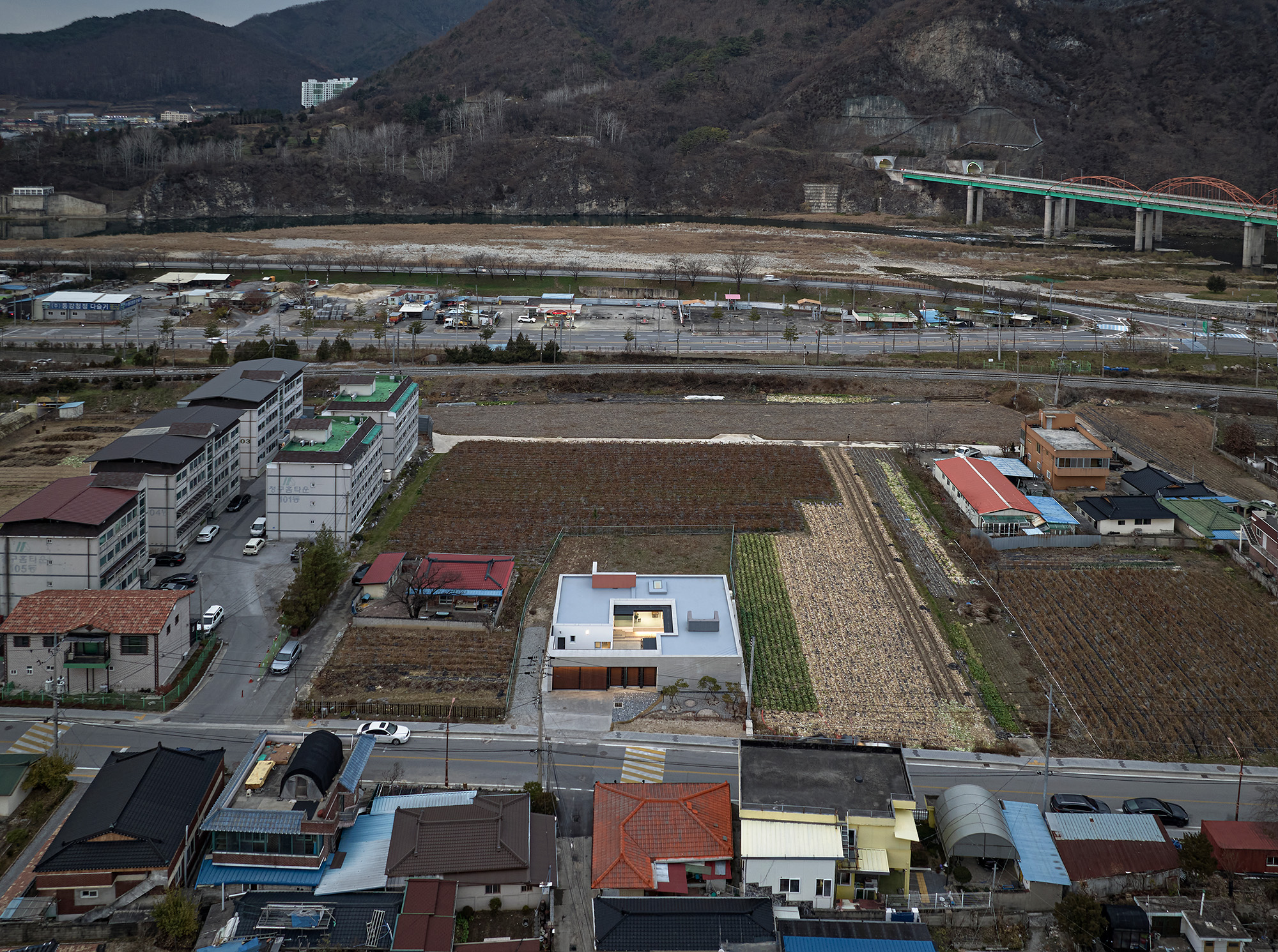 The “Square House” project in Yeongwol began when a son, who had dreamed of returning to the countryside, purchased land to build a house to live with his parents who had been living in his hometown village. Together with an architect the client surveyed many sites in the center of Yeongwol-eup (town) for about a year to find suitable land to build a house on, but he could not find the right place. The land he ultimately found and purchased is the site on which the house currently stands and although it was a bit further from the town center than he previously wanted, he was able build a house against a backdrop of scenic mountains and rivers spreading like a folding screen.