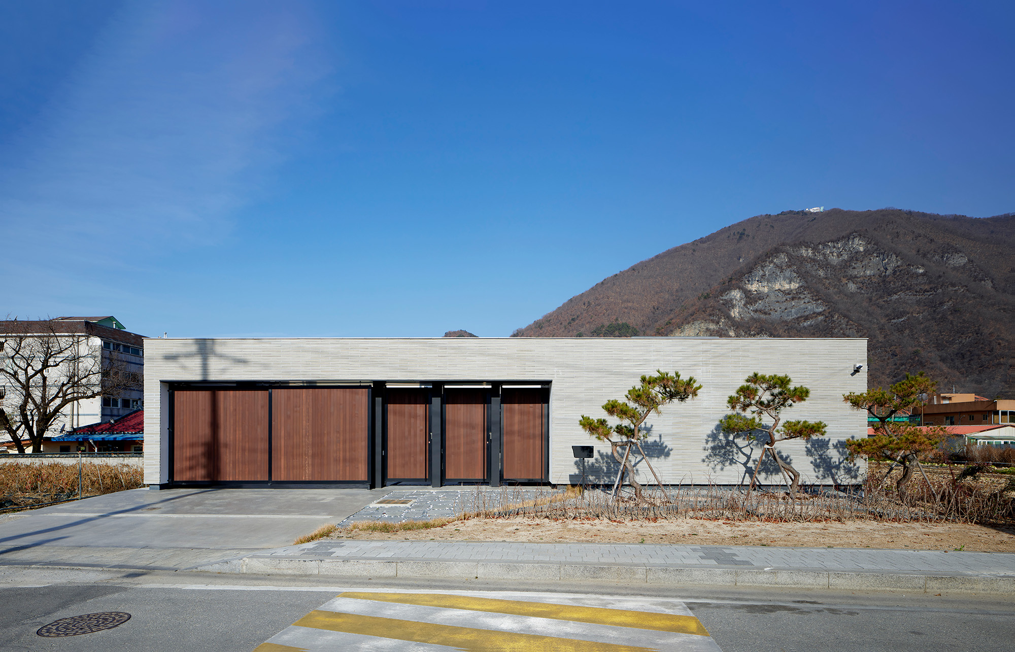 외장 마감은 크게 두 가지로 구성했다. 담장과 대문을 포함한 바깥벽은 회색 롱브릭타일로 마감하여 단단하게 집을 감싼 느낌을 강조했고, 대문 안쪽 마당에 면한 벽은 밝은 백색의 외단열시스템으로 마감해 포근하면서도 답답한 느낌이 들지 않도록 했다.
