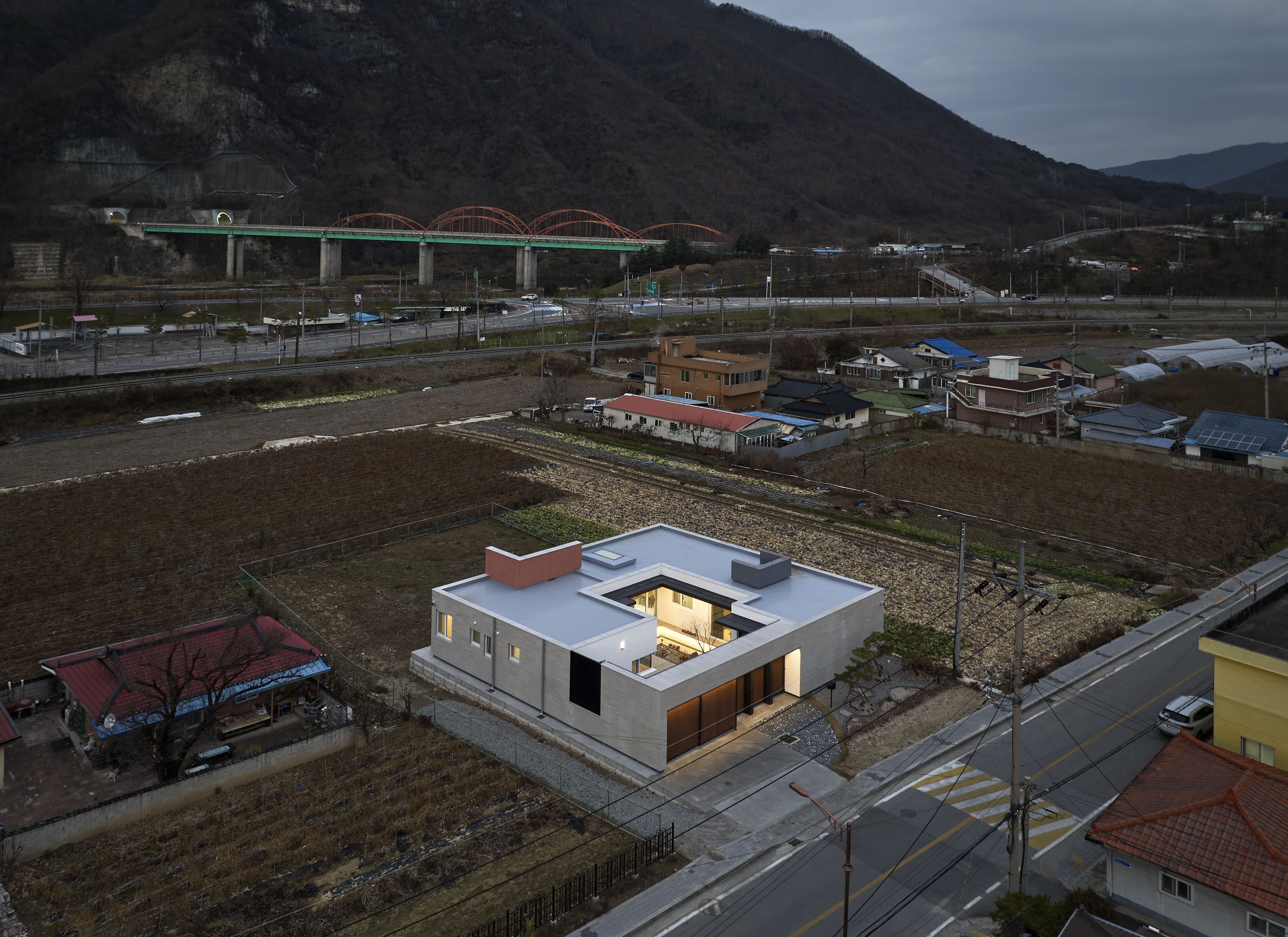 The “Square House” project in Yeongwol began when a son, who had dreamed of returning to the countryside, purchased land to build a house to live with his parents who had been living in his hometown village. Together with an architect the client surveyed many sites in the center of Yeongwol-eup (town) for about a year to find suitable land to build a house on, but he could not find the right place. The land he ultimately found and purchased is the site on which the house currently stands and although it was a bit further from the town center than he previously wanted, he was able build a house against a backdrop of scenic mountains and rivers spreading like a folding screen.