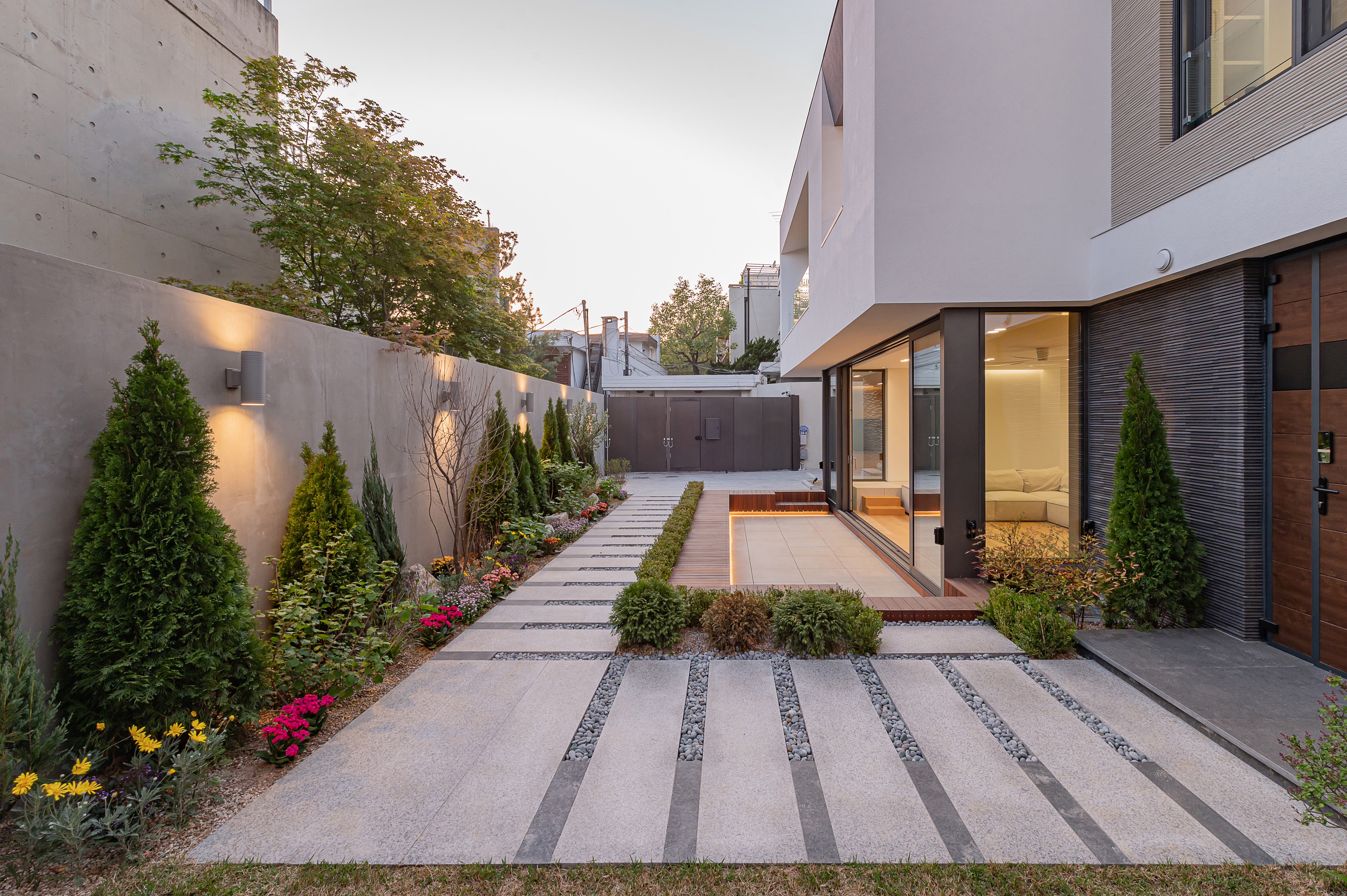 막다른 골목 끝 대문을 여는 순간, 견고하게 적층된 느낌의 세라믹타일 마감 위에 부유하는 정갈하고 단아하게 정리된 순백의 매스를 만나면서 비로소 비밀스러우면서도 차분한 ‘주거’ 공간으로의 경험이 시작된다. 마당까지 확장된 거실 공간을 지나 현관에 들어서면 계단이라는 오브제를 통해 후정까지 연속되는 연출된 개방감을 느낄 수 있다. 시야를 차단하는 구조체 없이 외부까지 연속되어 있는 거실과 주방은 메인 주거 영역으로서 최대한의 공간감을 느낄 수 있도록 계획되었다. 계단 위에 천창을 두고 2층 복도에 테라스 공간을 배치해 항상 막힘없는 시야와 다양한 선택적 기회가 제공되는 변화하는 공간감을 의도했다. 따스하고 차분한 분위기를 위해 내부 마감은 일관되게 목재와 백색마감으로 계획했다.