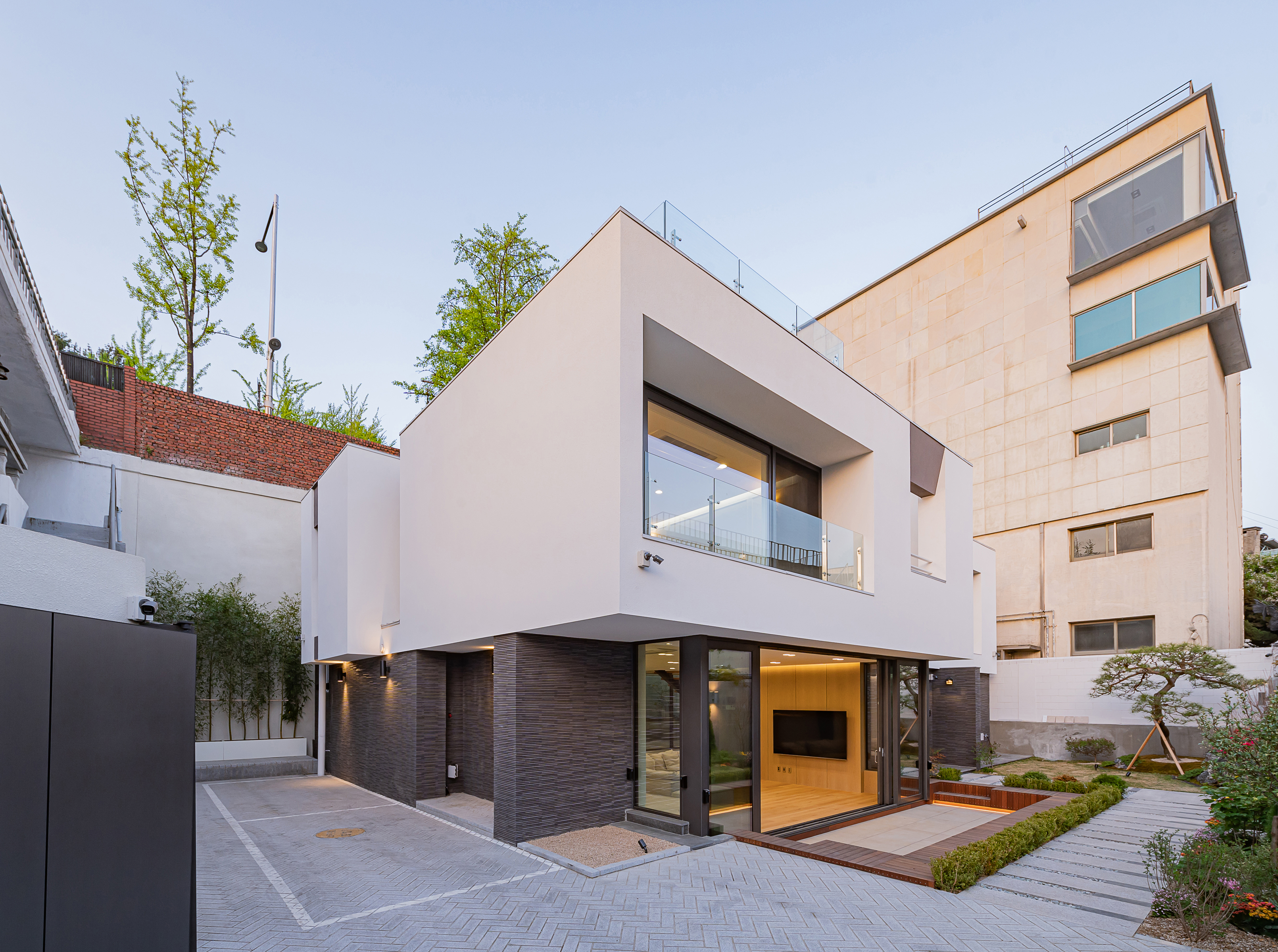 막다른 골목 끝 대문을 여는 순간, 견고하게 적층된 느낌의 세라믹타일 마감 위에 부유하는 정갈하고 단아하게 정리된 순백의 매스를 만나면서 비로소 비밀스러우면서도 차분한 ‘주거’ 공간으로의 경험이 시작된다. 마당까지 확장된 거실 공간을 지나 현관에 들어서면 계단이라는 오브제를 통해 후정까지 연속되는 연출된 개방감을 느낄 수 있다. 시야를 차단하는 구조체 없이 외부까지 연속되어 있는 거실과 주방은 메인 주거 영역으로서 최대한의 공간감을 느낄 수 있도록 계획되었다. 계단 위에 천창을 두고 2층 복도에 테라스 공간을 배치해 항상 막힘없는 시야와 다양한 선택적 기회가 제공되는 변화하는 공간감을 의도했다. 따스하고 차분한 분위기를 위해 내부 마감은 일관되게 목재와 백색마감으로 계획했다.