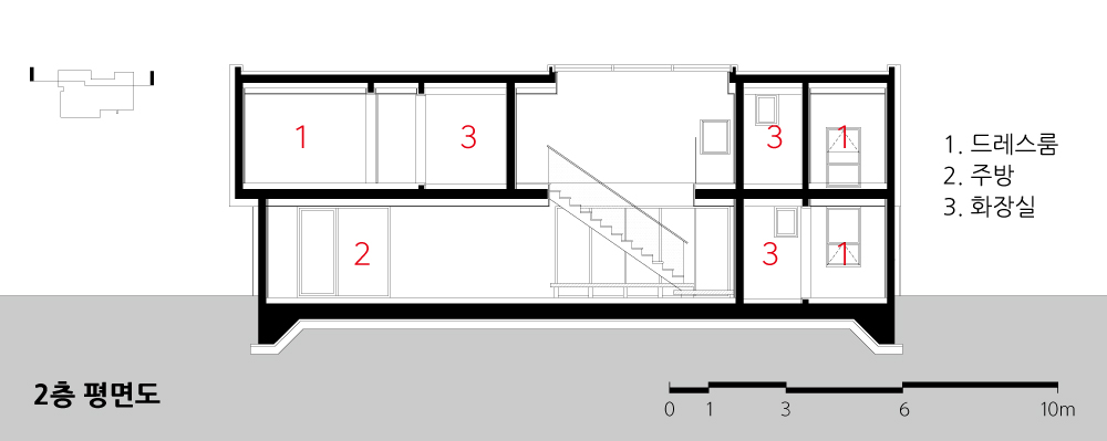 The planned site is quietly and secretly located at the end of a dead-end road in the northernmost residential area of Itaewon-dong, in front of Sowol-ro facing Namsan. Located under the 7m-tall retaining wall along Sowol-ro on the north side, the site was perfectly enclosed with the physical boundaries strongly determined by adjacent buildings, so the opportunity was given to fill a program of ‘Inhabitation’ in this site, which should be the most ‘private’.