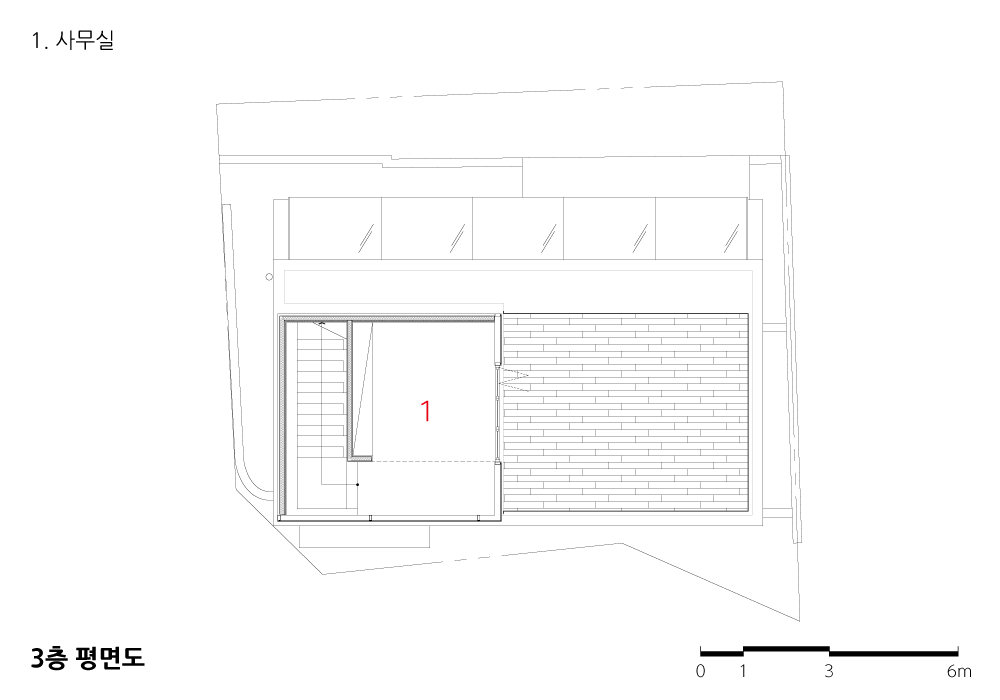 기존의 건물은 지하 1층에 지상 2층이었는데, 활용하기 어려운 지하를 메우고 대신 3층을 일부 증축하면서 옥상테라스를 만들었다. 건물의 1층에는 두 명의 대표가 쓰는 공간이 있고, 기타 탕비실과 화장실, 창고 등이 있다. 2층에는 약 14명의 직원들이 사용하는 주 사무공간이 있다. 마지막으로 증축한 3층 공간은 미팅 공간 겸 구성원들의 휴식을 위한 공간이며 테라스가 이어져 있다.