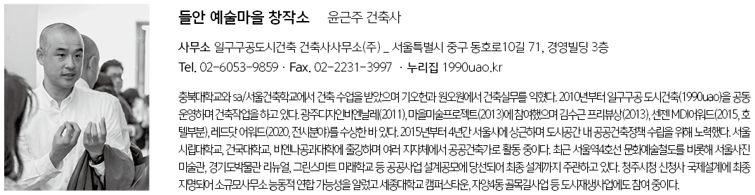 Deulan Art Village Anchor Facility Architect | Yoon, Geunju _ 1990uao Mladen Jadric _ Jadric Architektur ZT GmbH Client | Suseong-gu office Supervisor | OZH Architecture Project team | Na, Jihye / Choi, Hyeongsun / Nikolaus Punzengruber / Jakob Mayor / Nerea Garcia / Federica Rizzo Design intention realization | 1990uao Location | 84-12, Suseong-ro 12-gil, Suseong-gu, Daegu, Korea Program | Complex cultural facilities Site area | 223.20㎡ Building area | 133.00㎡ Gross floor area | 399.85㎡ Building to land ratio | 59.59% Floor area ratio | 179.14% Building scope | 4F Structure | RC Exterior finishing | Aluminum expanded metal (Intelsteel, KS D 3601) Interior finishing | Exposed concrete, Brick tile Design period | Aug. 2021 – Dec. 2021 Construction period | Jan. 2022 – Aug. 2022 Photograph | Namgung, Sun Structural engineer | Hub Structure Engineering Co., Ltd. Mechanical engineer | Jungin Mech. Eng. Consultants Electrical engineer | Daekyung Engineering |