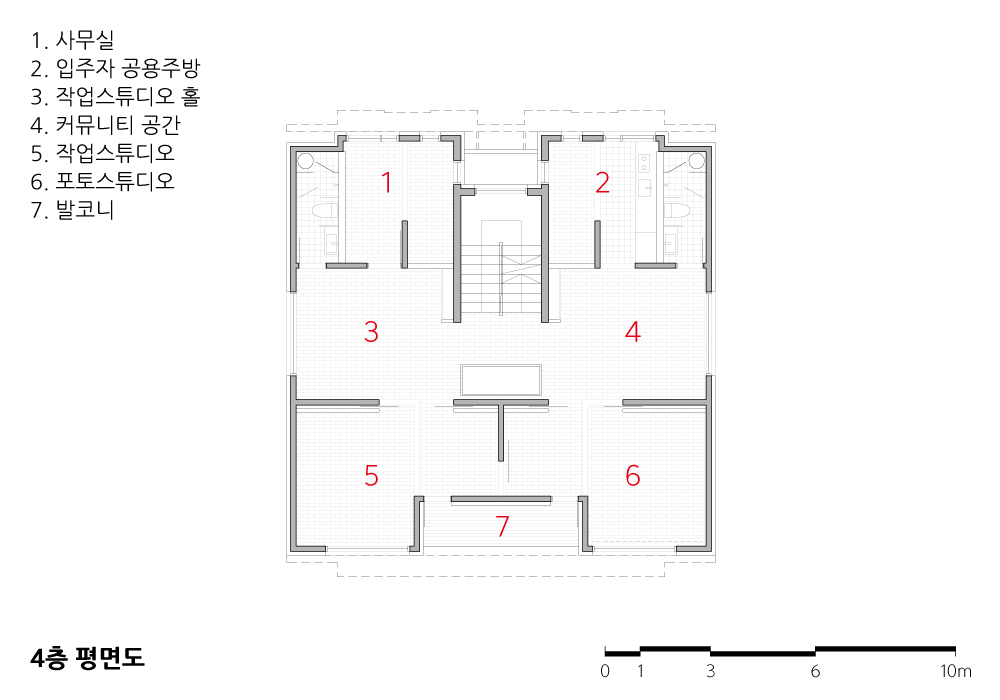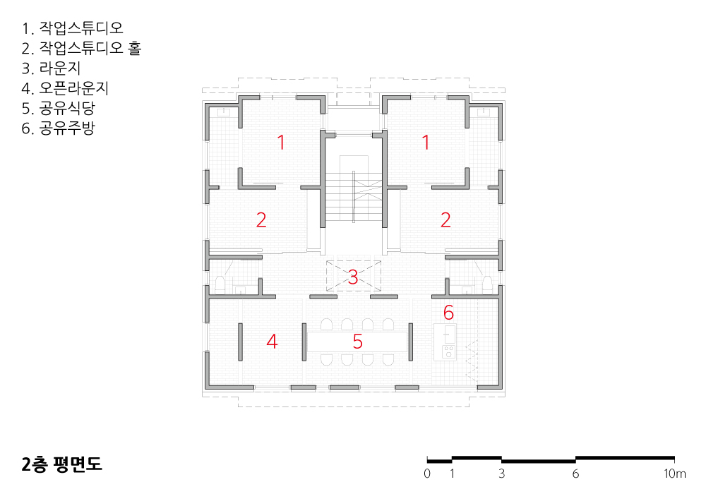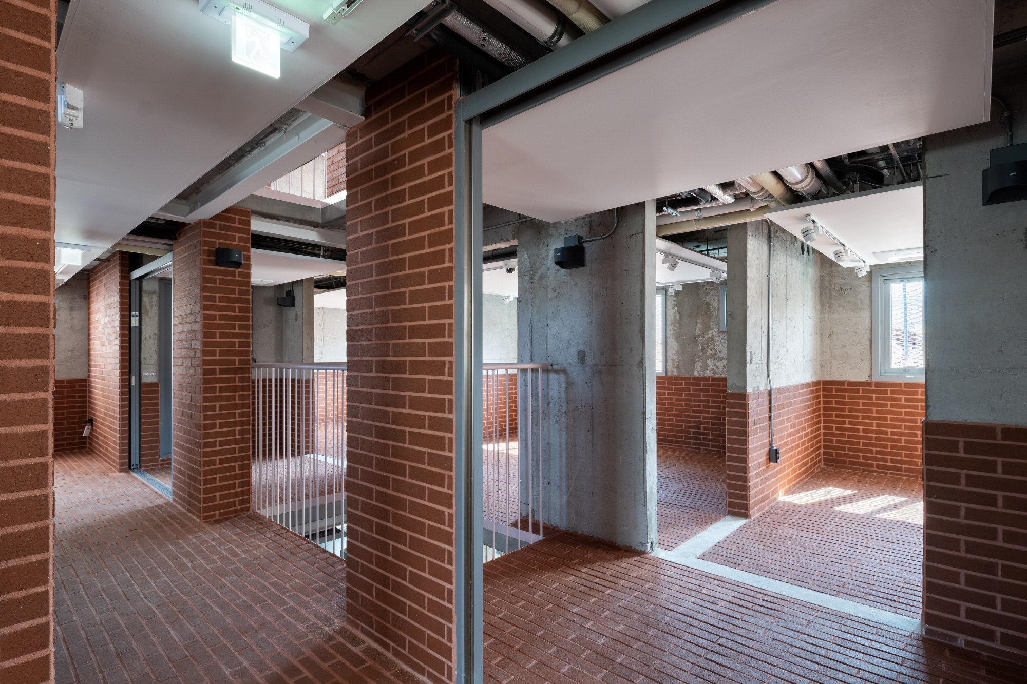 공원으로부터 이어지듯 공공 공간이 내부 연결되는 곳에는 되도록 재료와 색상을 외부와 비슷하게 적용했다. 공간 분위기의 연속성이 사용자와 방문자에게 느껴지도록 계획한 것이다. 체류시간이 길도록 내부 공간의 활용도를 높이는 동시에 특정인이 사적으로 완전 점유하지 못하도록 한 것은 공공시설의 공간 이용 딜레마를 고려한 것이다. 기존 건물은 주거단위가 다르고 계단의 층별 공용 공간도 크기가 같지 않다. 전체를 하나의 공간으로 연결하는 계단실에 공용 바닥 일부를 개방해 공간적 통합을 이루었다. 시선과 소리가 연속되는 단면적 개방감을 가진 건물은 즉각적으로 서로 간 소통이 가능하다.