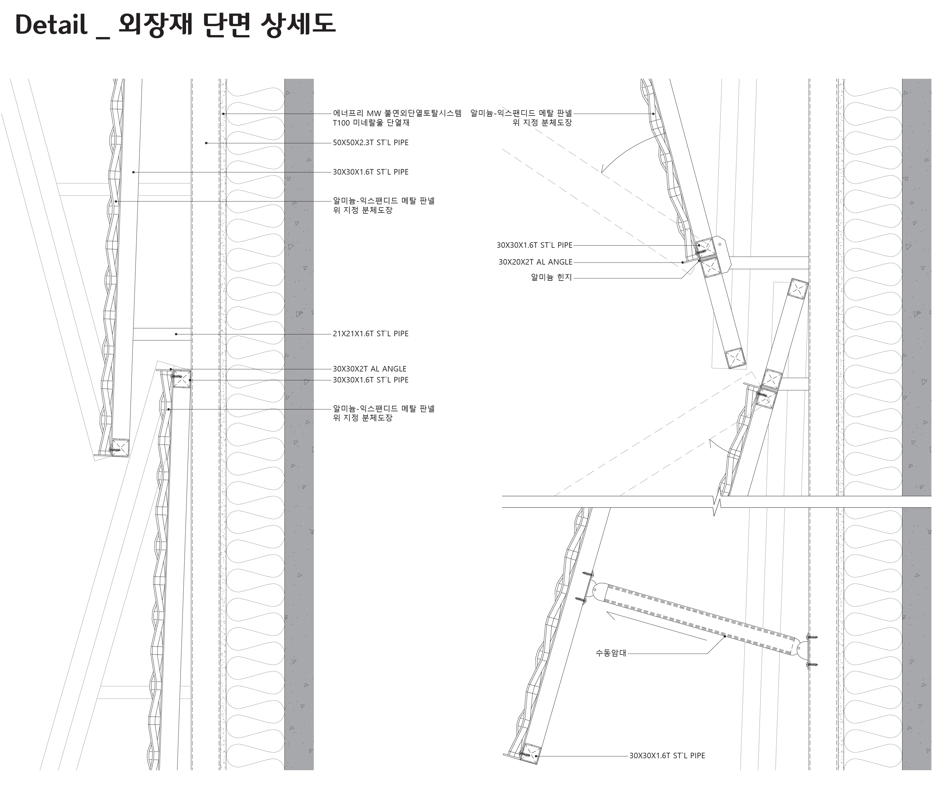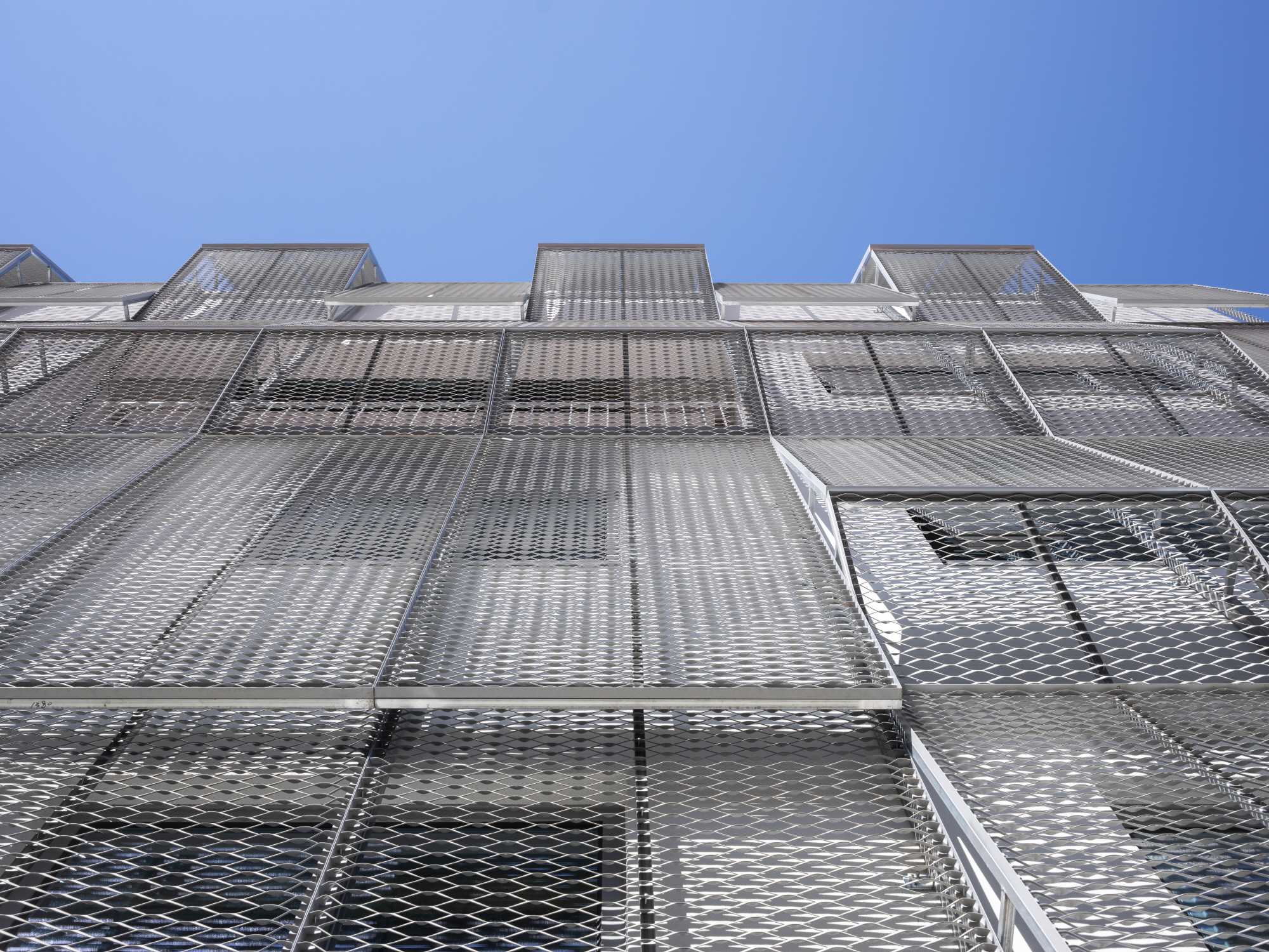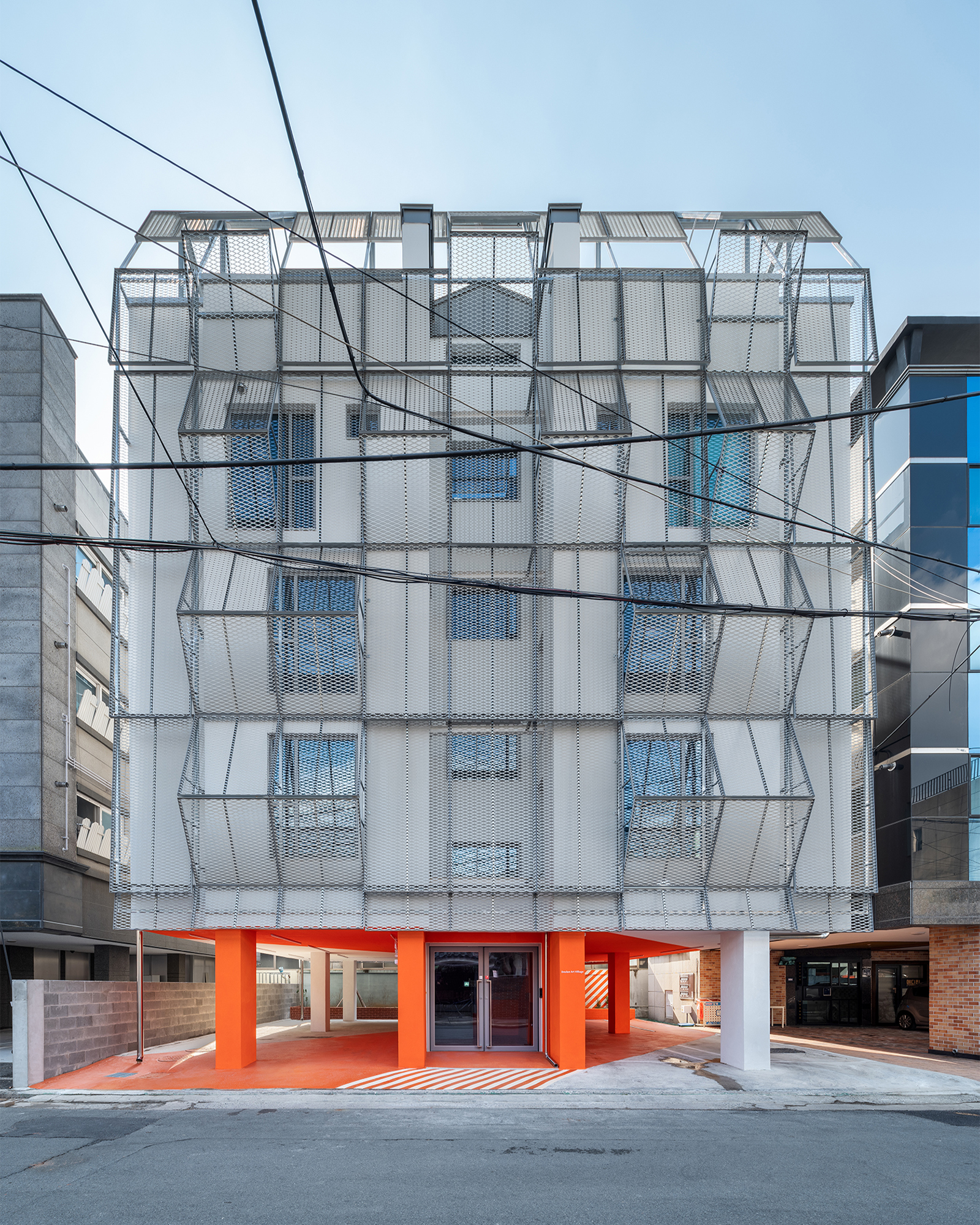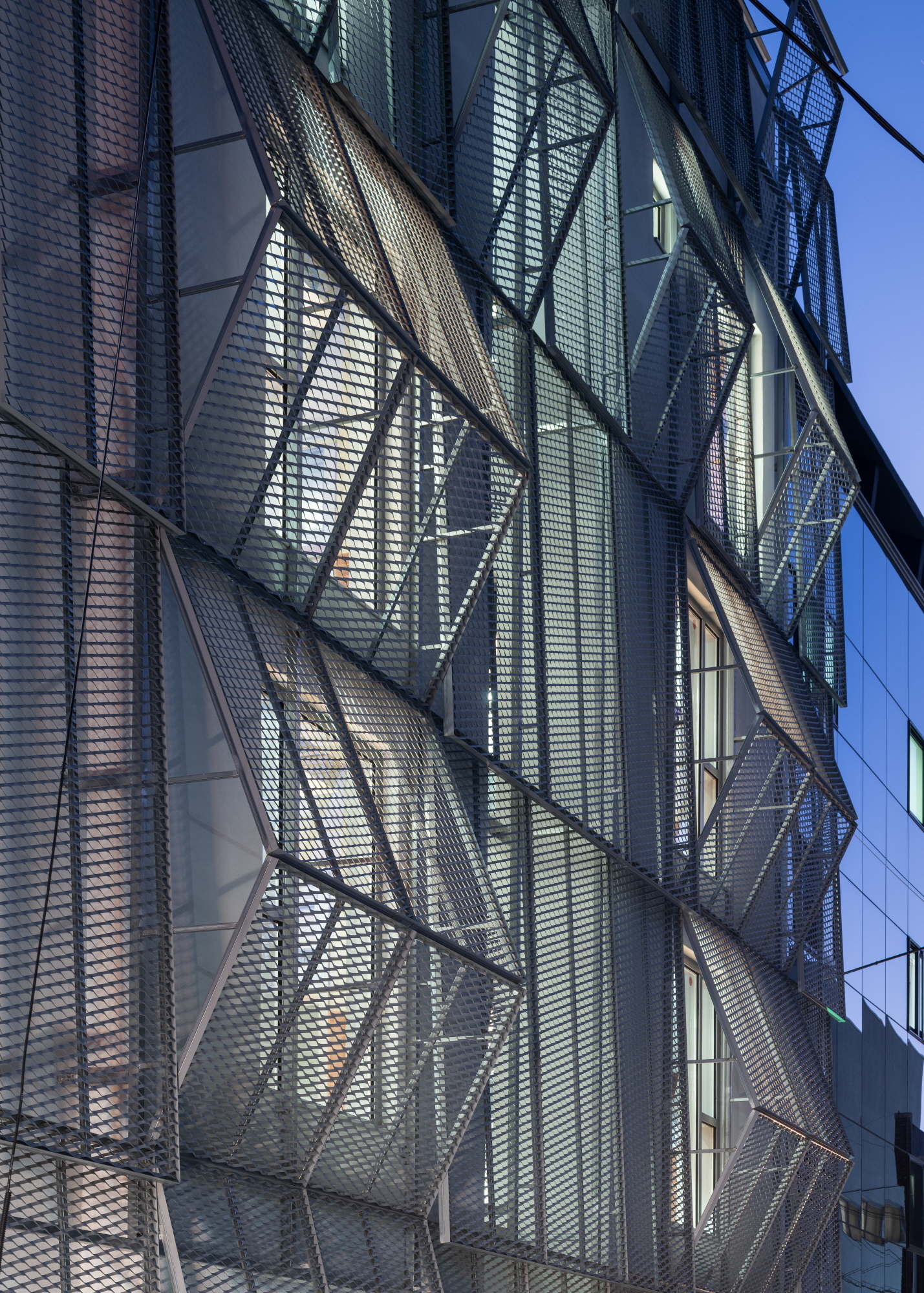 기존 건물에 새 모습을 덧씌운 개념을 표현하기 위해 내구성이 강한 알미늄-익스팬디드 메탈 판넬을 사용했다. 금속판에 틈을 주어 펼친 재료의 특성상 단면 접합이 어렵다. 내진 및 풍하중에 구조적 대응도 해야 하므로 접점을 수용하는 테두리 프레임을 사용했다. 둔탁해 보이지 않도록 디테일을 신경 쓰고 경사면의 고정을 위한 프레임도 잘 만들어야 한다. 외단열 시스템 바깥에 설치되므로 고정철물 설치 시 단열재 속 구체에 단단히 연결해야 한다. 단열재와 일정 간격이 유지되도록 금속 스페이서도 필요하다. 소방관 진입창이 설치되는 부분은 여닫을 수 있도록 만들었다. 통상의 경우 잠금되어 있지만, 긴급 상황 시 소방관들이 잠금장치를 해제하여 소방 활동을 위한 내외부 진·출입이 가능하다.
