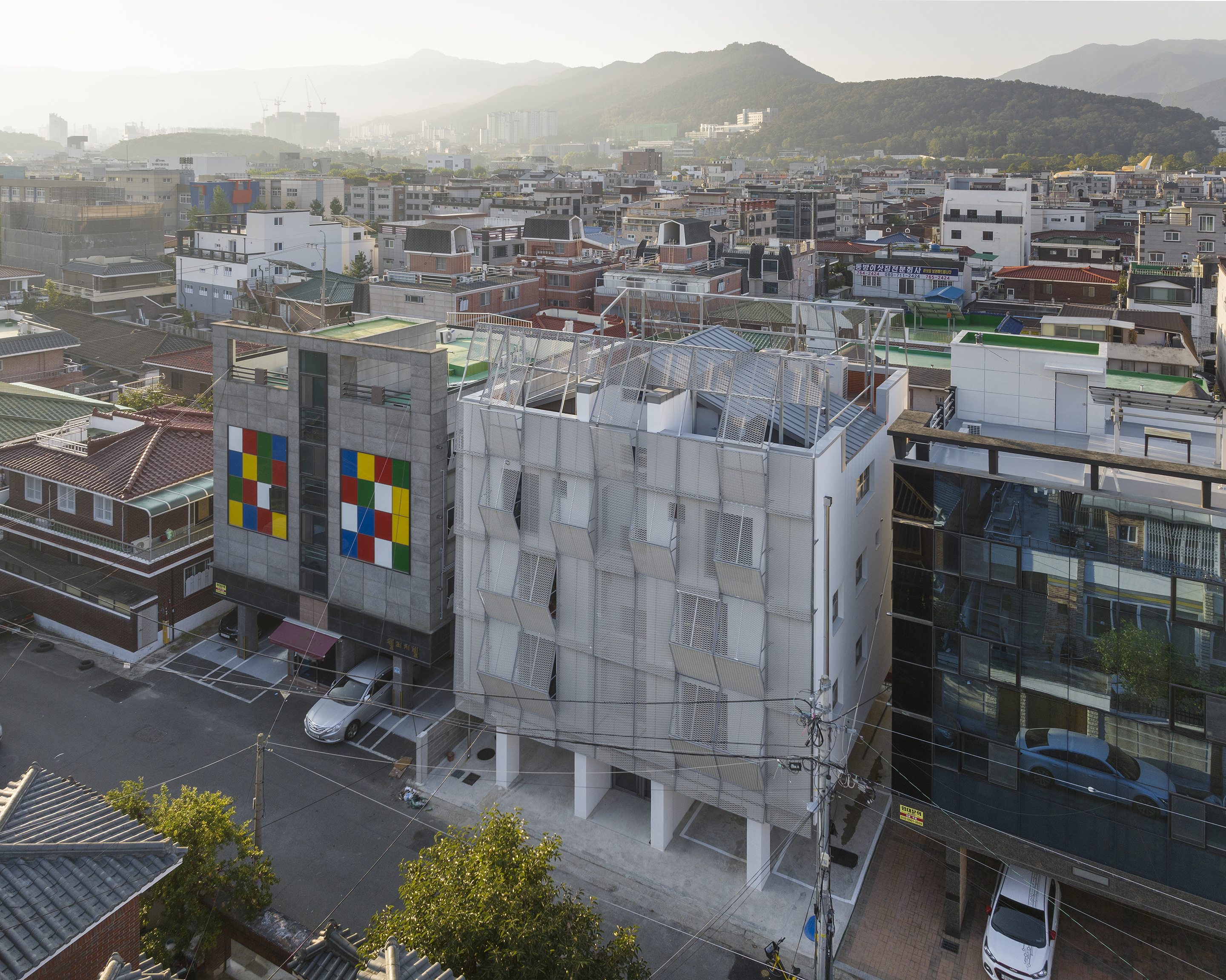 에너지효율이 떨어지는 기존 외피를 철거하고 가벼운 외단열 시스템으로 단열성능을 확보했다. 설치와 관리가 용이한 알루미늄-익스팬디드 메탈 판넬로 더블스킨 개념의 외피를 추가 설치했다. 기존 창호에 새로운 규칙을 덮지만 빛과 바람이 통하는 방식이다. 구간에 따라 열리고 닫히는 모습을 강조해 형상화했다.