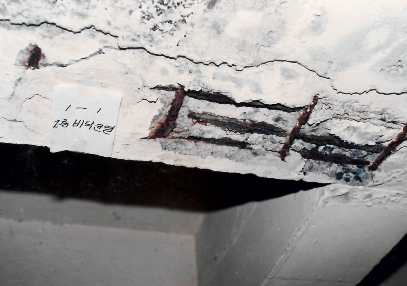 ○ 1990년 9월 14일 : 옥상방수공사 시공 중 RC조 슬라브에 구멍발생. 옥상 4층 건물하부, 3개 보 단부 처짐현상. 철근부식 및 콘크리트 강도 저하, 균열 등 노후로 인한 붕괴 위험성 제기