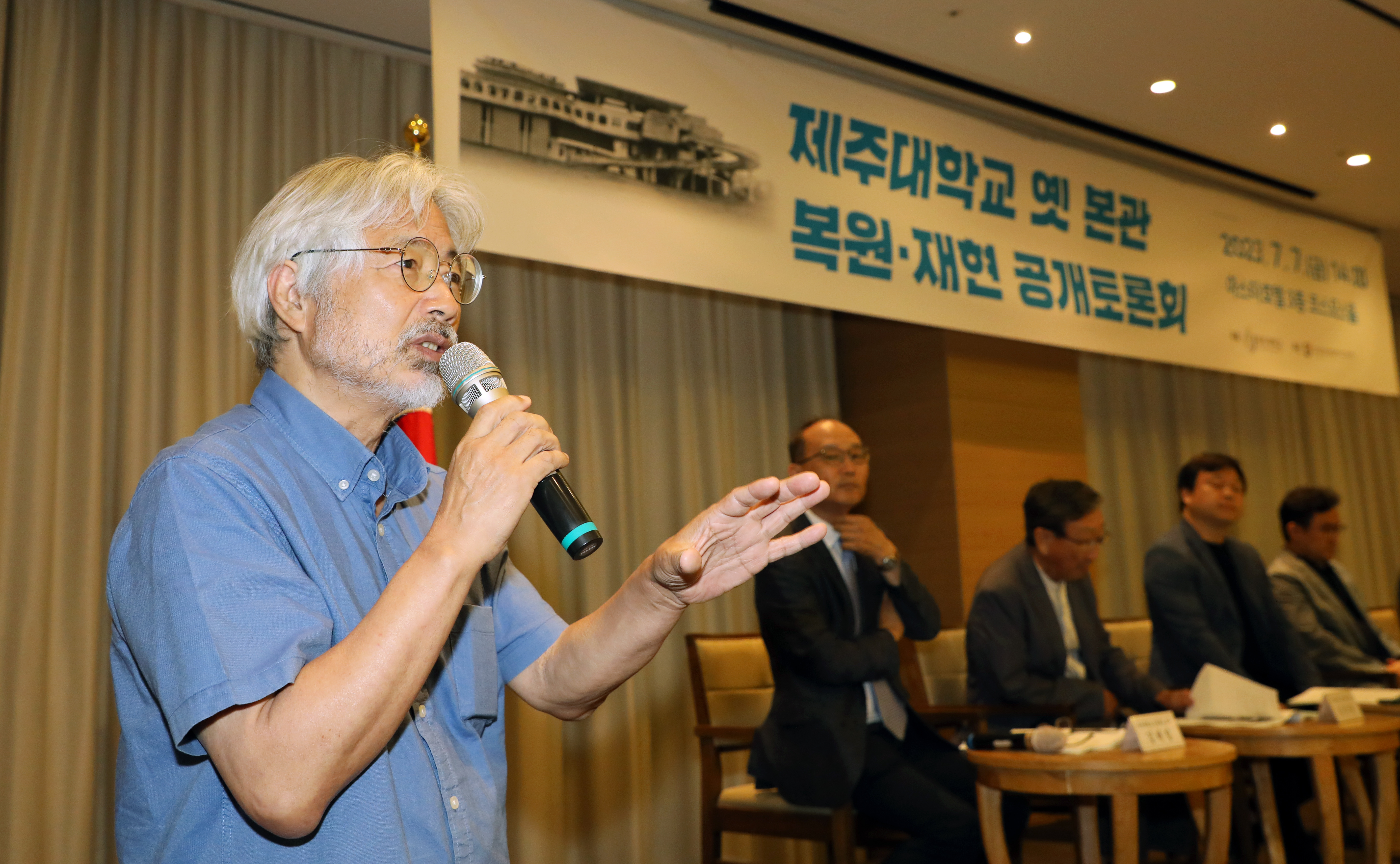 7월 7일 제주 아스타호텔에서 ‘제주대학교 옛 본관 복원·재현 공개토론회’가 열렸다. 이날 토론자들이 의견을 발표하고 있다. (왼쪽부터) 좌장을 맡은 김태일 제주대학교 건축학부 교수, 토론자 김석윤 건축사(건축사사무소 김건축), 김정현 홍익대학교 건축학부 교수, 박경택 한국건축가협회 제주건축가회 부회장, 이주연 건축평론가, 정다영 국립현대미술관 학예연구사